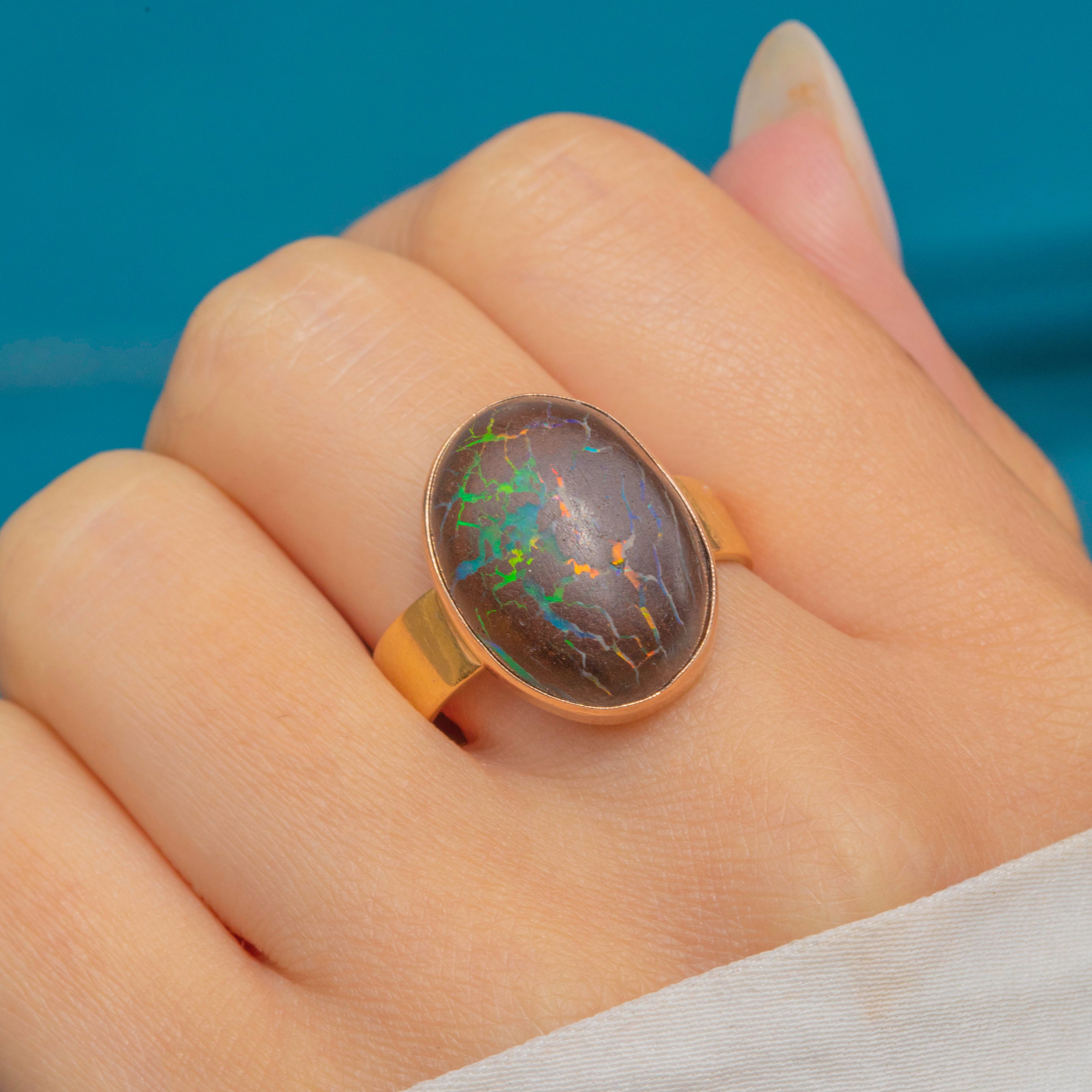 This vintage Boulder Opal ring is a beauty to behold! The smoothly cut Boulder Opal is mesmerising to look at, with electric blue, zingy greens, and pink hues peeking through her mahogany-toned surface.