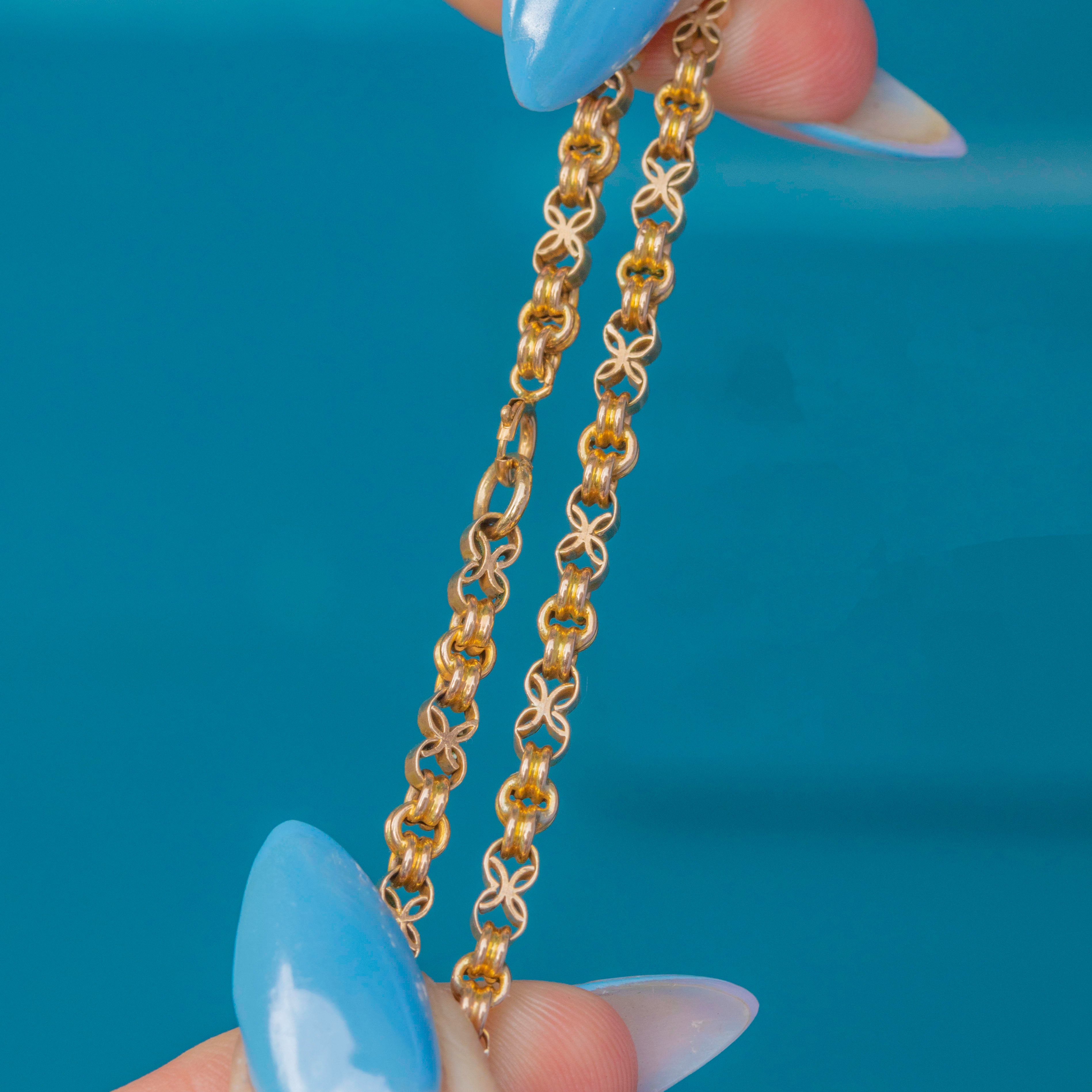 This Victorian chain is crafted from rich 9ct Gold, with meticulously formed fancy links that catch the light beautifully as they drape elegantly across your collarbones.