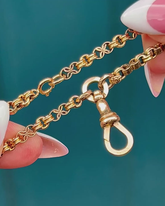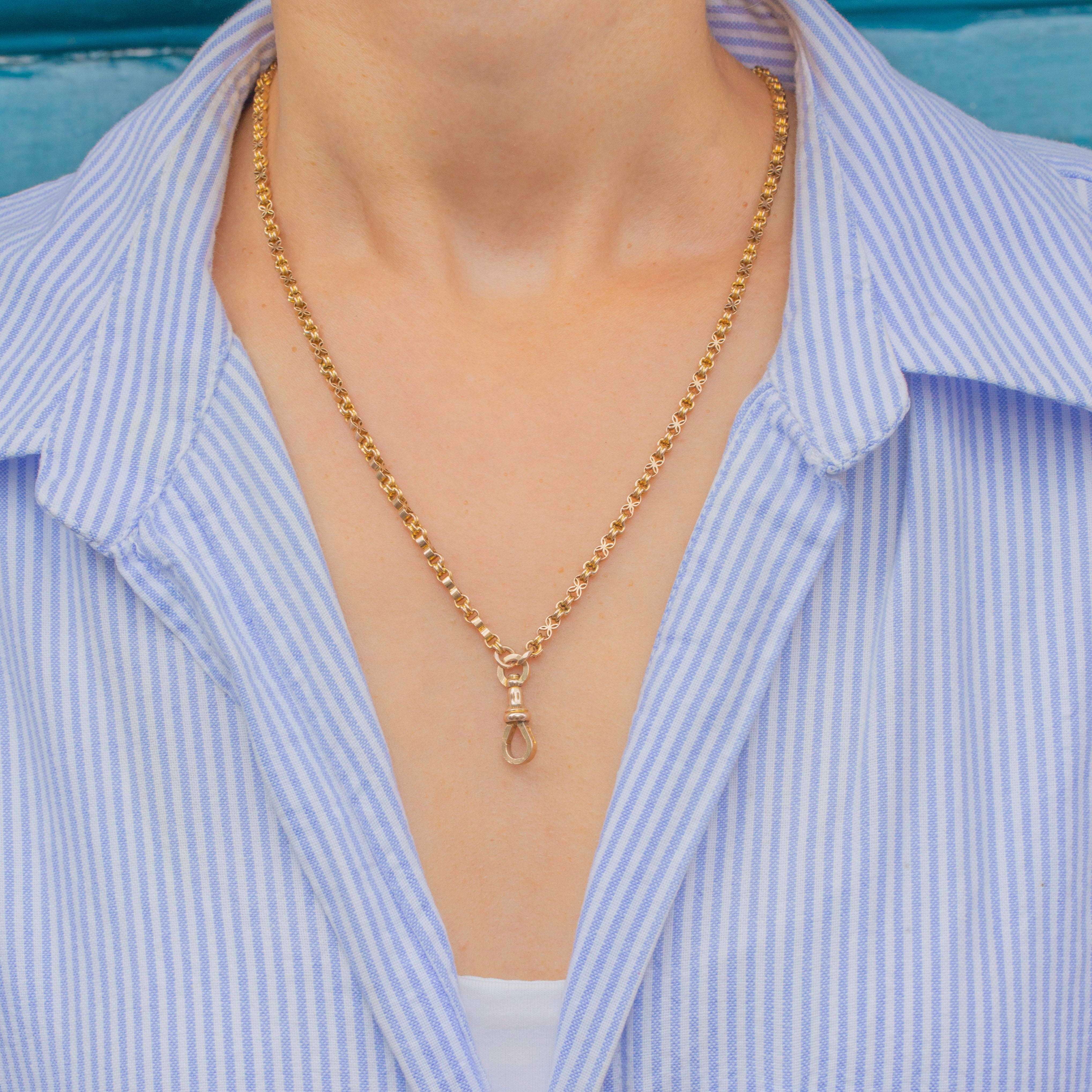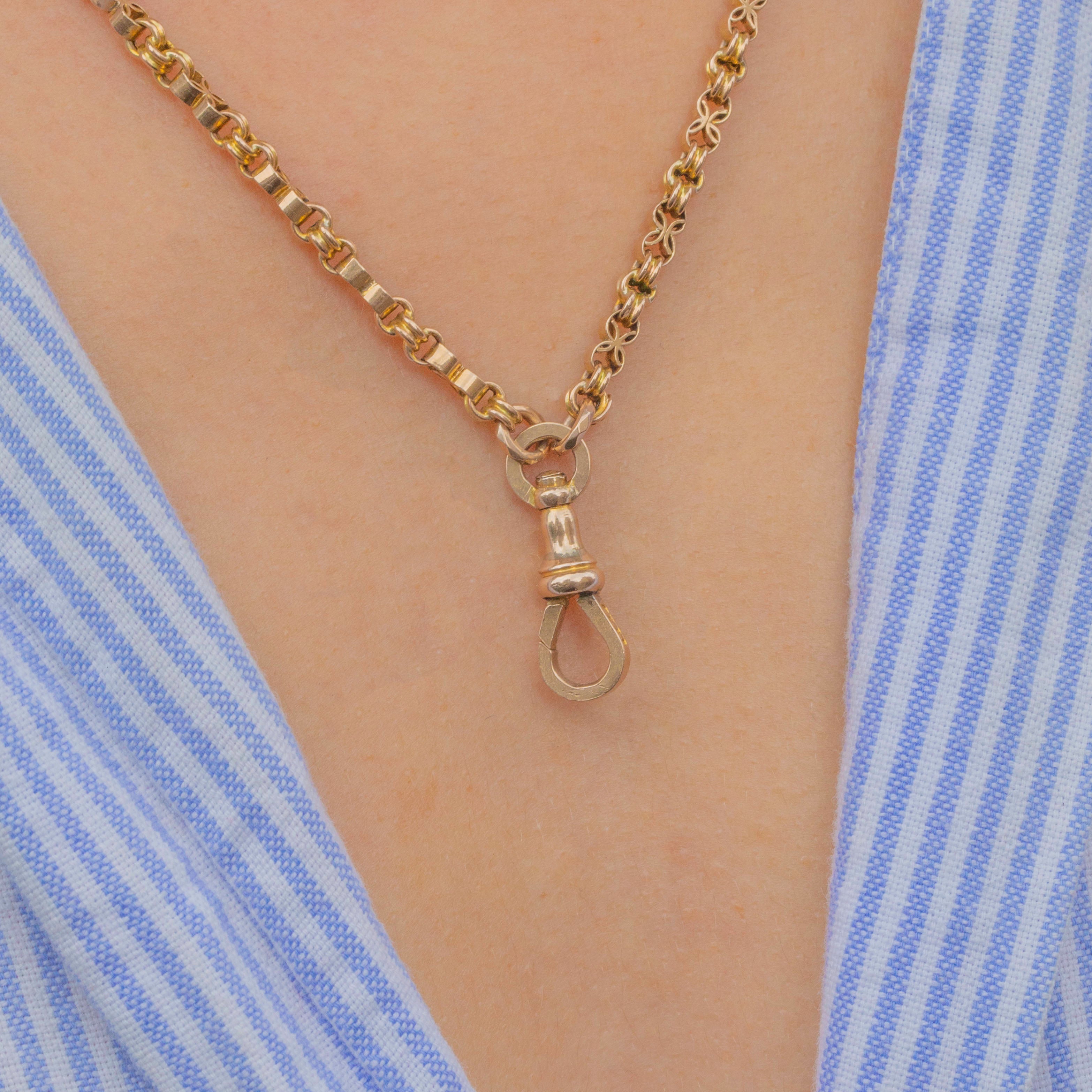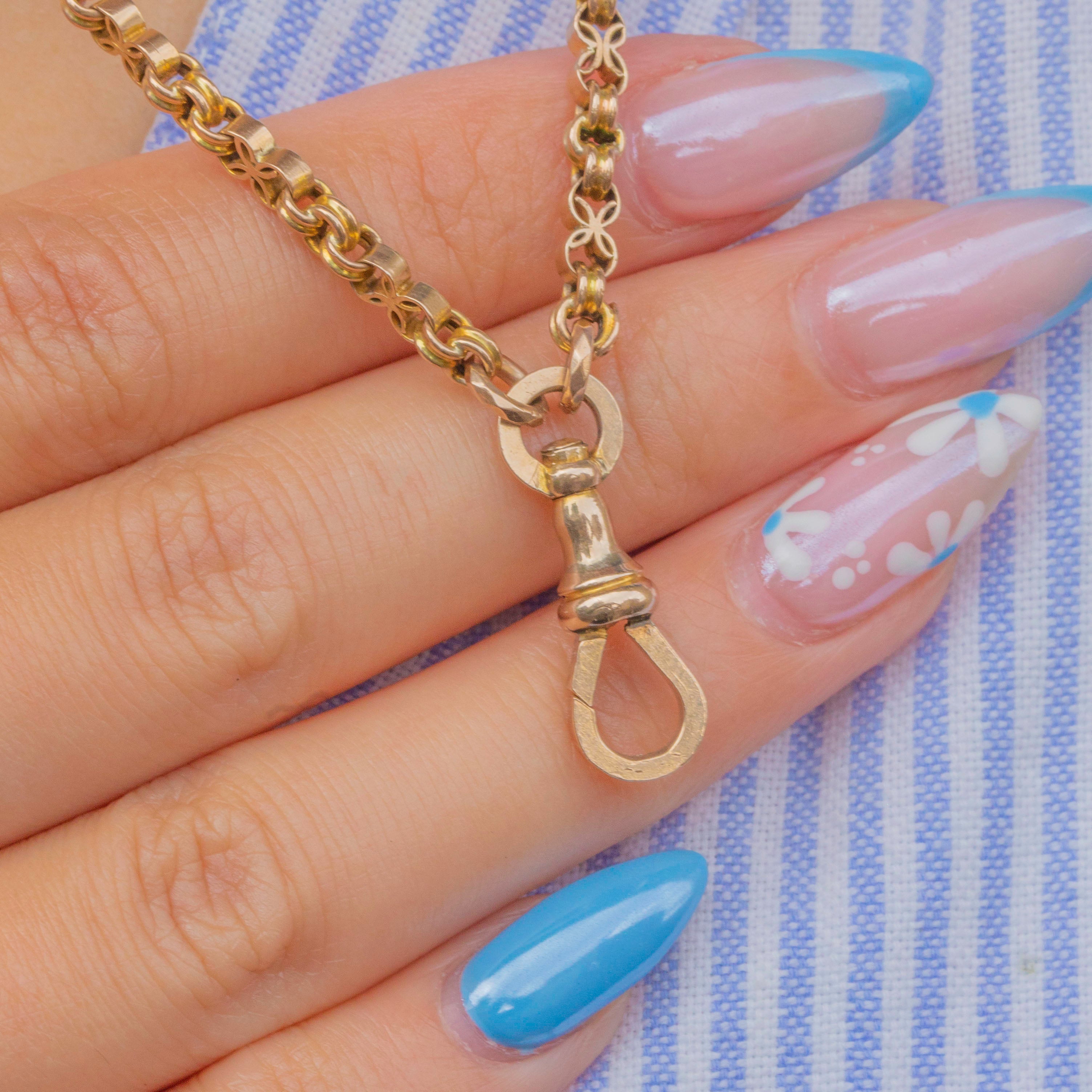 At 24" in length and complete with a highly sought-after fixed antique dog-clip charm holder, this Victorian fancy link chain is the perfect customisable piece for your collection.