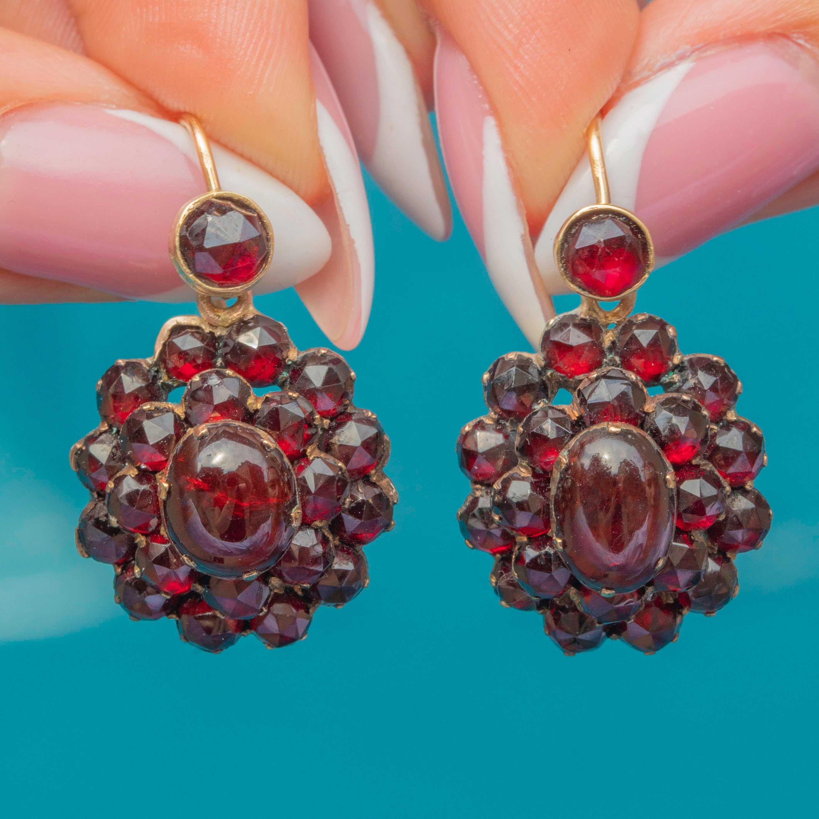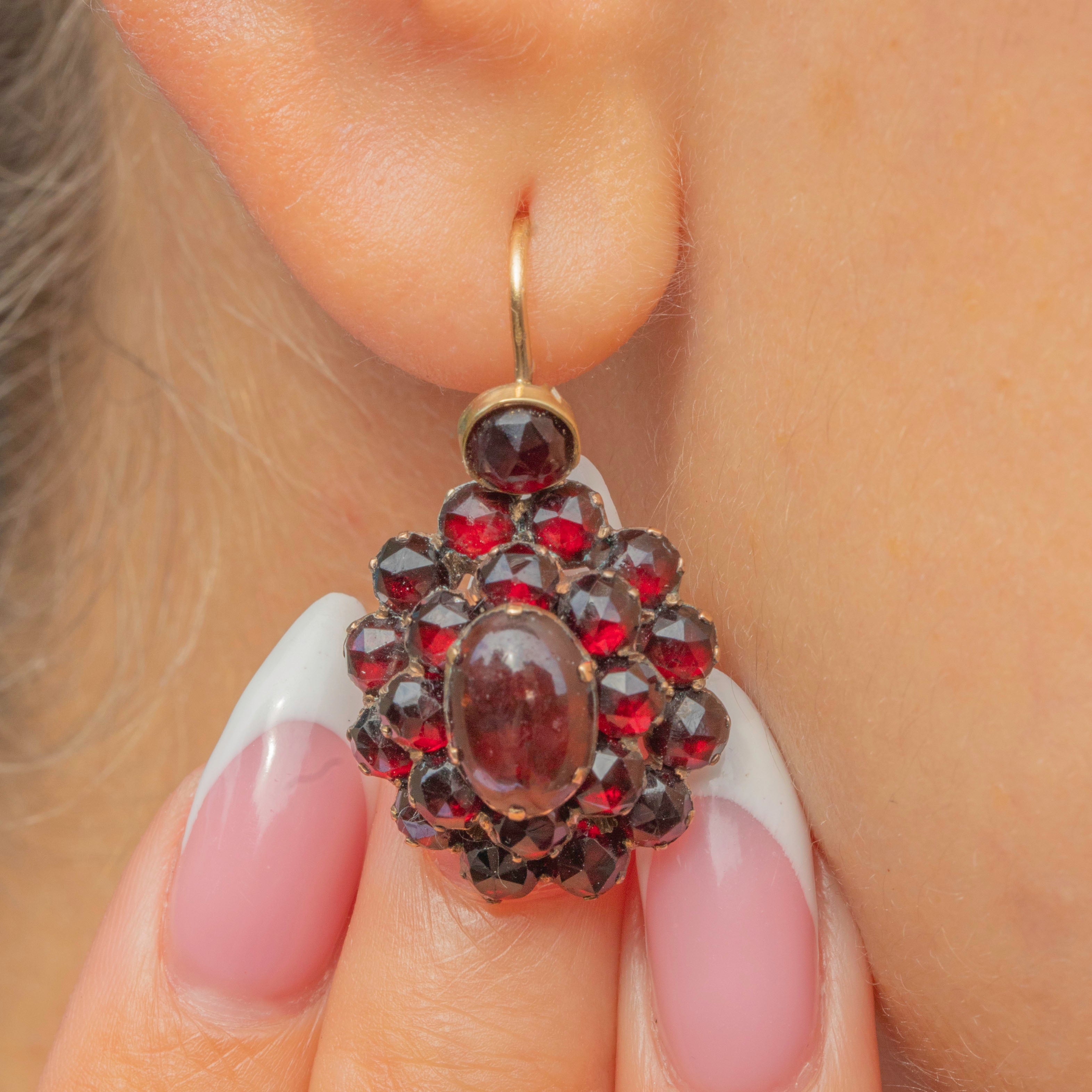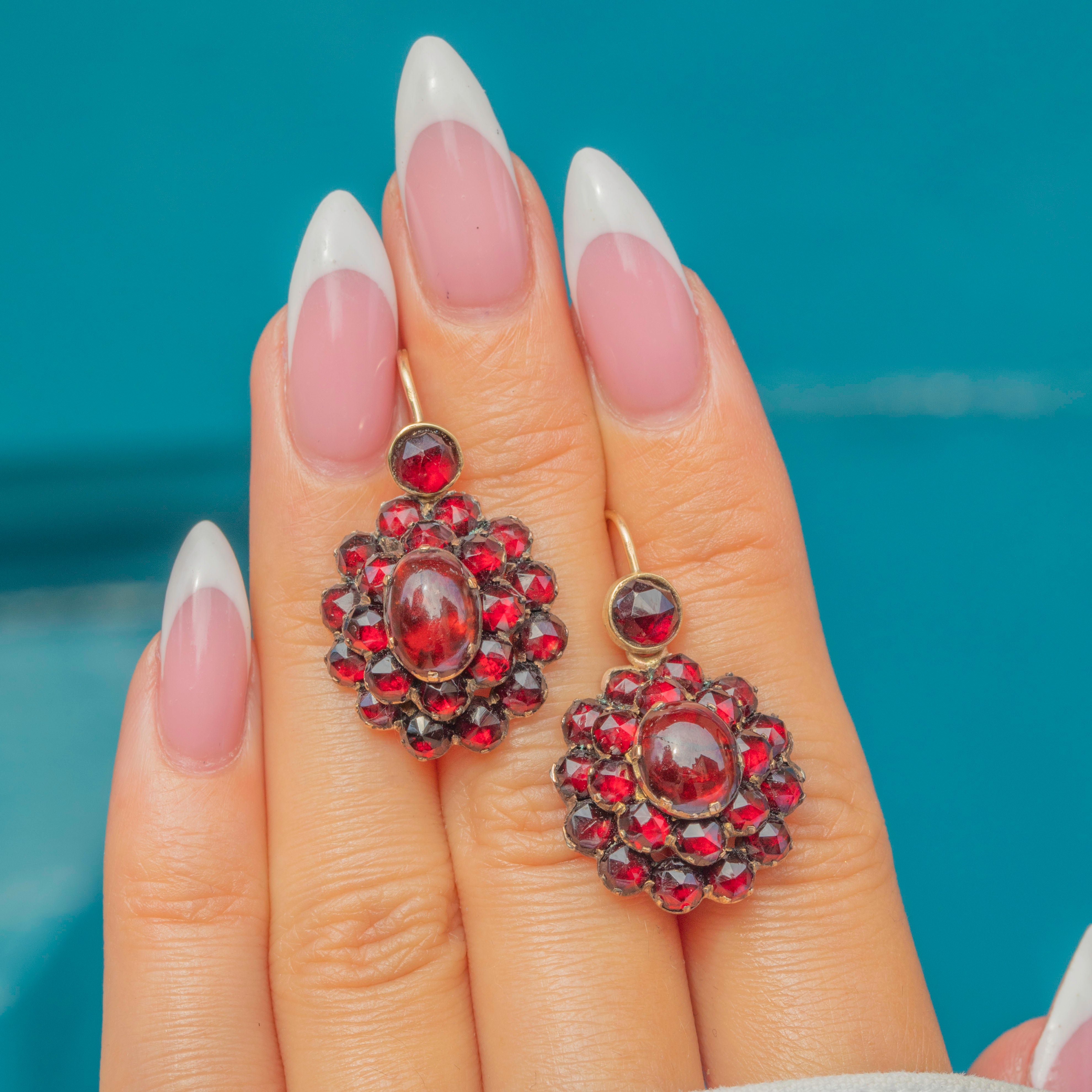 These striking Victorian earrings are crafted in 9ct Gold and set with deep, richly coloured Bohemian Garnets. Each earring features a central cabochon Garnet surrounded by a halo of glistening rose-cut stones, with a total estimated carat weight of approximately 5.00cts.