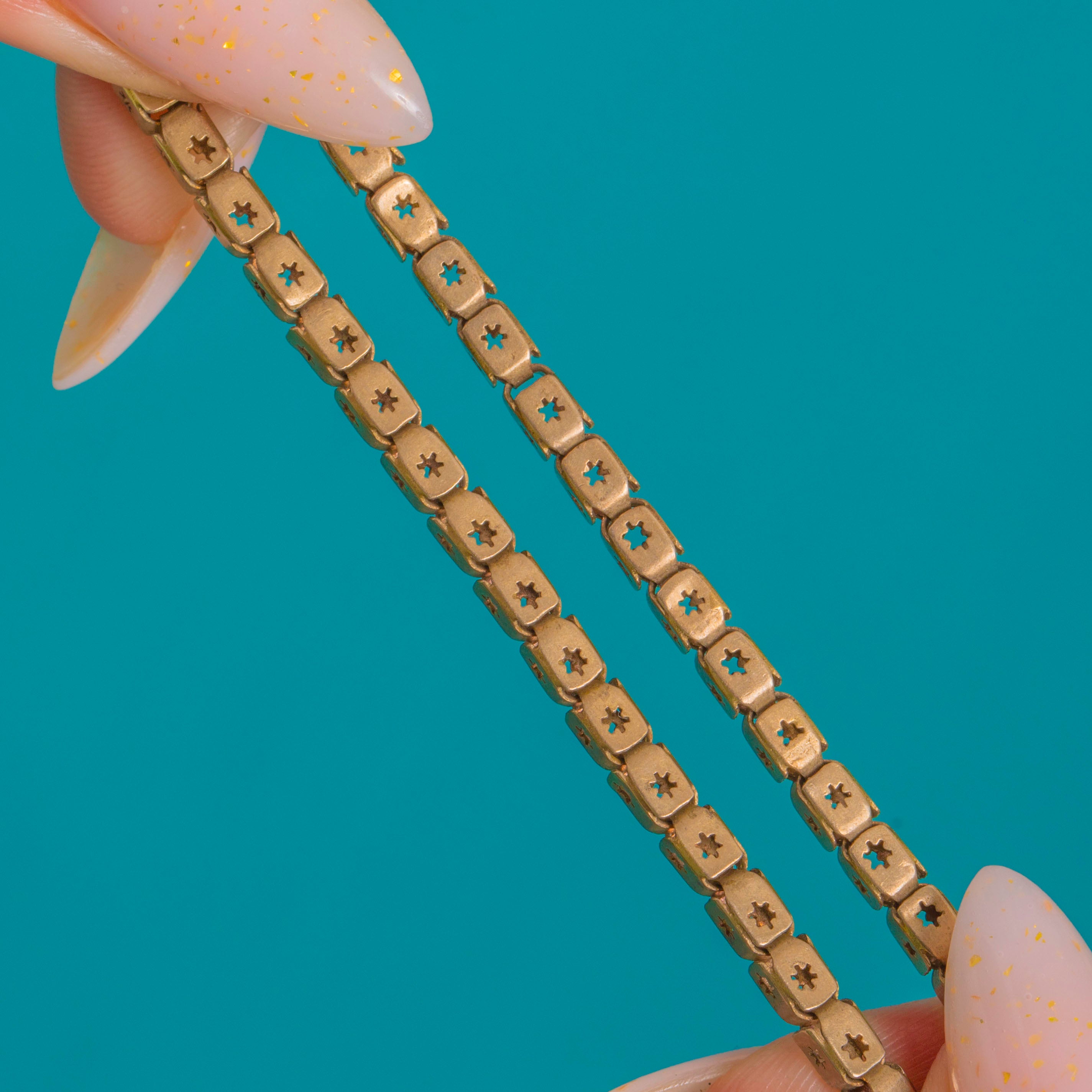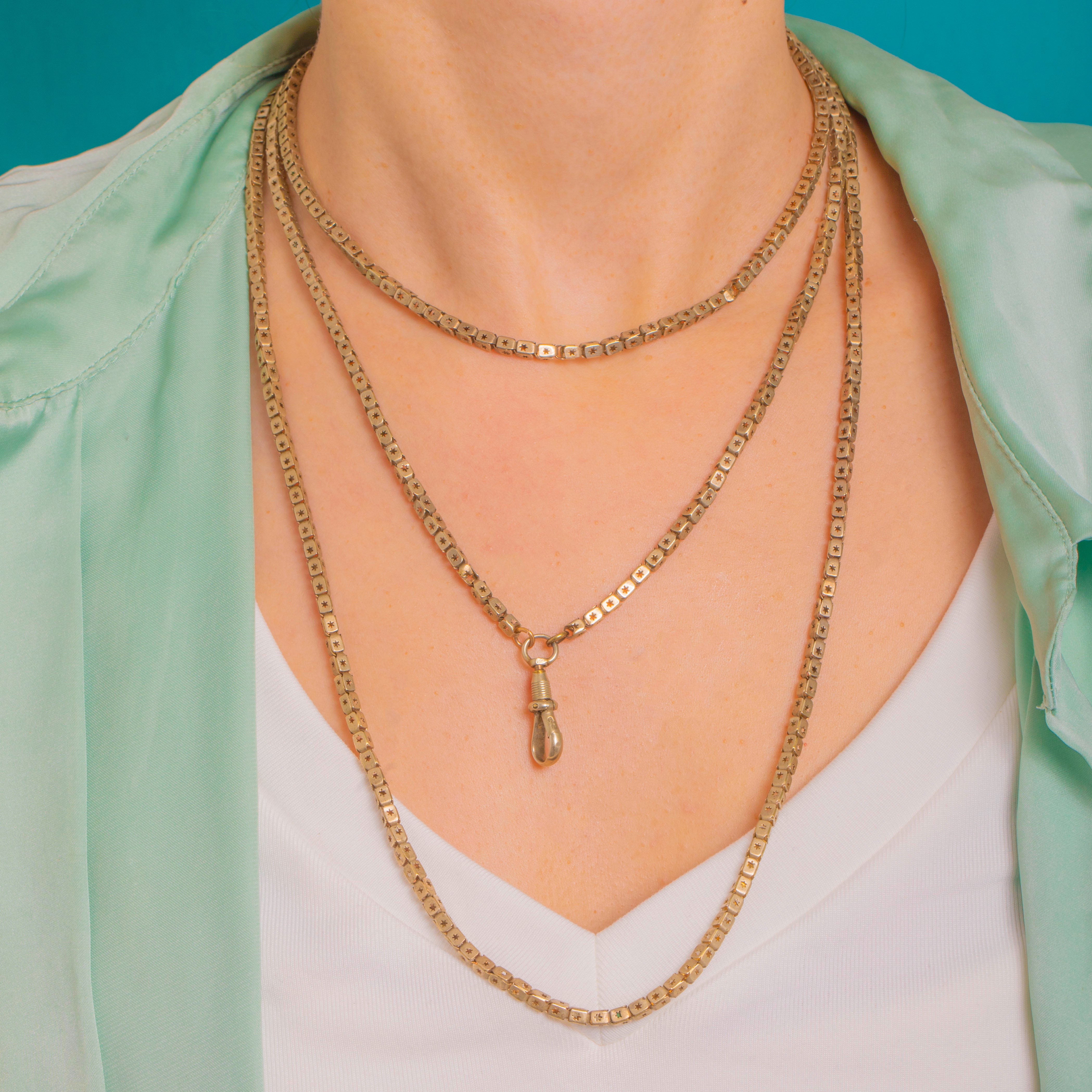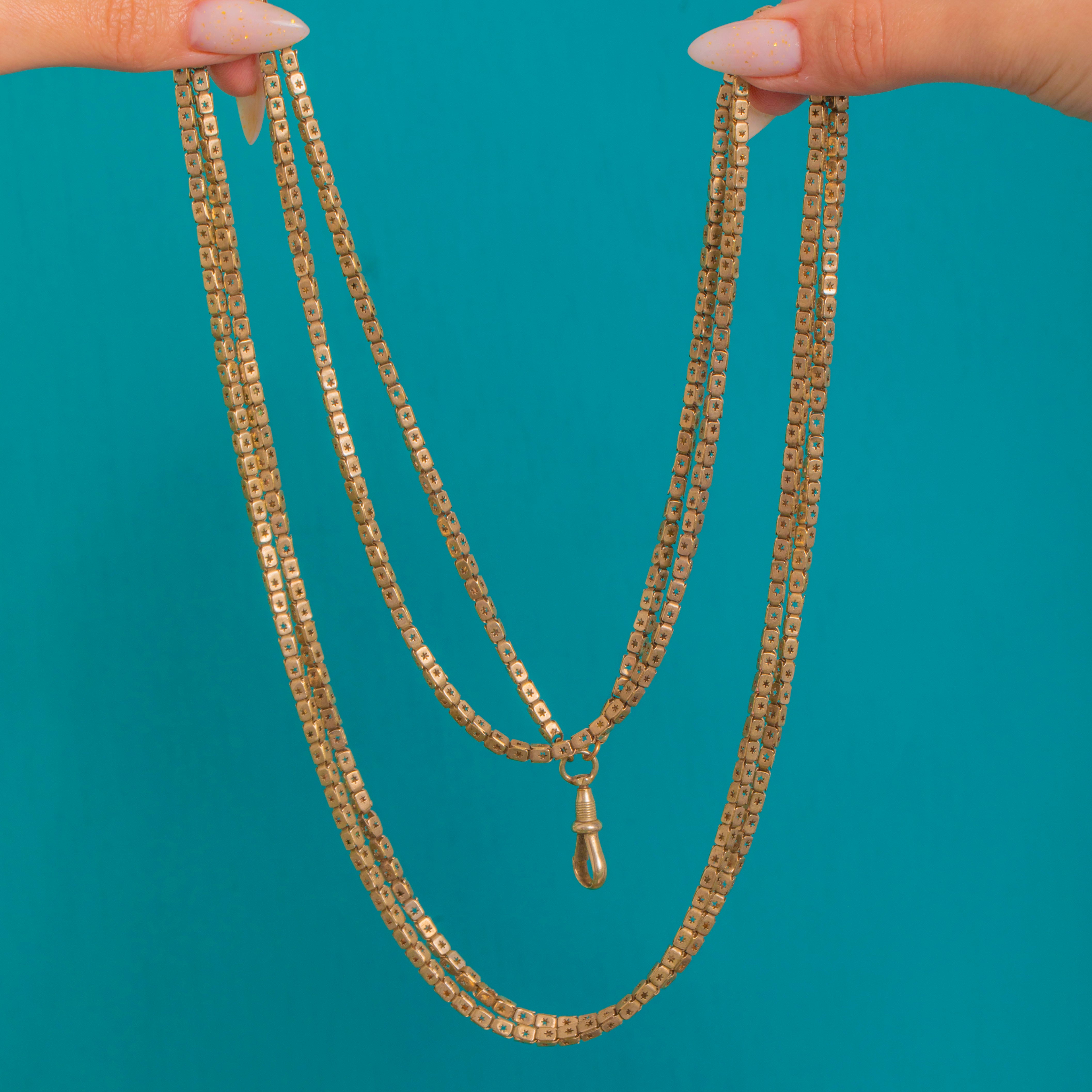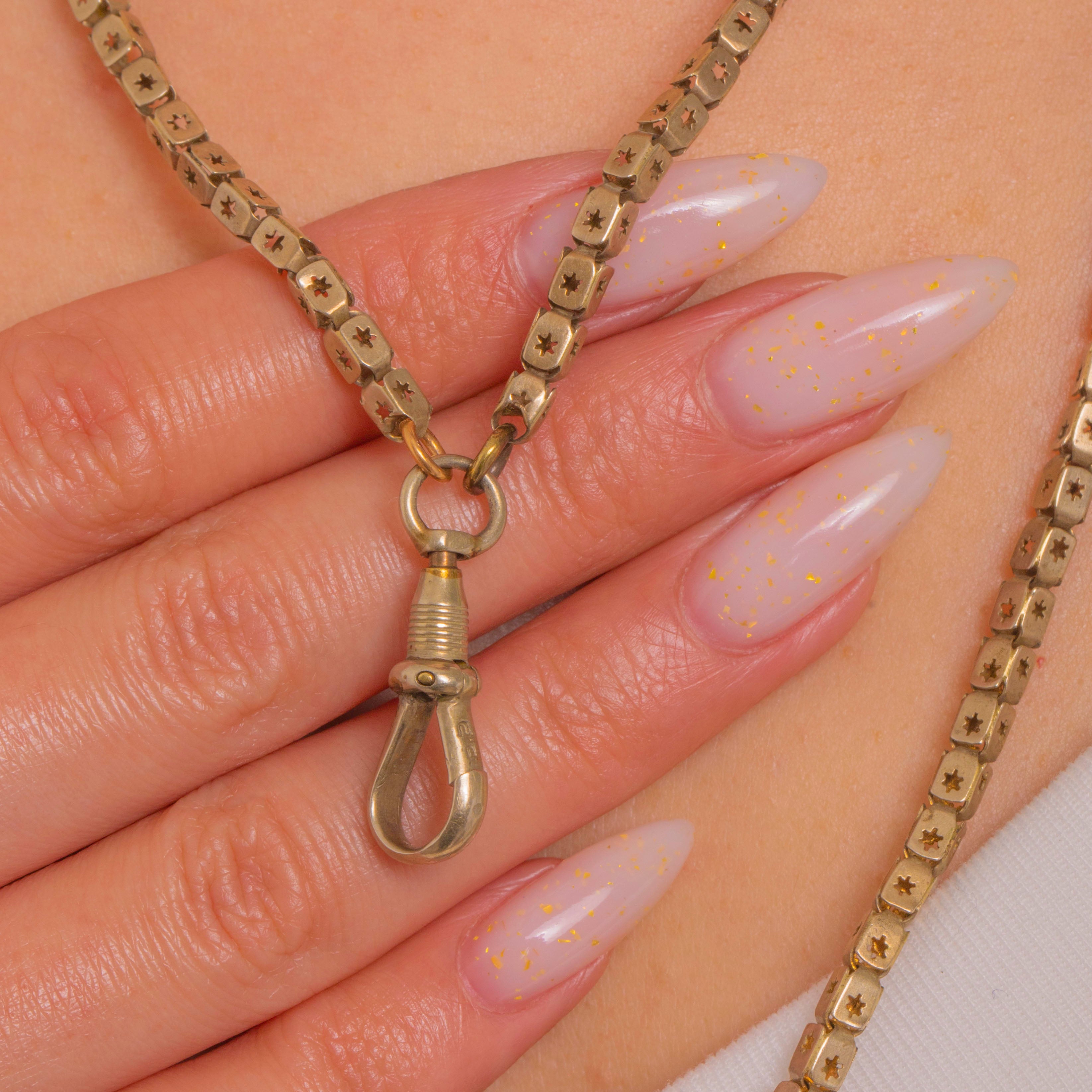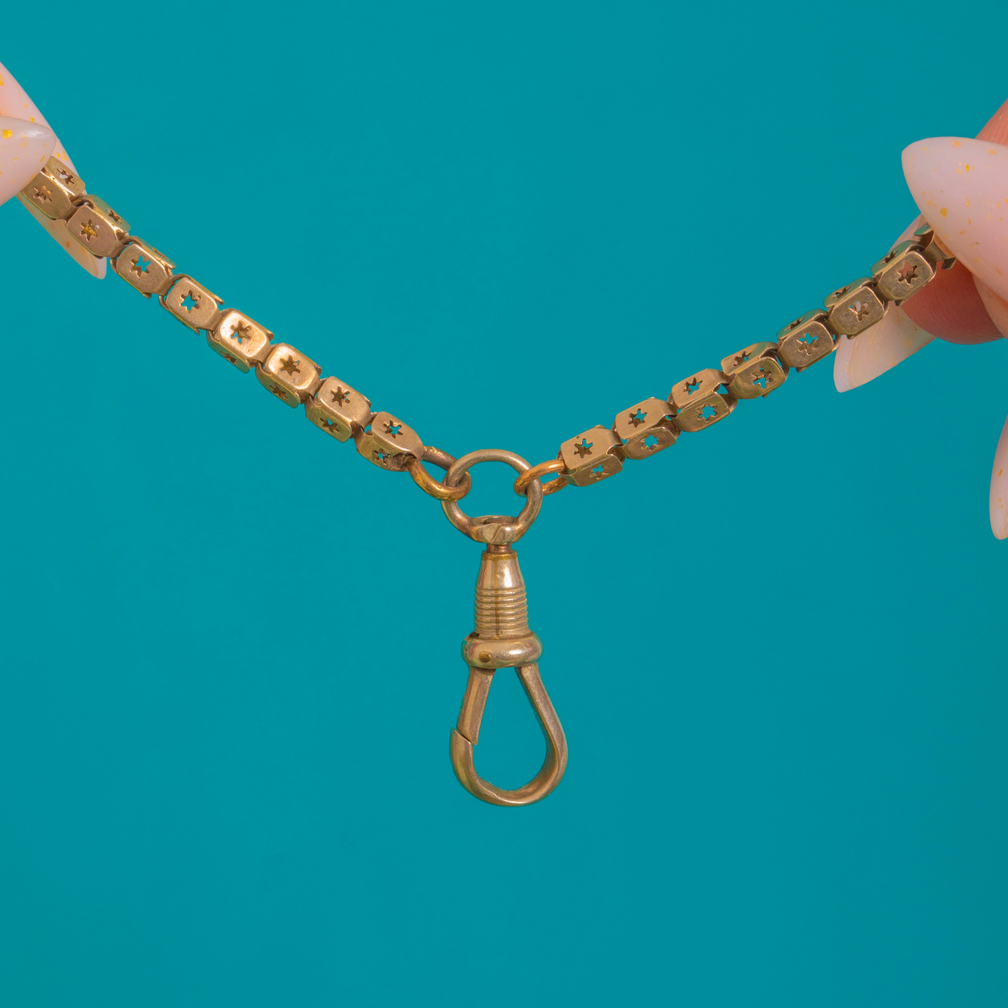A glorious Victorian longguard with a celestial twist, this Gold-cased chain is composed of supple box links, each side pierced with a crisp eight-point star. The flat, ribbon-like construction gives it a refined, architectural feel, while the warm antique patina softens the geometry beautifully.