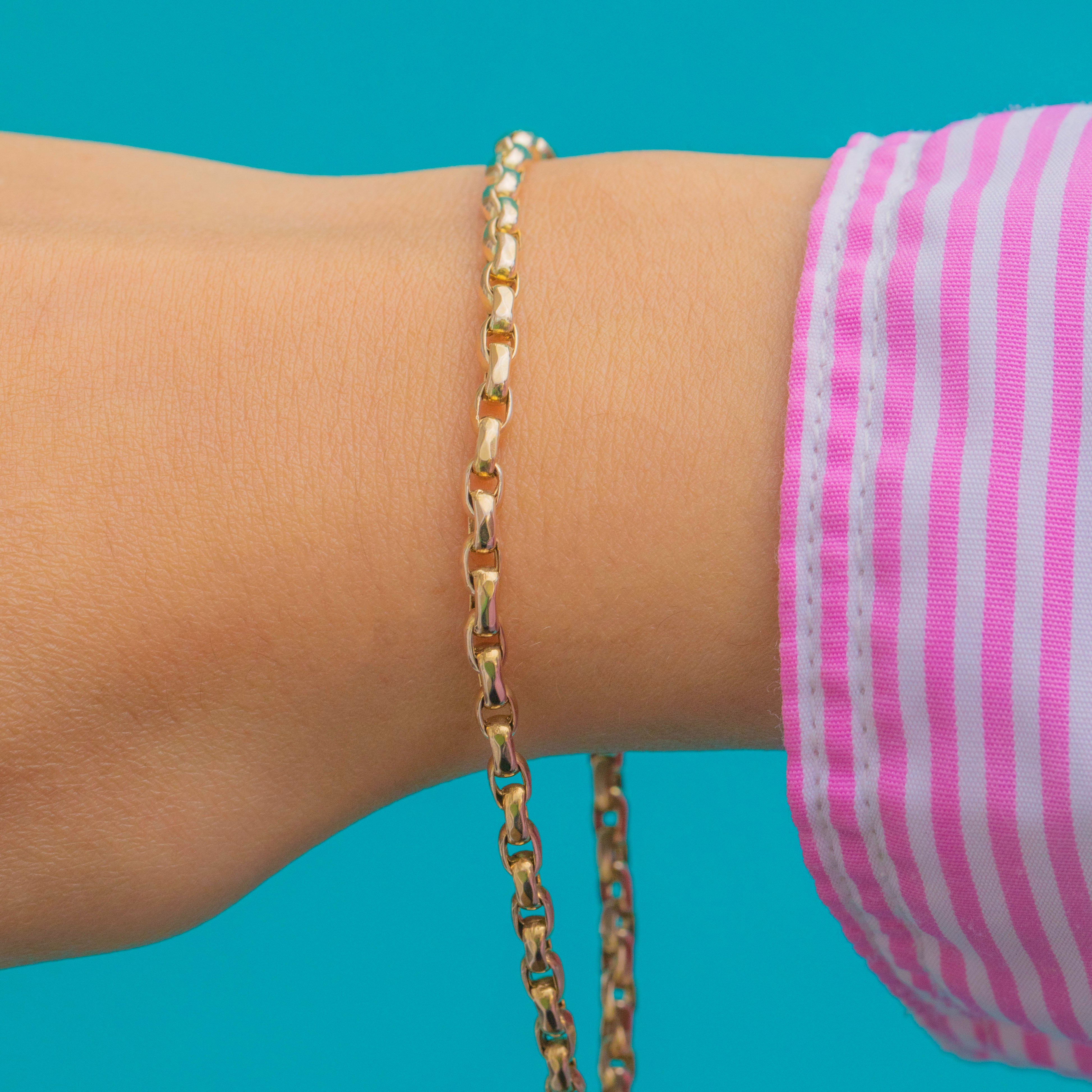 A classic Victorian belcher bracelet with softly rounded links and a traditional bolt-ring clasp. The timeless design and warm antique glow make it perfect for everyday wear or for layering with other antique chains and bracelets.