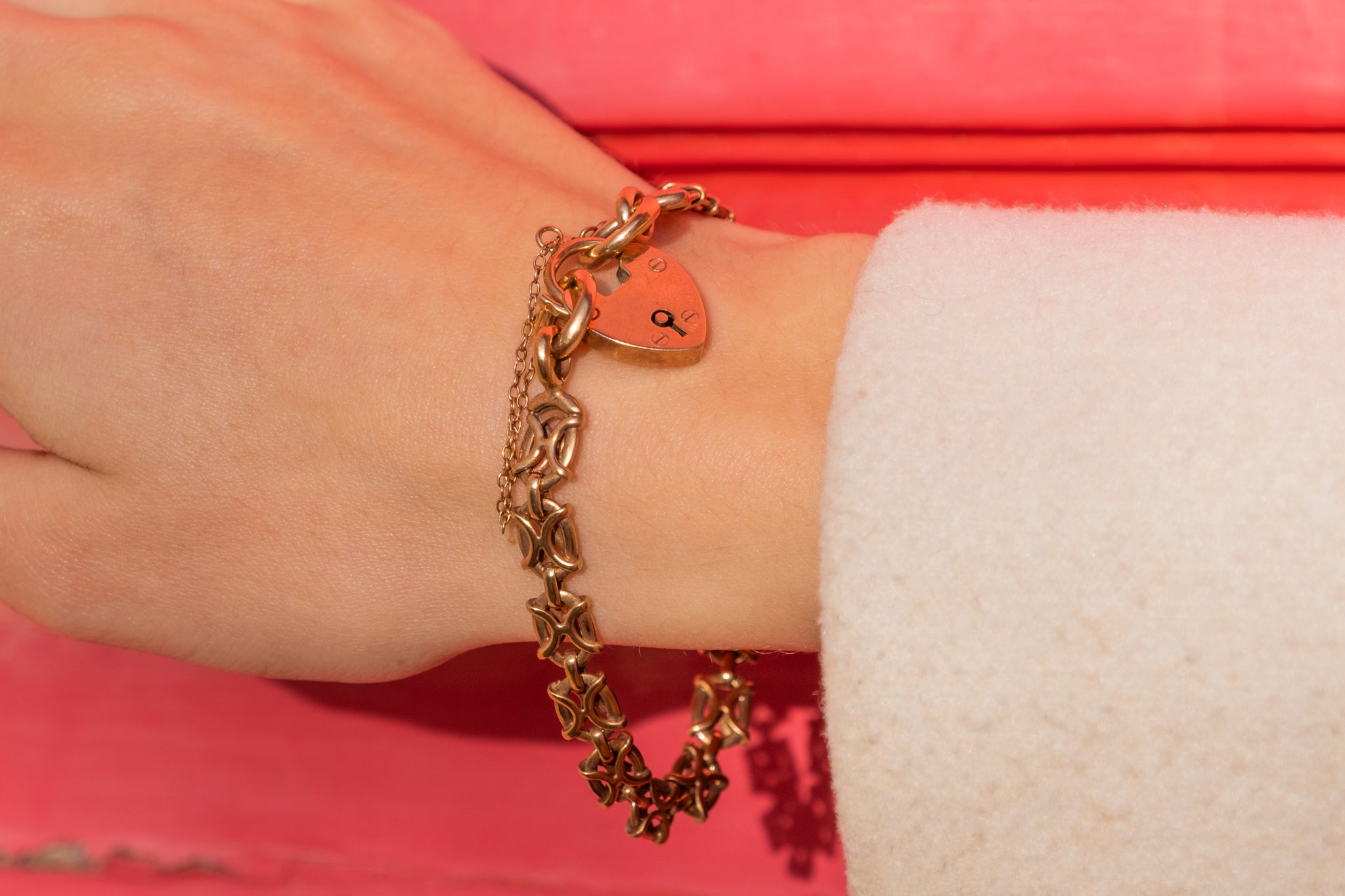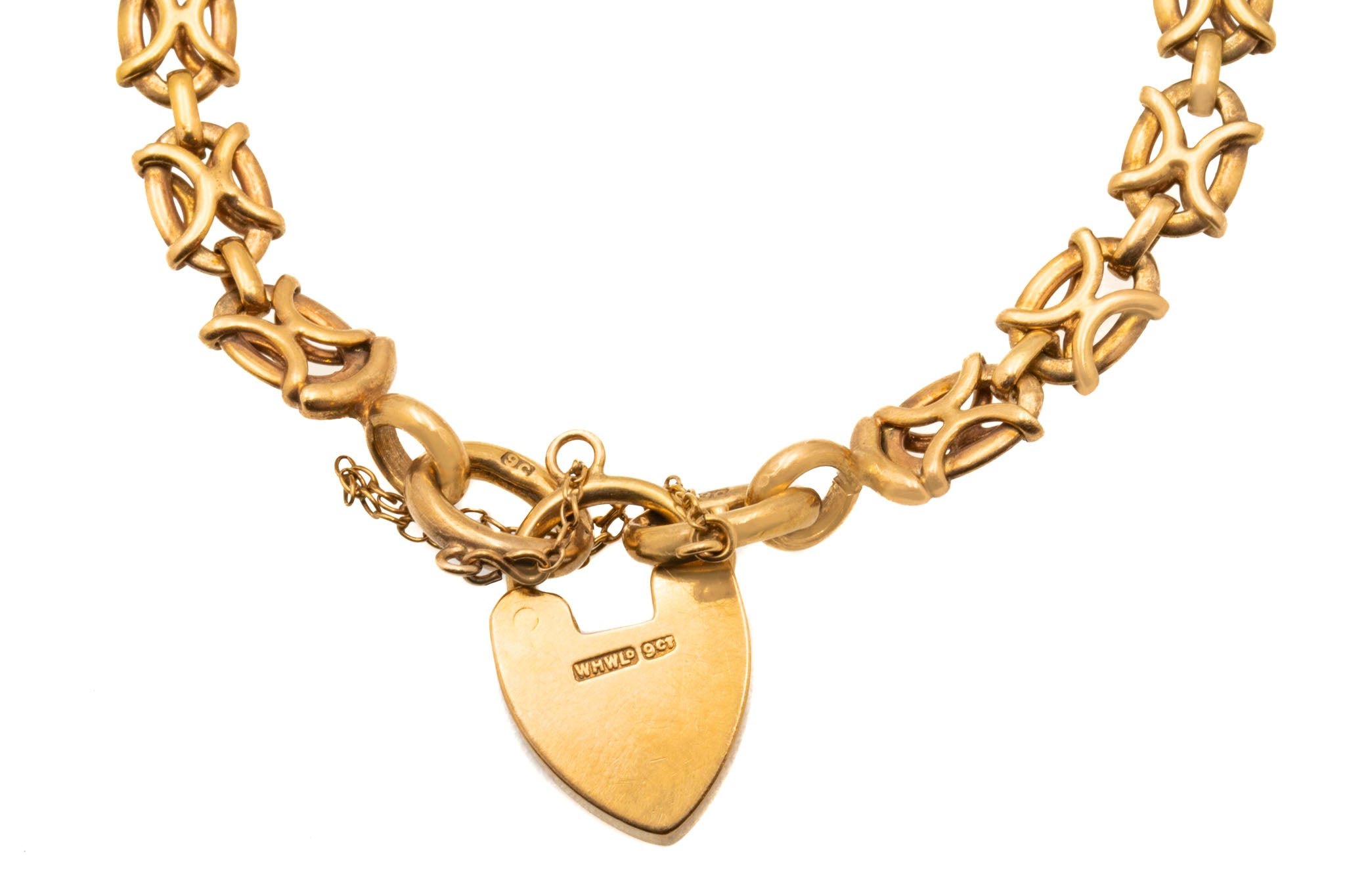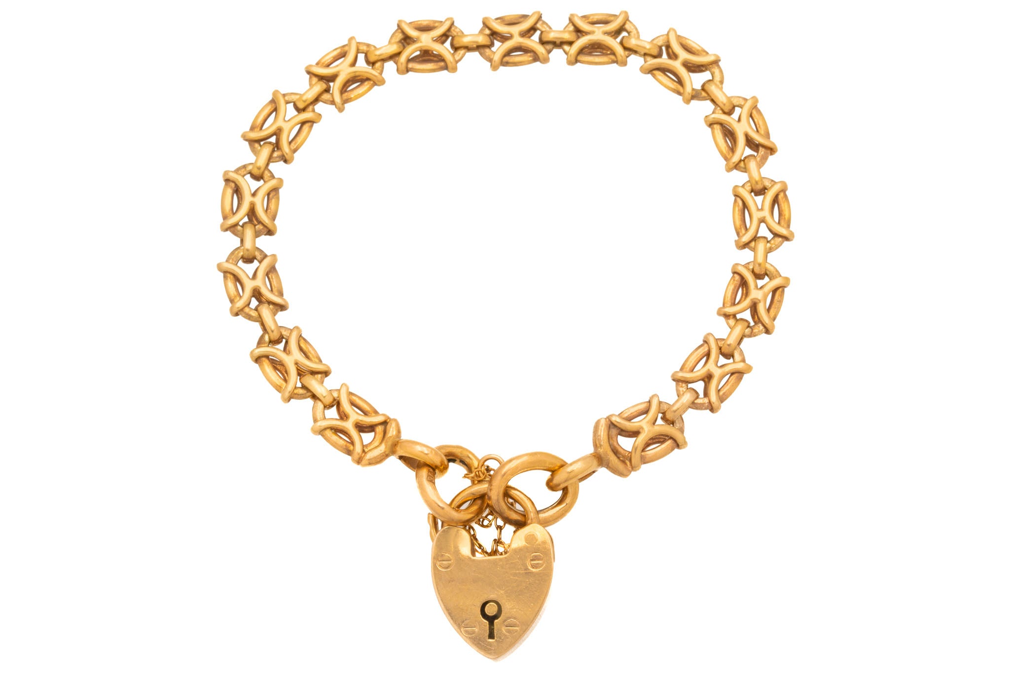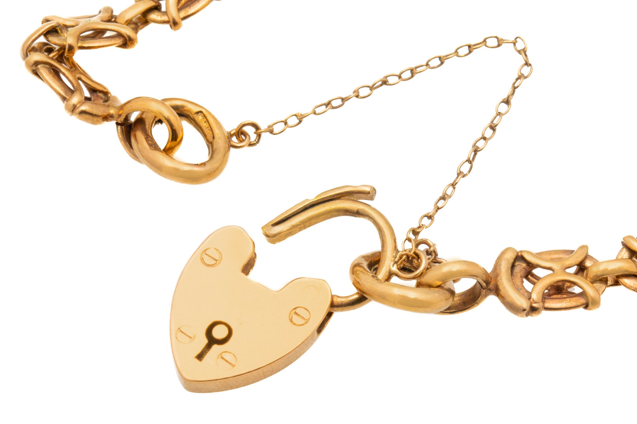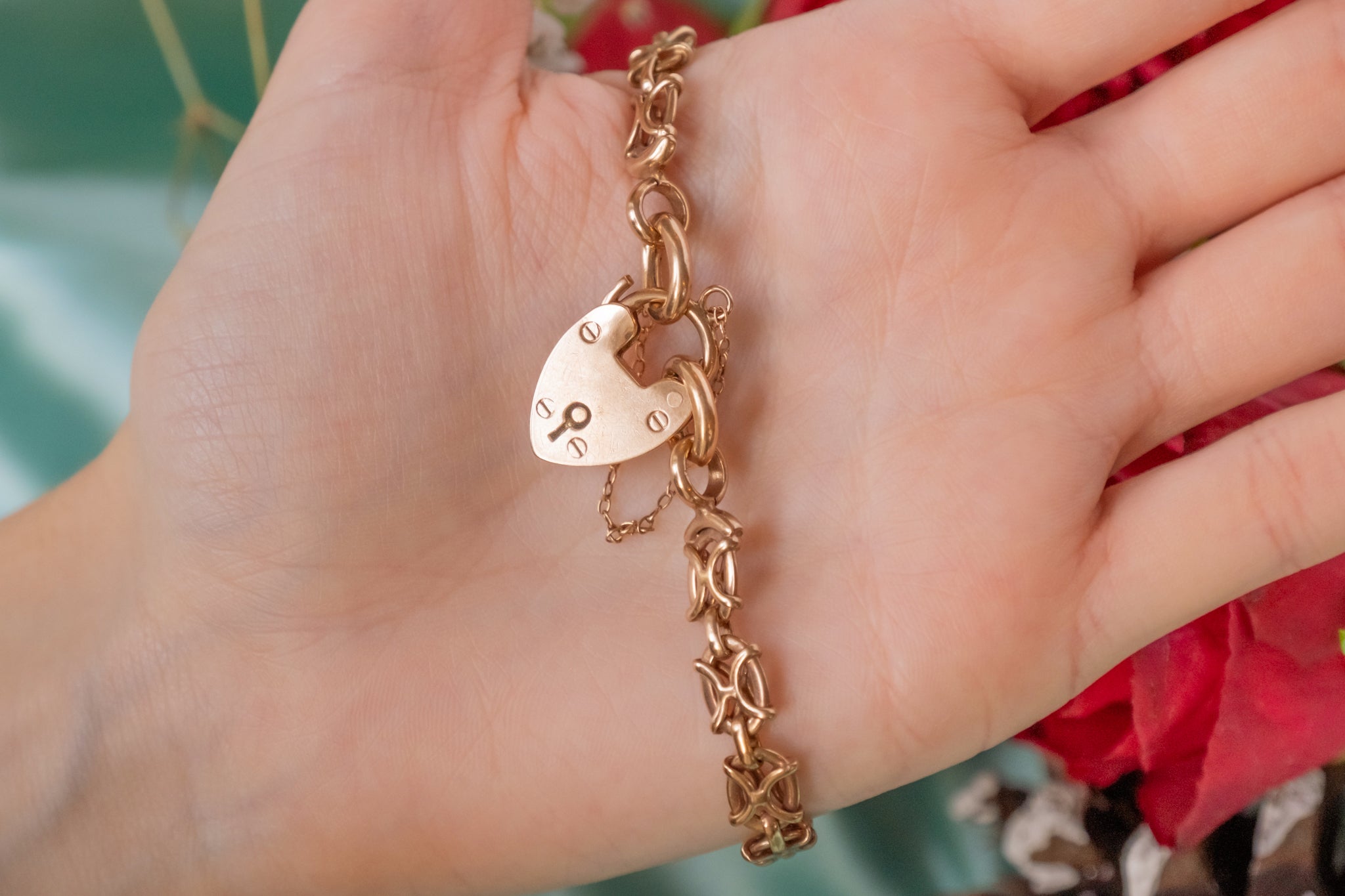 7" Antique 9ct Gold Gate Bracelet with Heart Padlock, 14.5g
