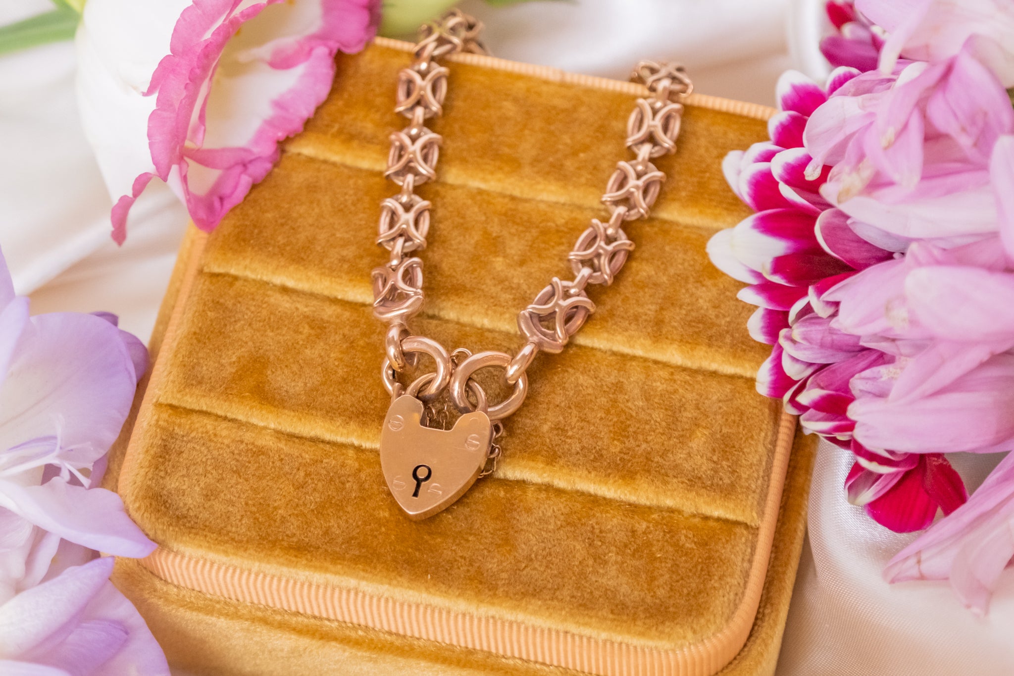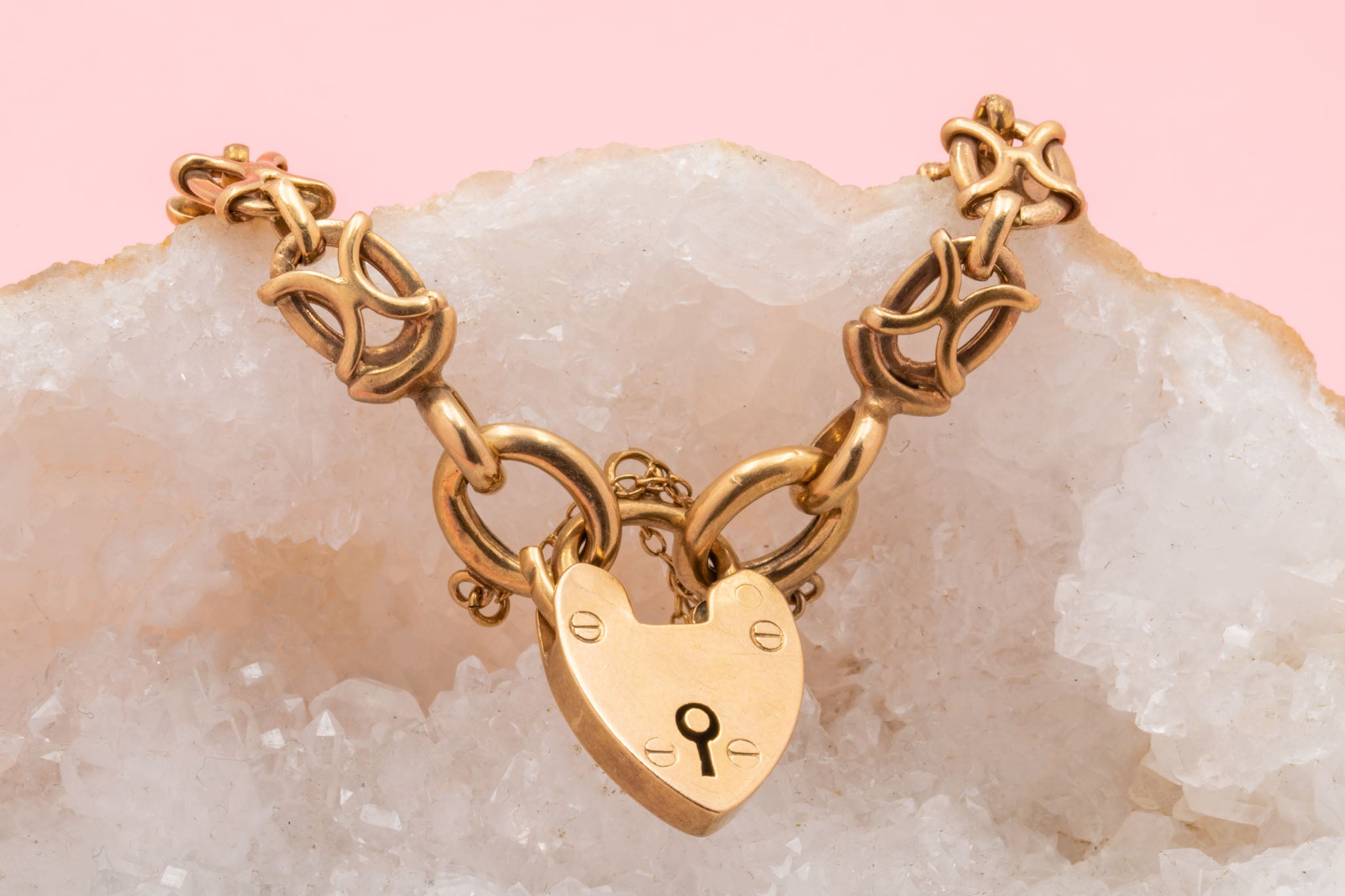 We adore this antique 9ct Gold bracelet, complete with a cute heart padlock! This timeless 9ct Gold nugget of goodness has a wonderfully saturated hue and a unique set of links which caress the wrist like a dream.