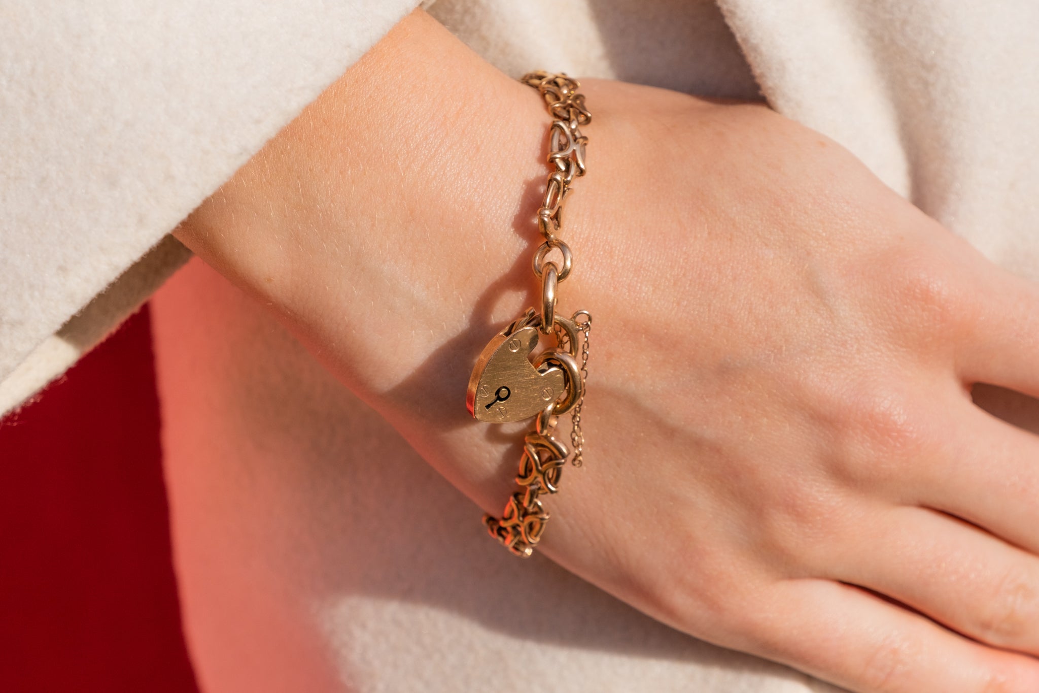 This  Victorian Gold bracelet seals with a heart padlock, and historically only one's lover would have the key to open the heart upon their return from a travel afar - how romantic! We love the way this piece looks against the skin and is sure to look fabulous as part of a wrist stack.