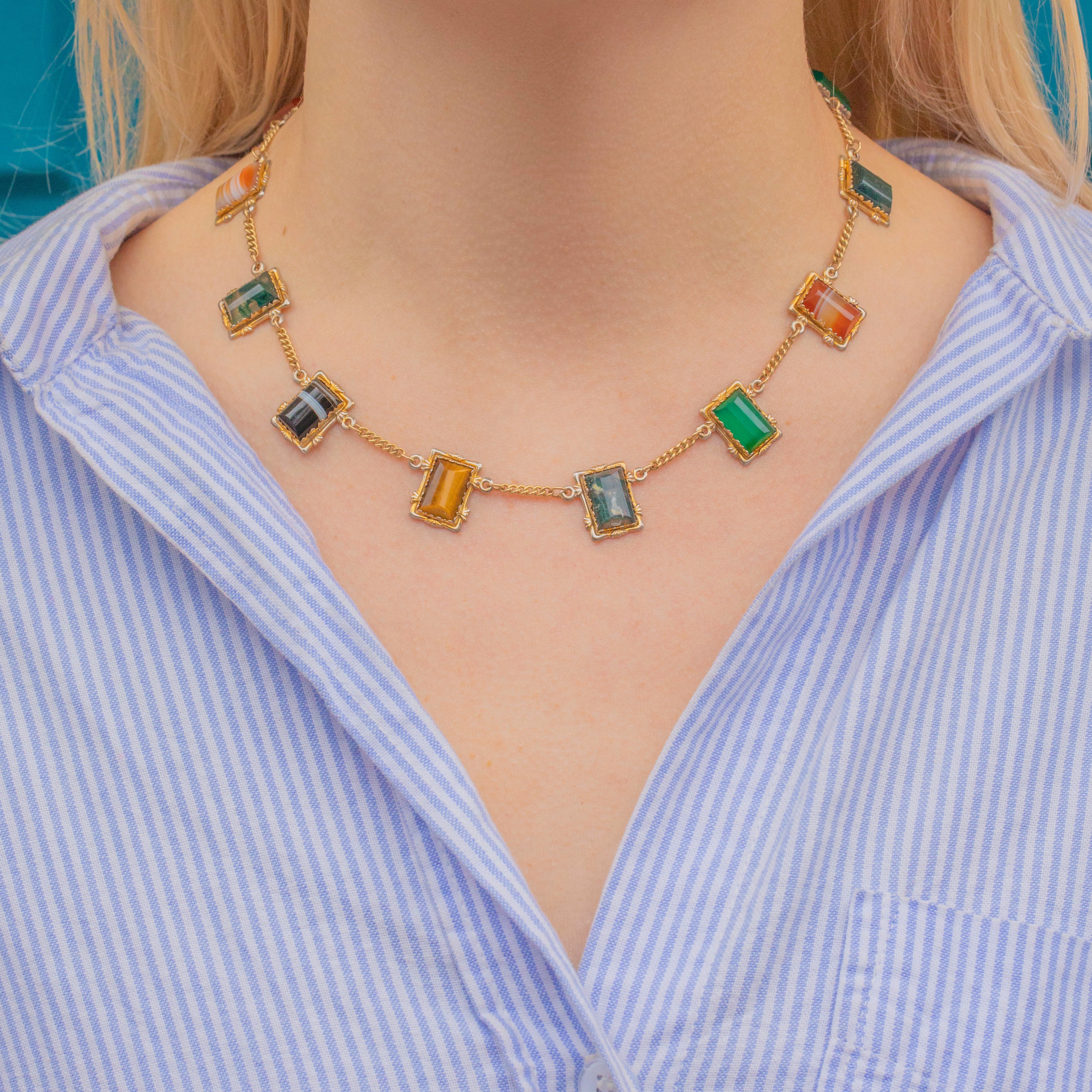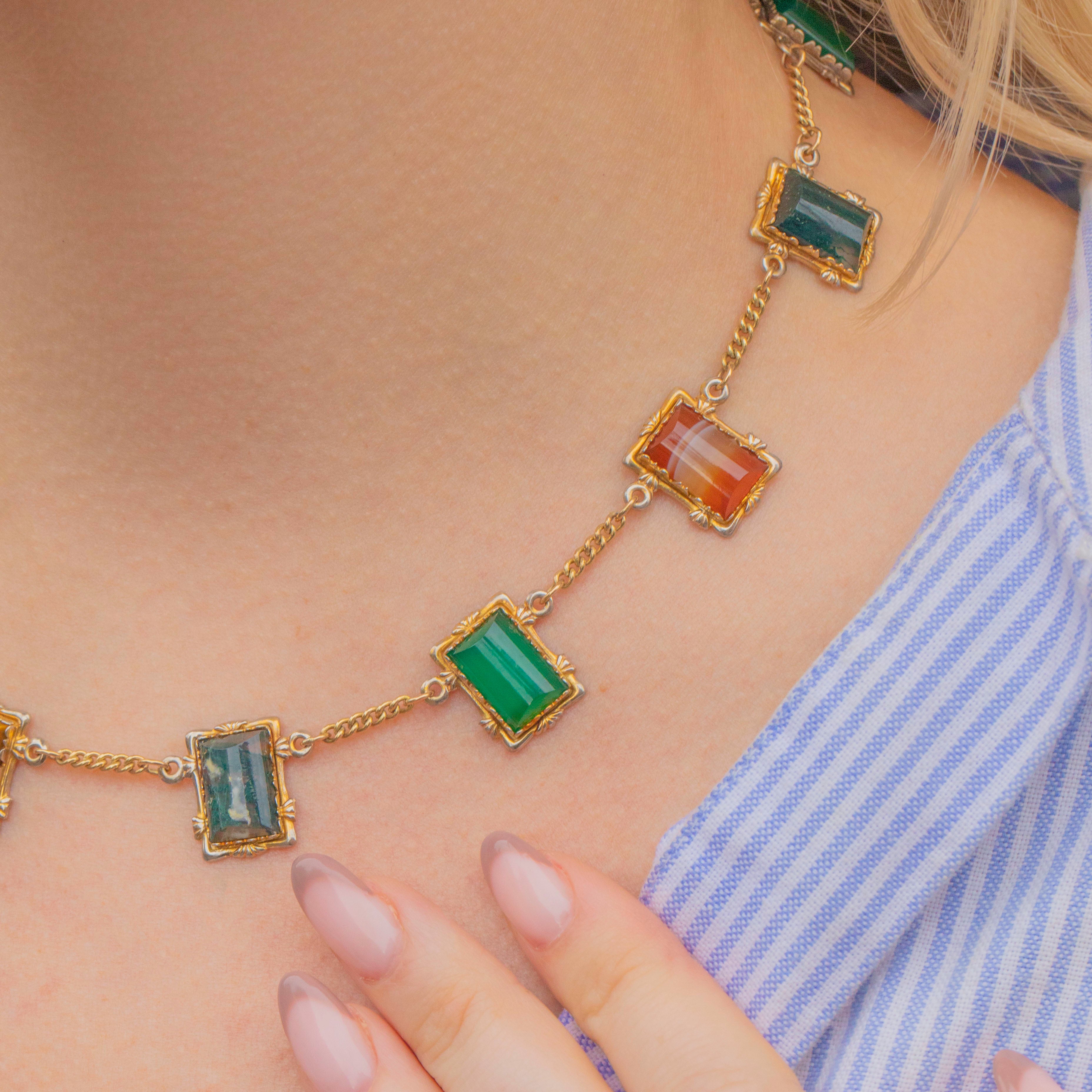 EXCELLENT. This 9ct Gold Agate fringe necklace is in excellent condition. The Agate stones are vibrant and rich, free from scuffs or chips. The Gold is buttery and the curb links neatly connected and robust, promising confident wear!