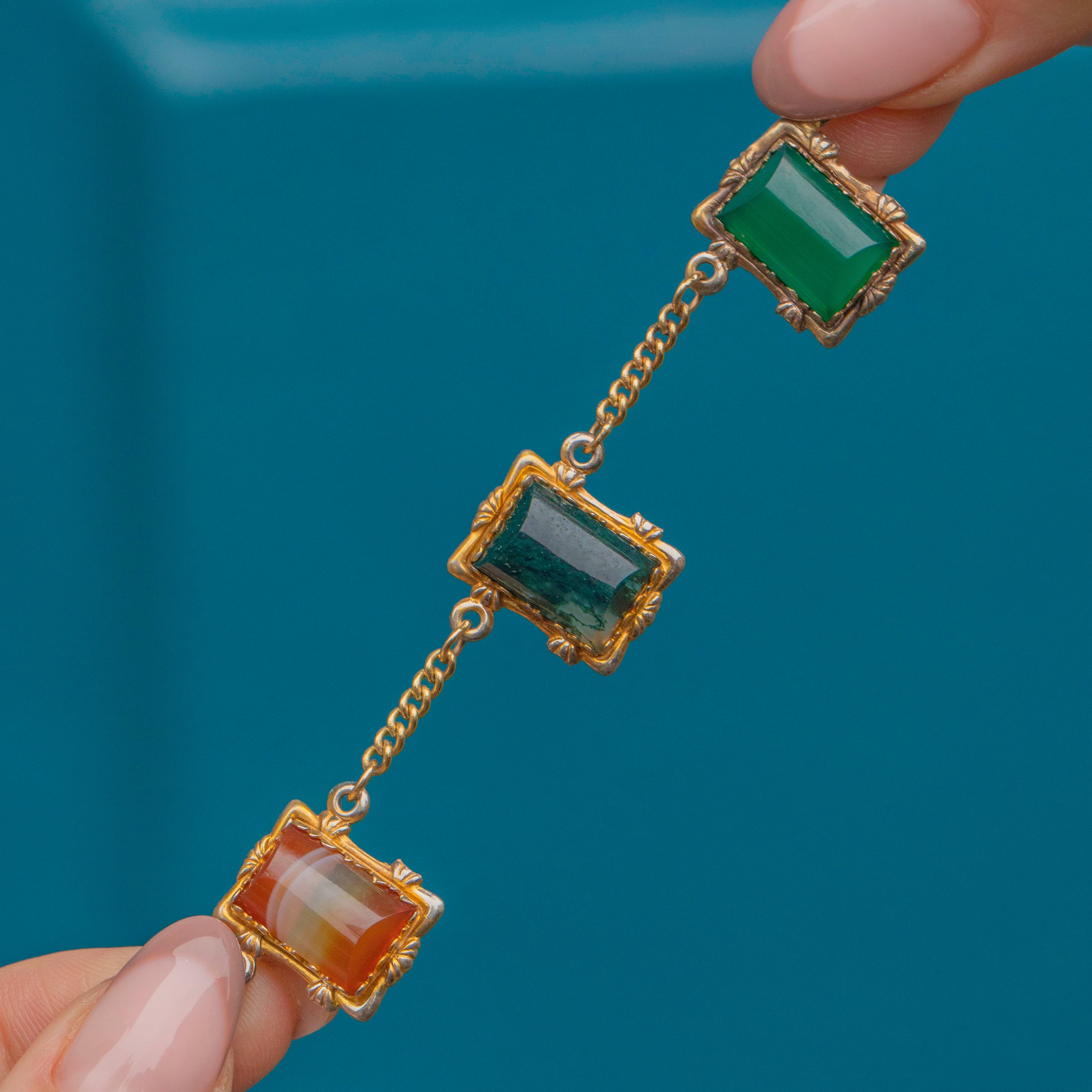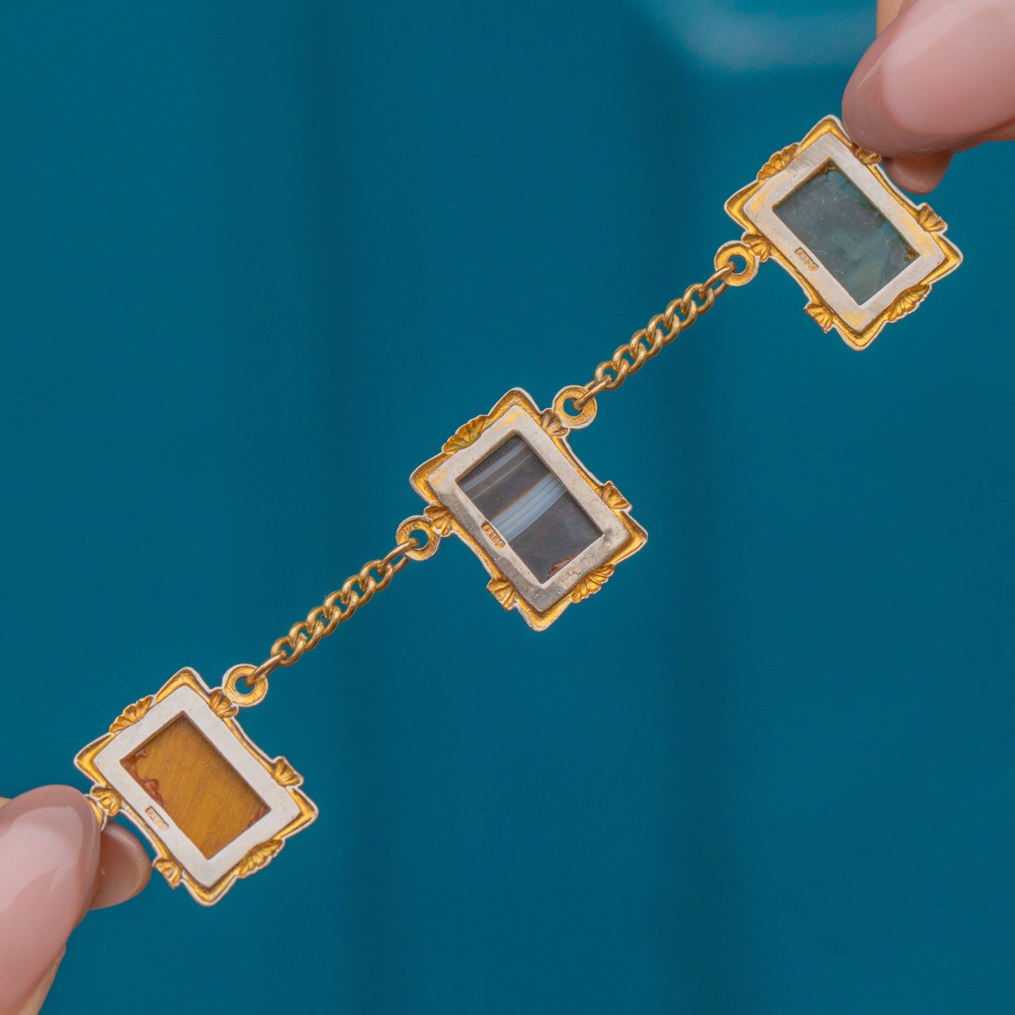 MATERIALS: 9ct Gold, From bolt ring anti-clockwise - Carnelian, Striped Agate, Moss Agate, Banded Agate, Tiger's eye, Black Agate, Green Chalcedony, Striped brown Agate, Moss Agate, Green Chalcedony.