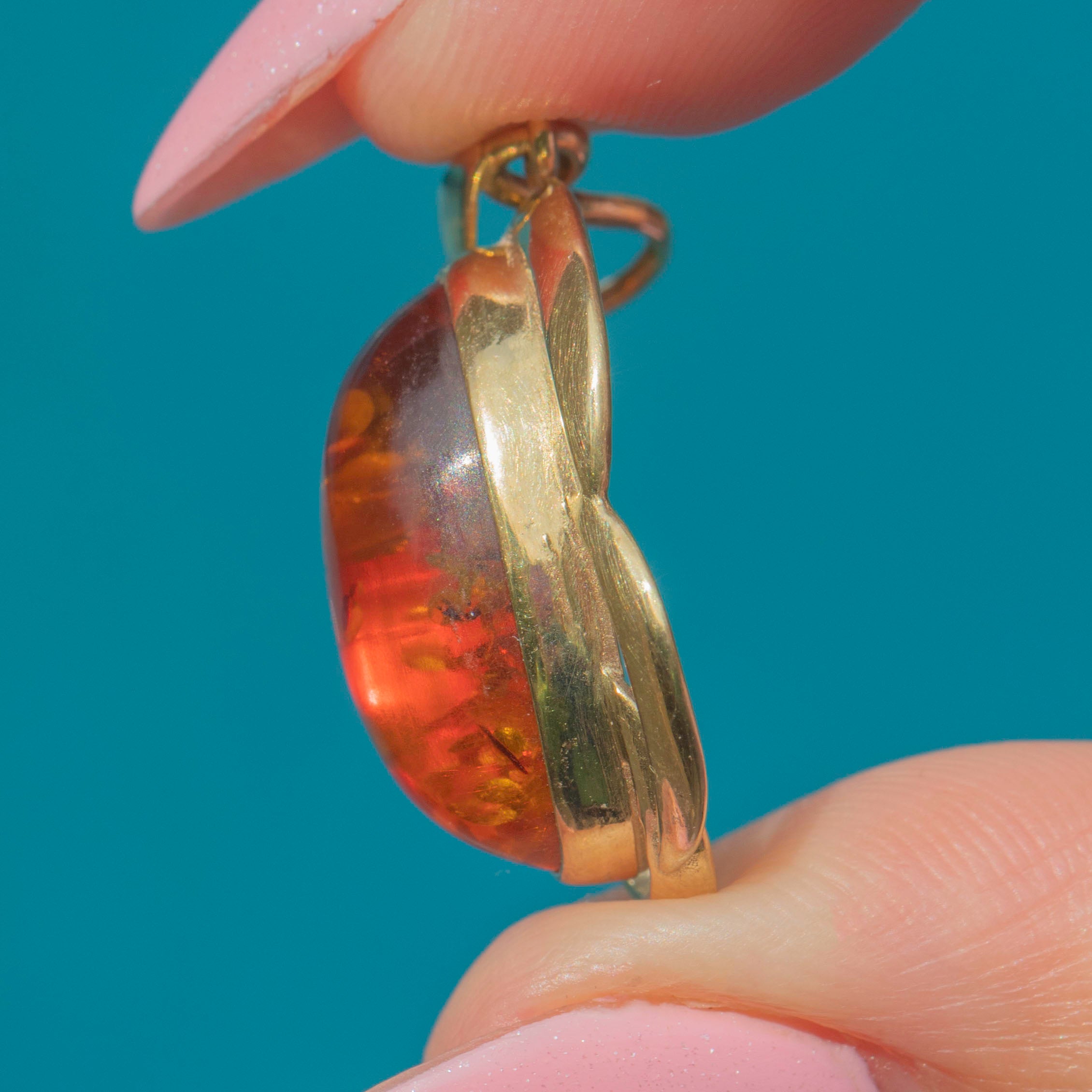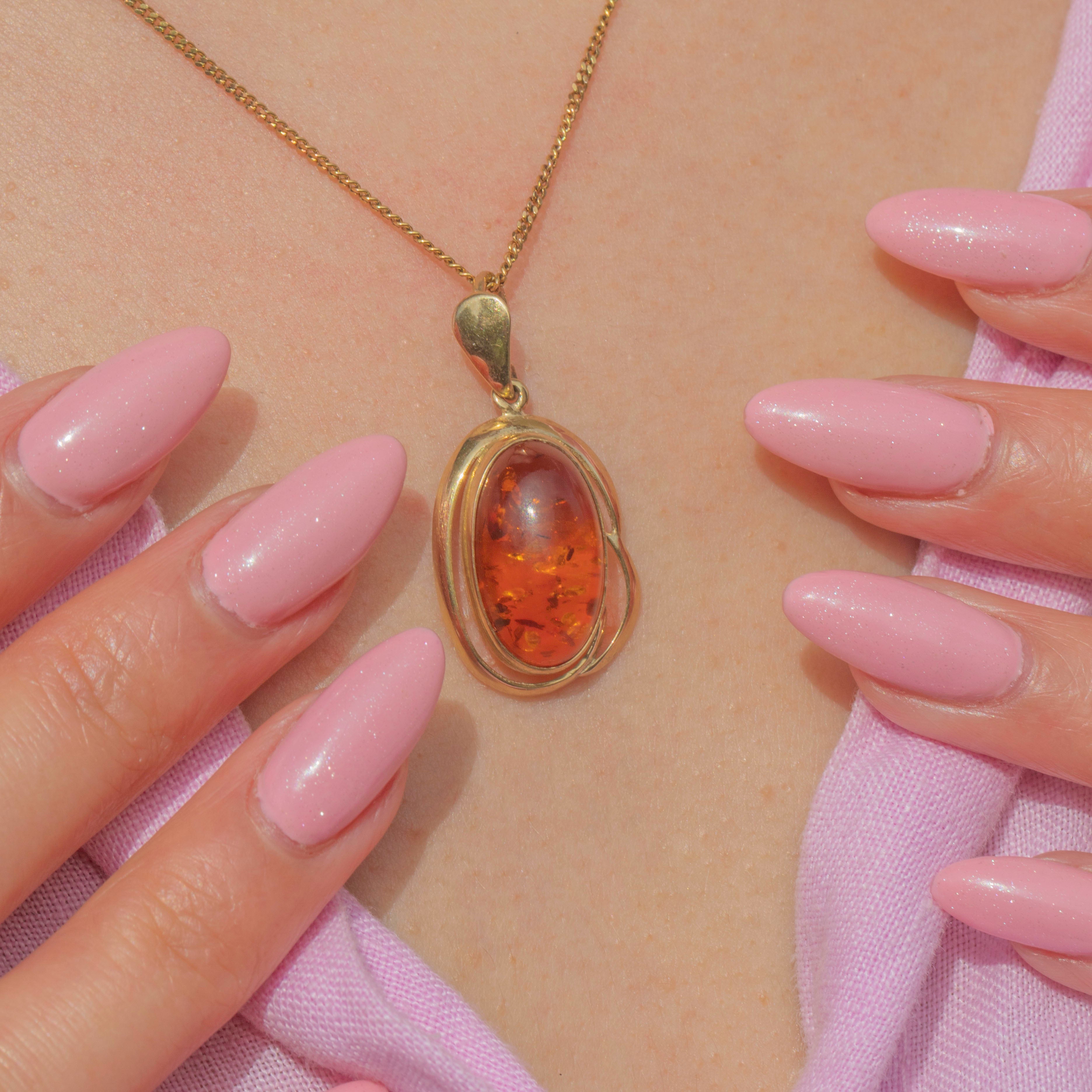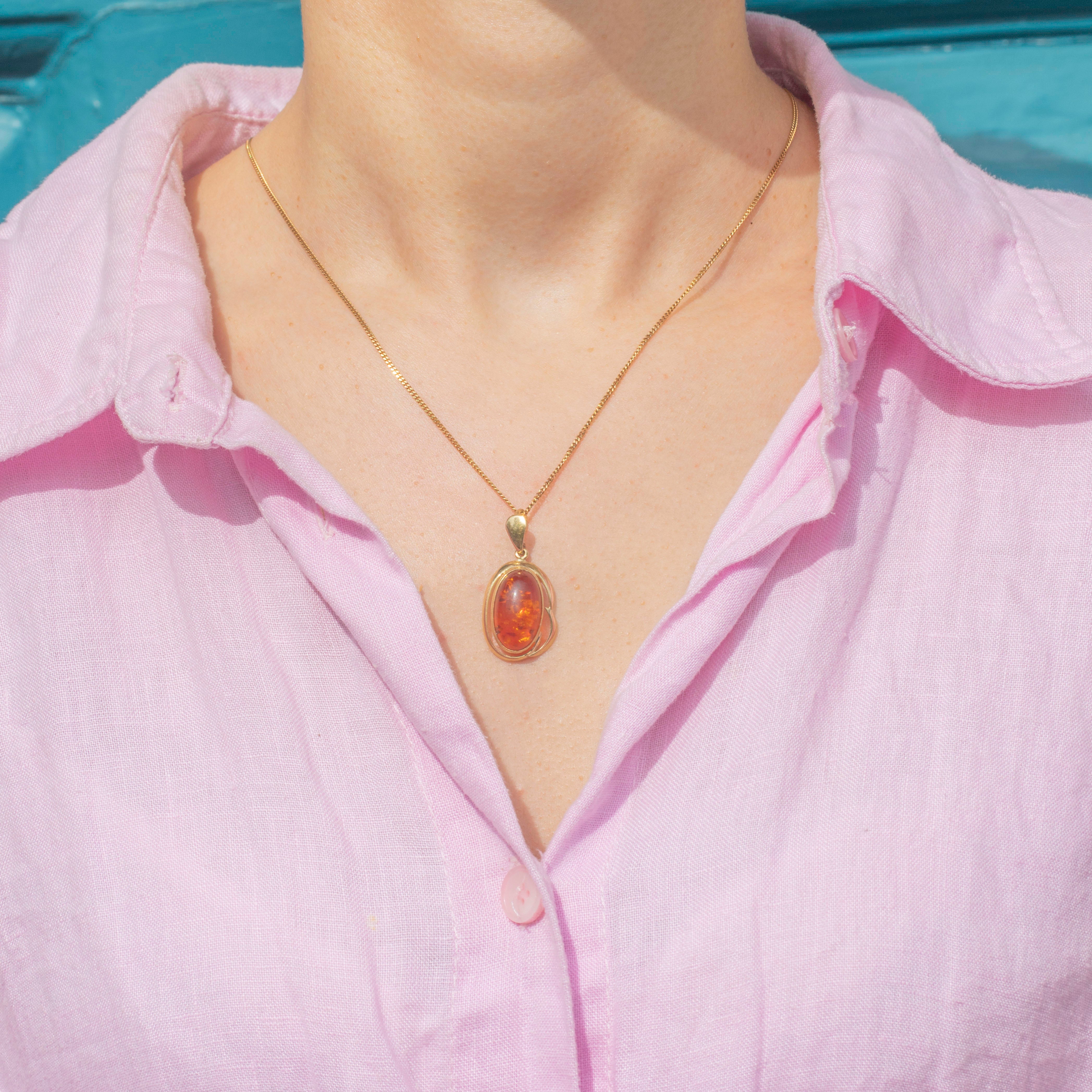EXCELLENT. This 9ct Gold Amber cabochon pendant is in excellent condition. The Amber is secure, and we love the funky flair of its setting. The bale is hallmarked, and there is very little sign of wear to note.