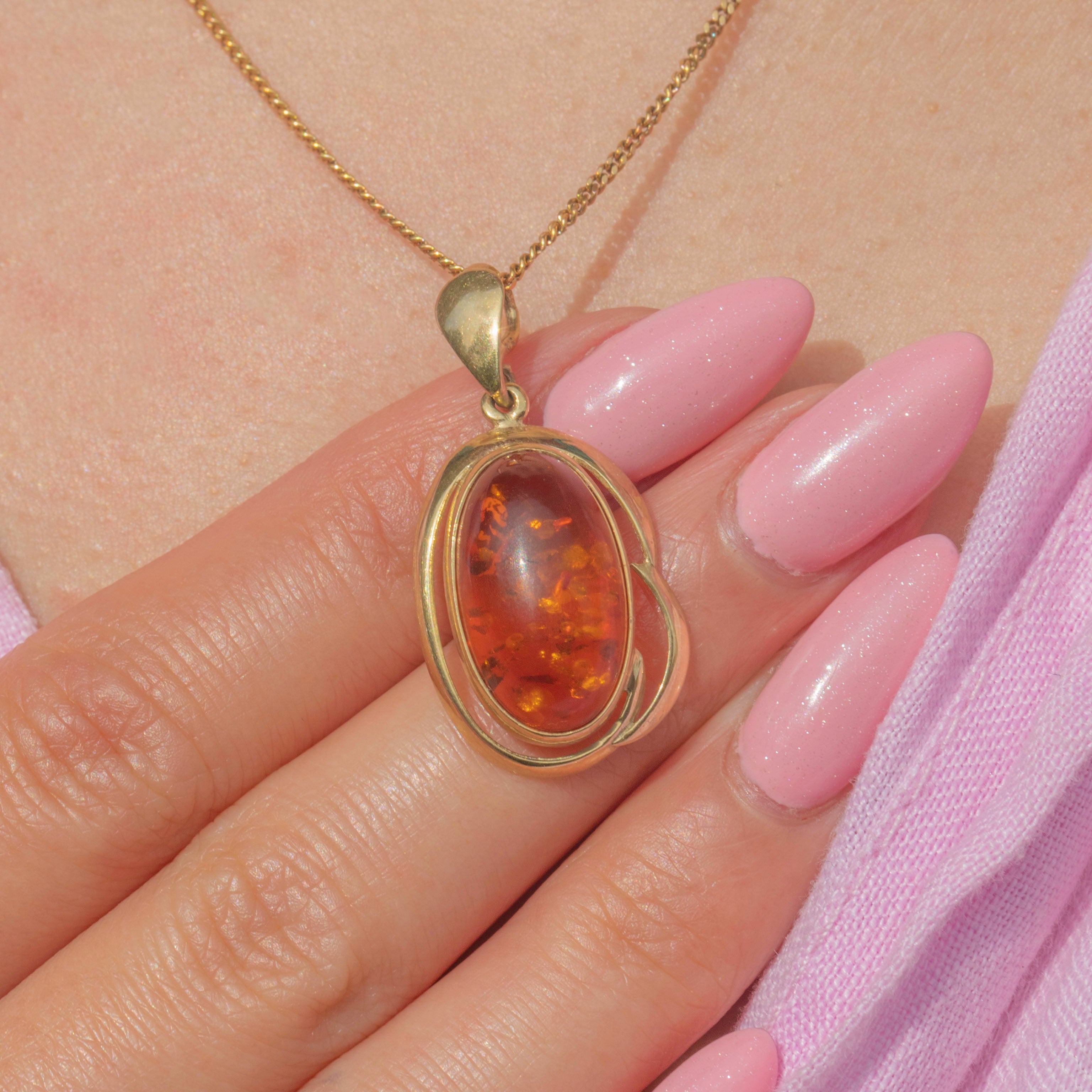 This 9ct Gold Amber cabochon pendant will make a stunning addition to your collection, with its smoothly domed surface and richly hued Amber cabochon centre!