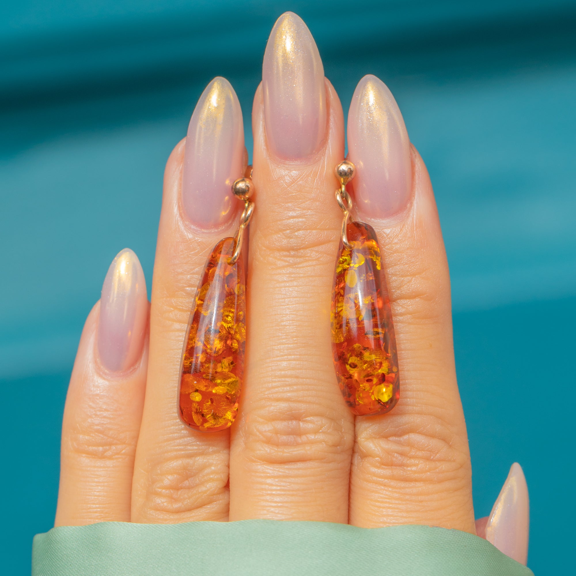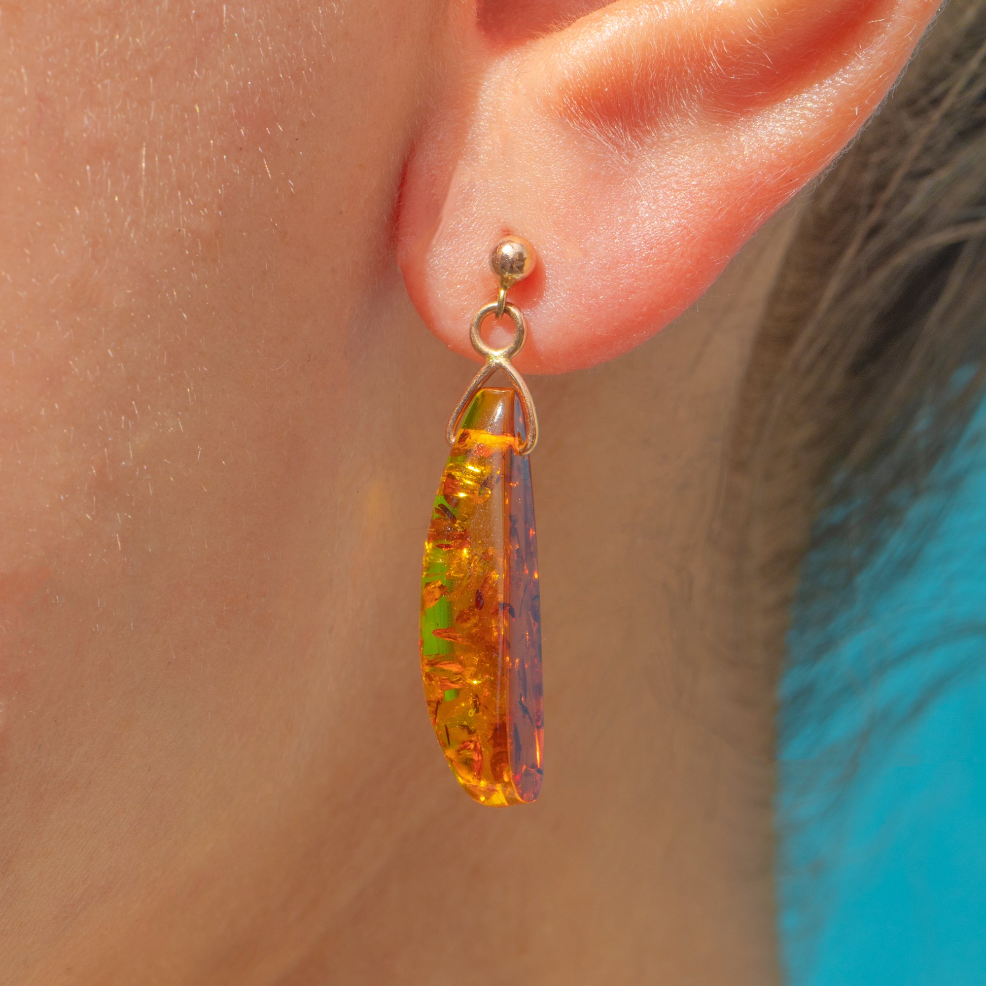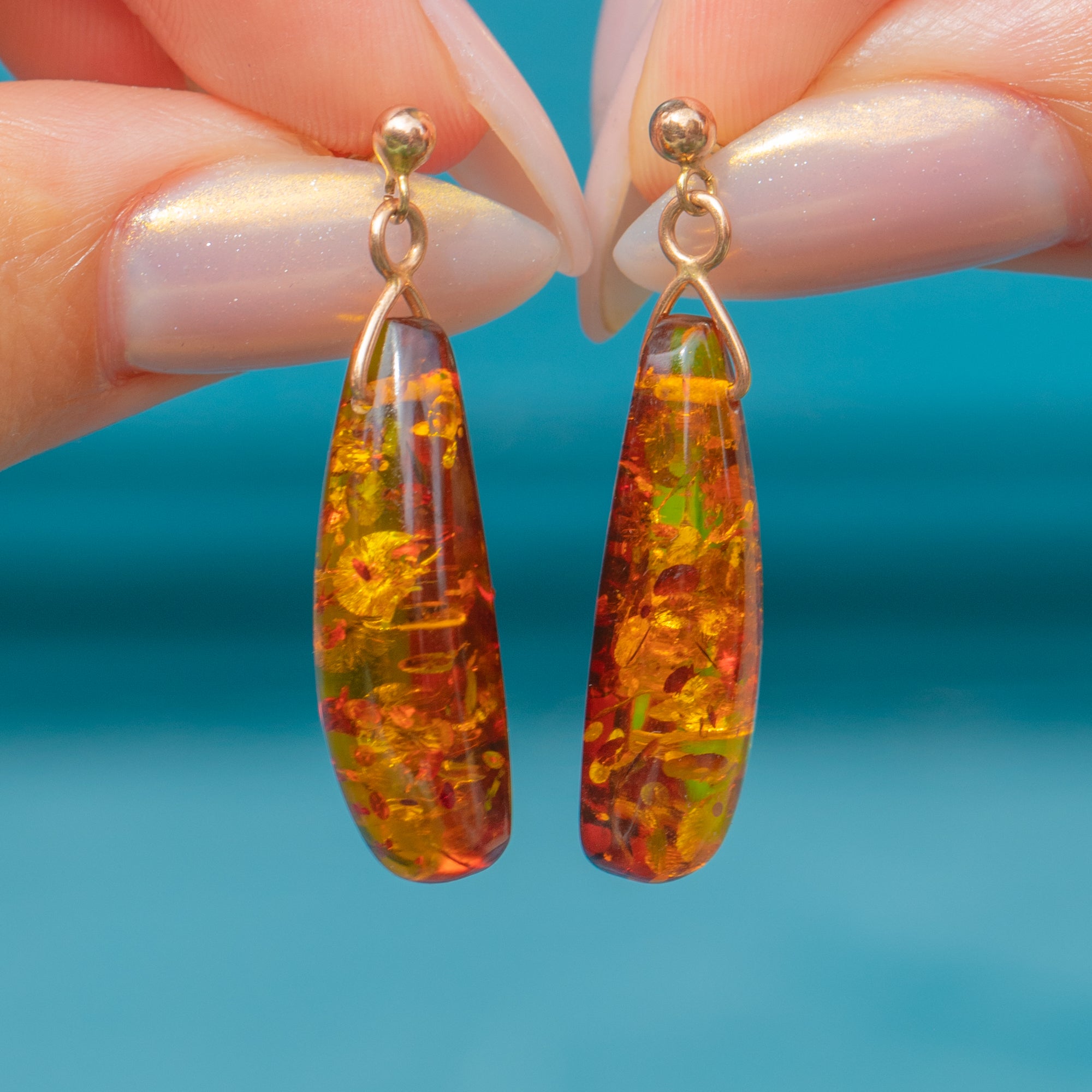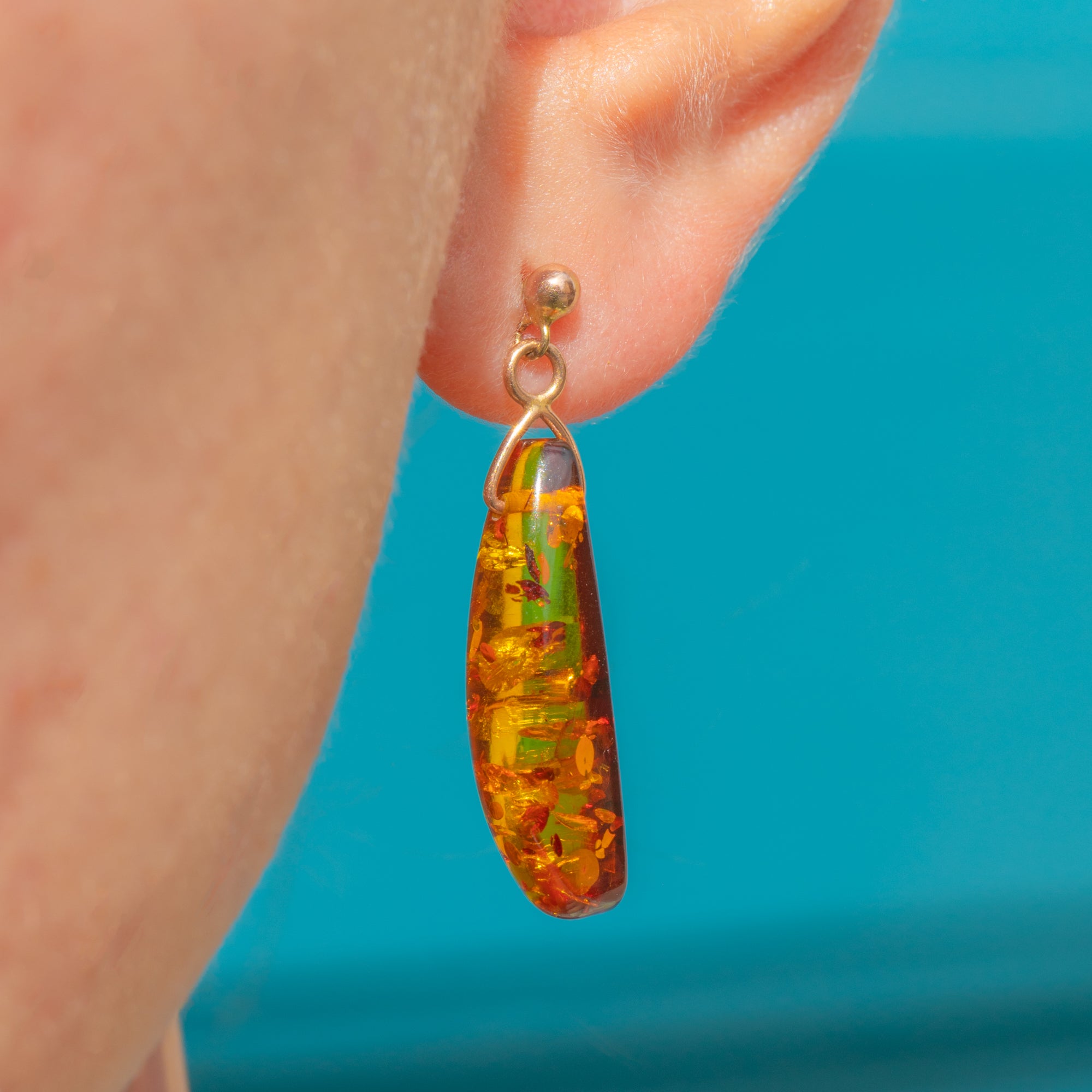 Glowing Mid-Century charm. These Vintage drop earrings pair rich, honey-toned Amber with warm 9ct Gold for an easy, everyday statement. Each elongated Amber drop shows lively natural inclusions that catch the light beautifully.