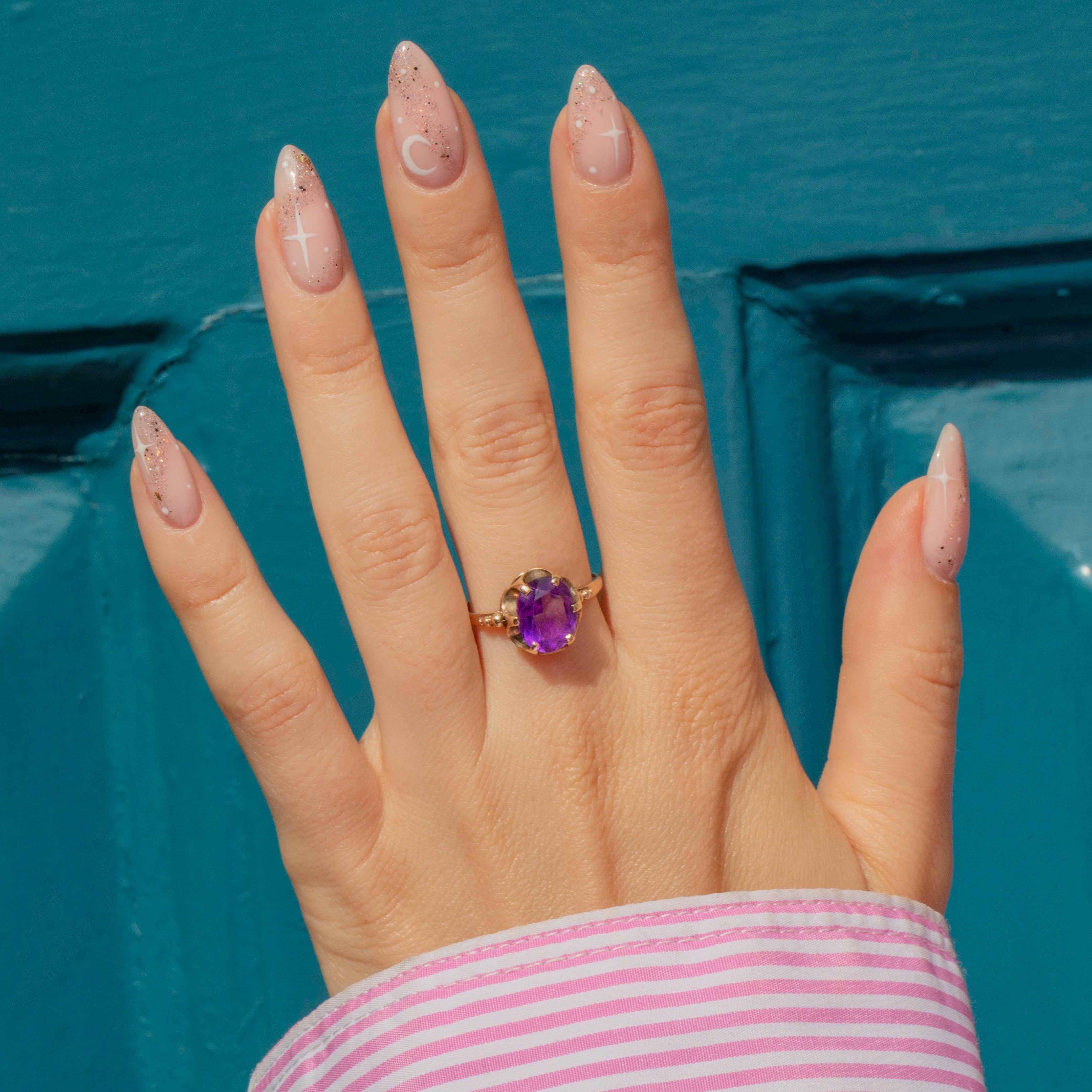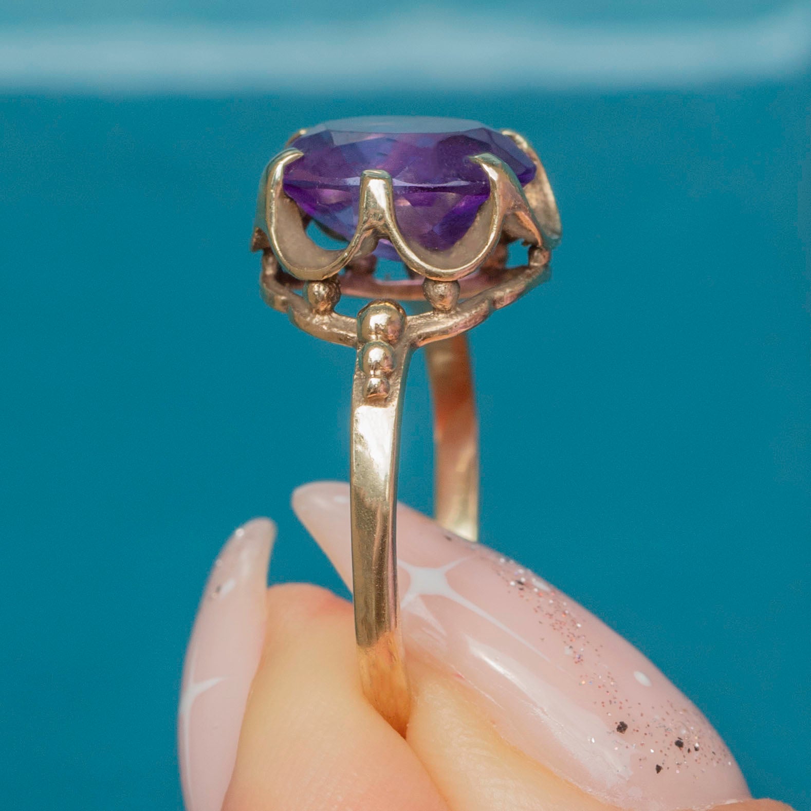 The softly scalloped buttercup setting will add undeniable feminine charm to your hand, and the high profile allows the light to pour through the gemstone from every angle. This beautiful Amethyst ring is fully hallmarked to the year 1978 making her a true vintage treasure!