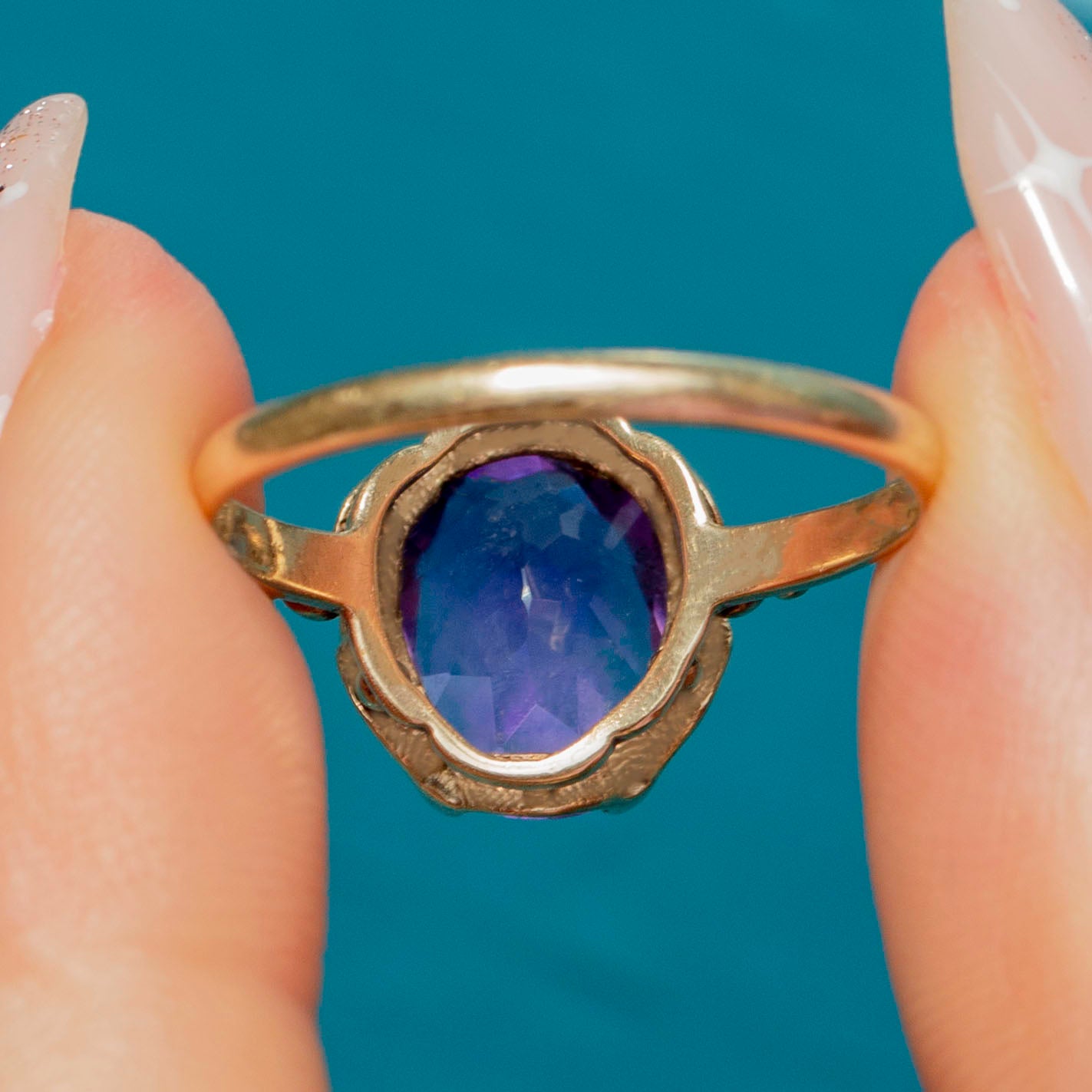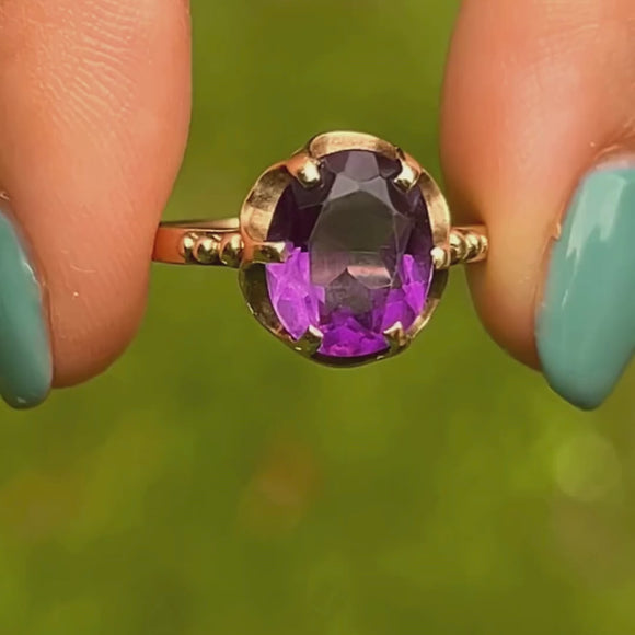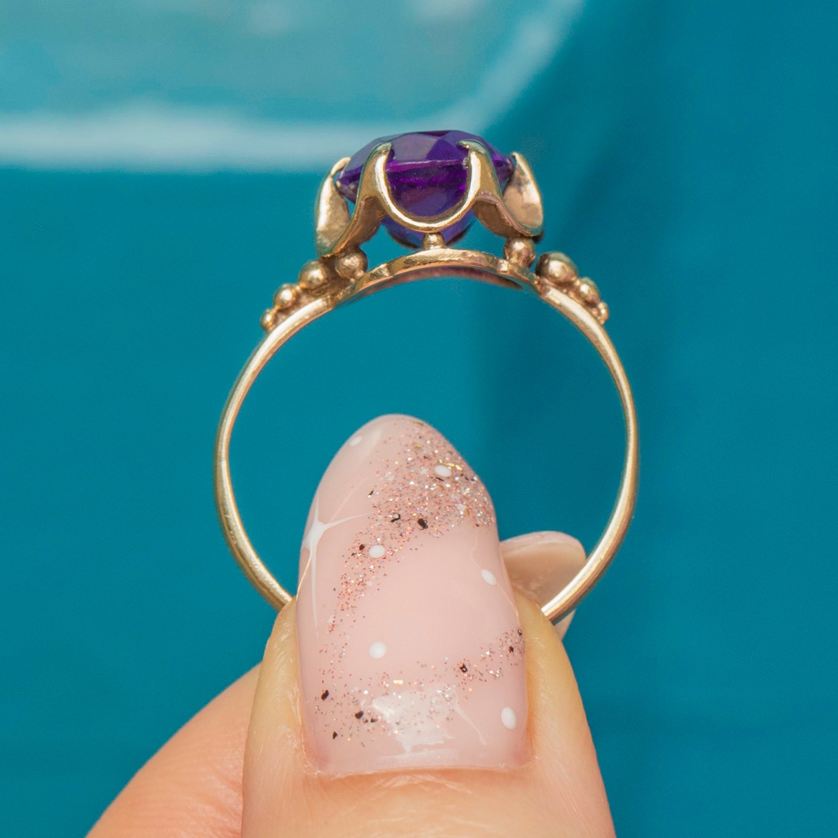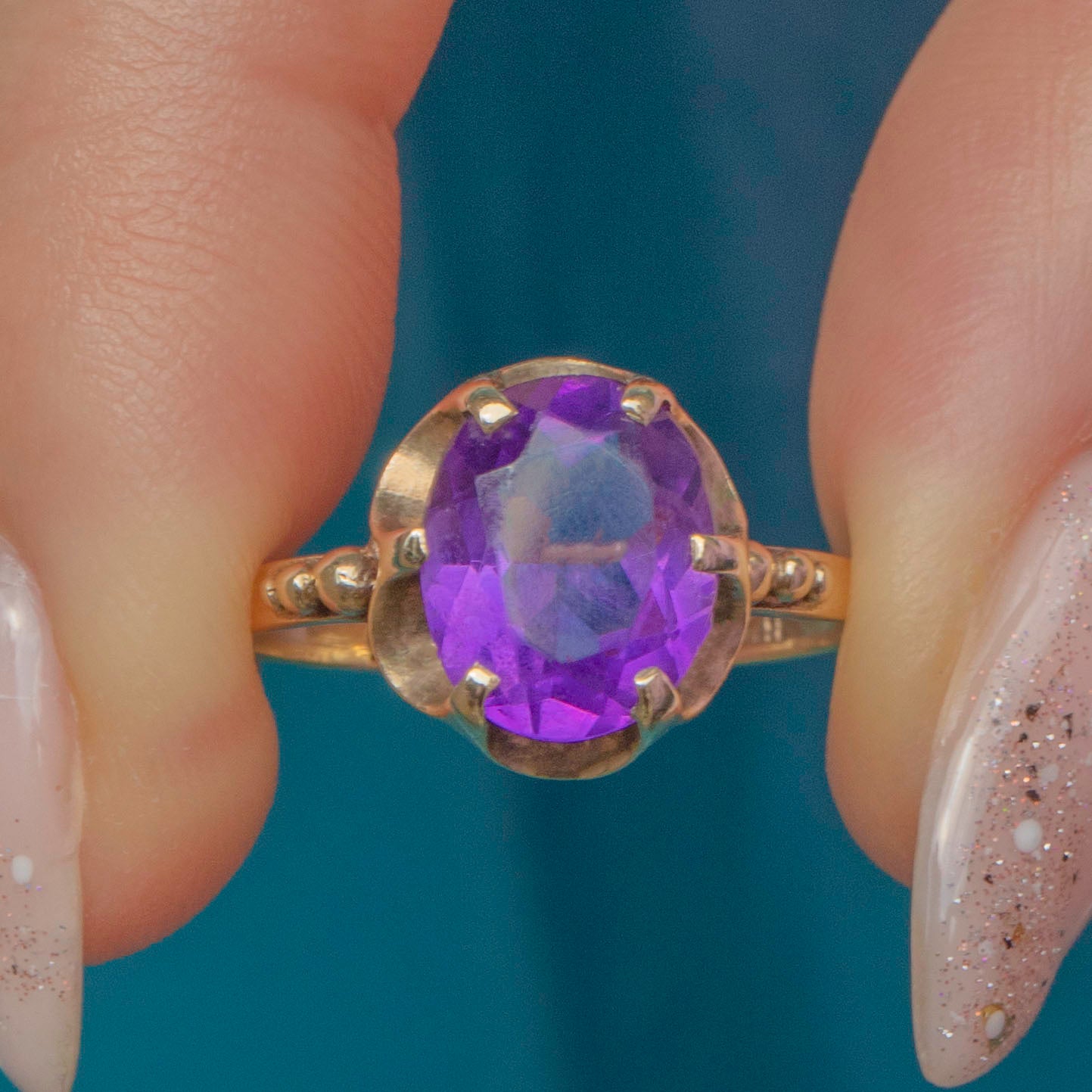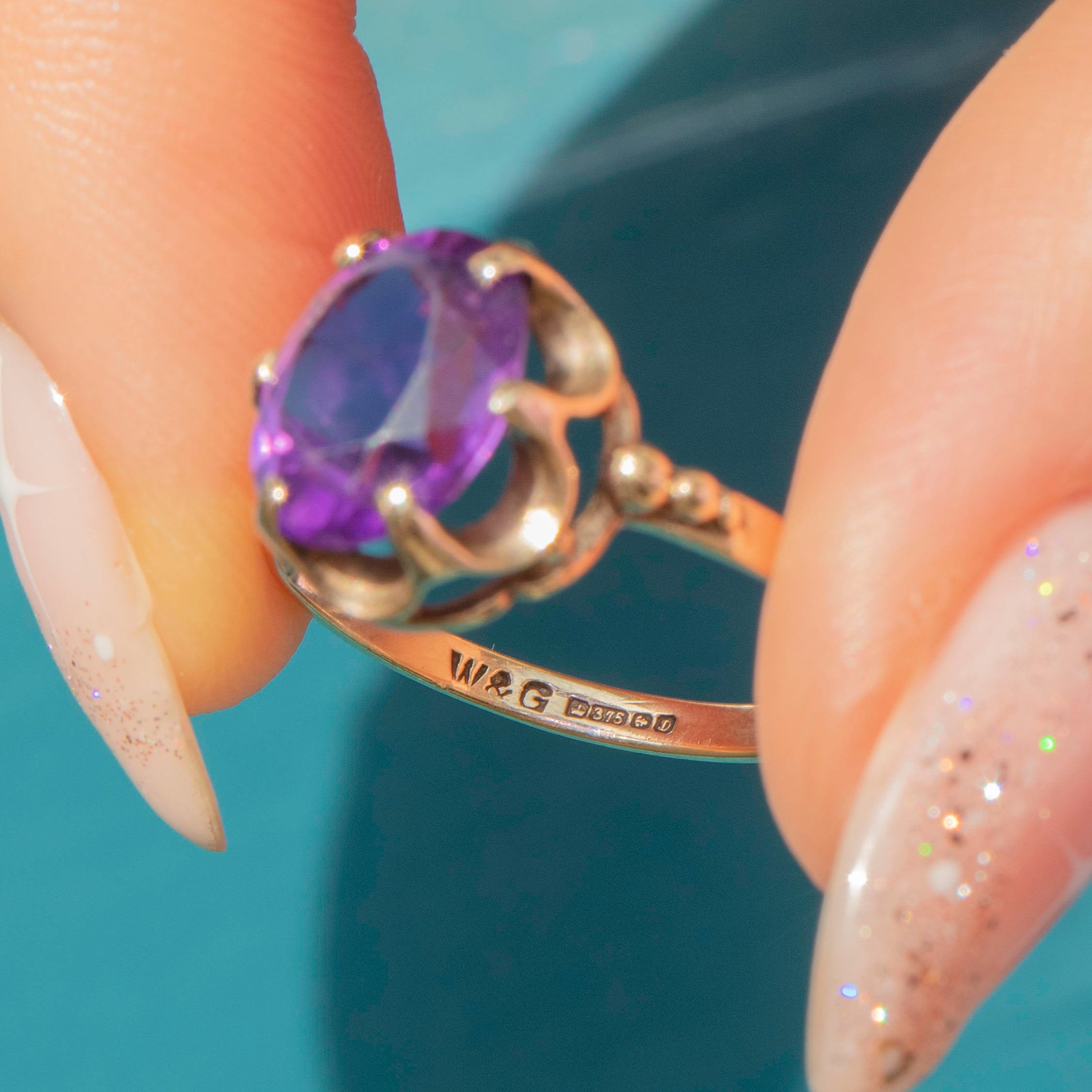 Bring some vintage charm into your repertoire with this delightful 9ct Gold Amethyst buttercup set ring! Exuding feminity from her every curve, this mid-century vintage ring boasts a 1.77ct Amethyst with deep purple hues revealing flashes of violet as its crisp facets catch the light.