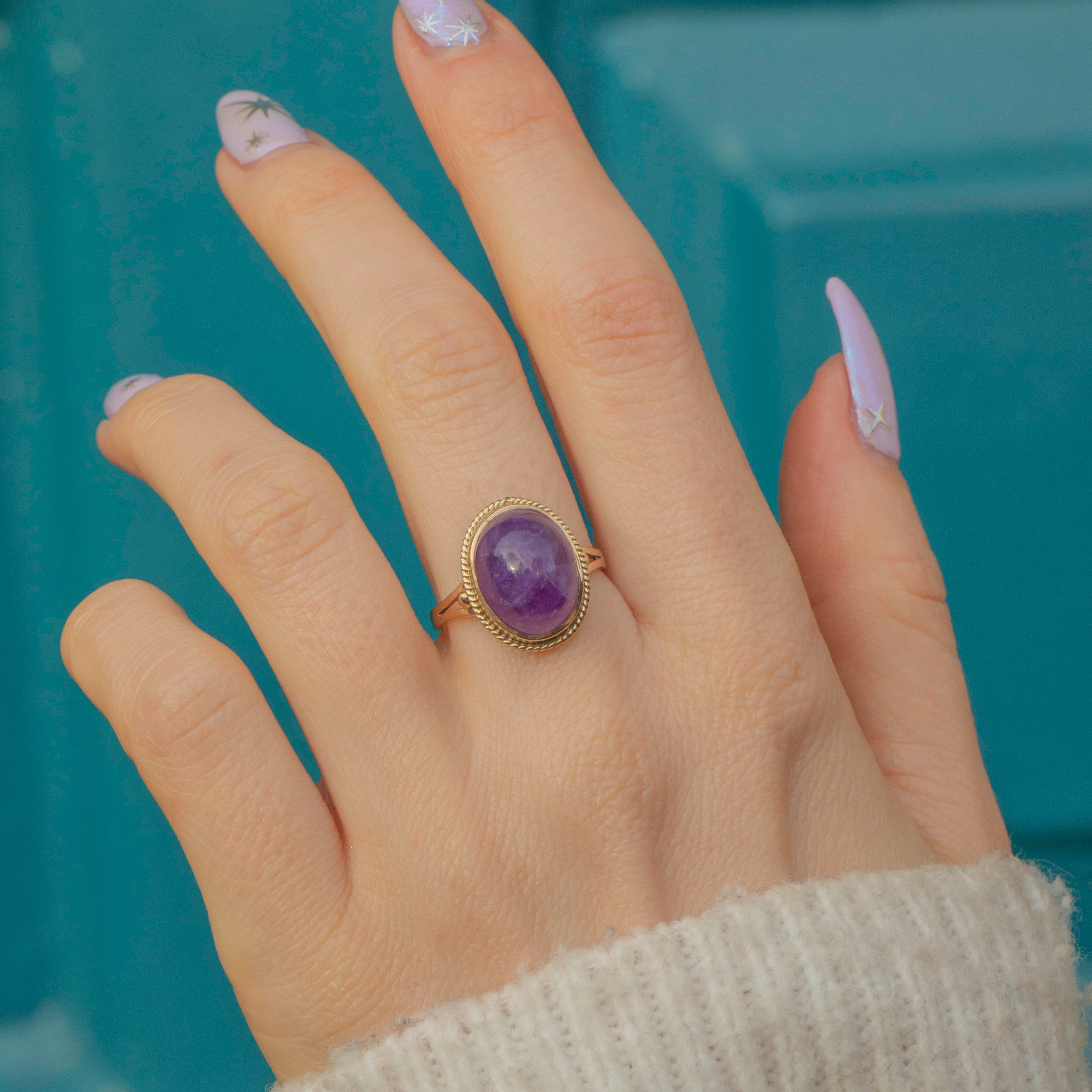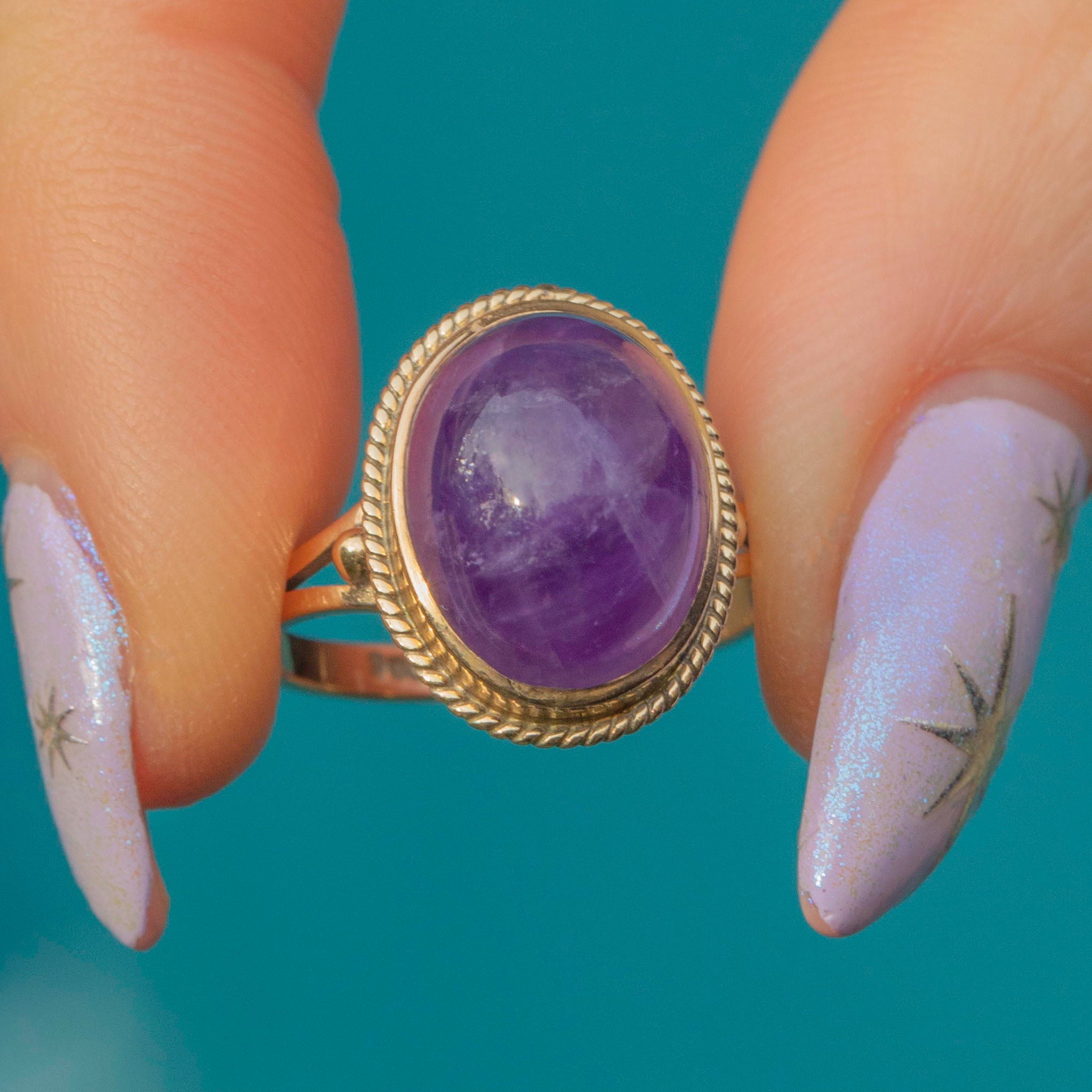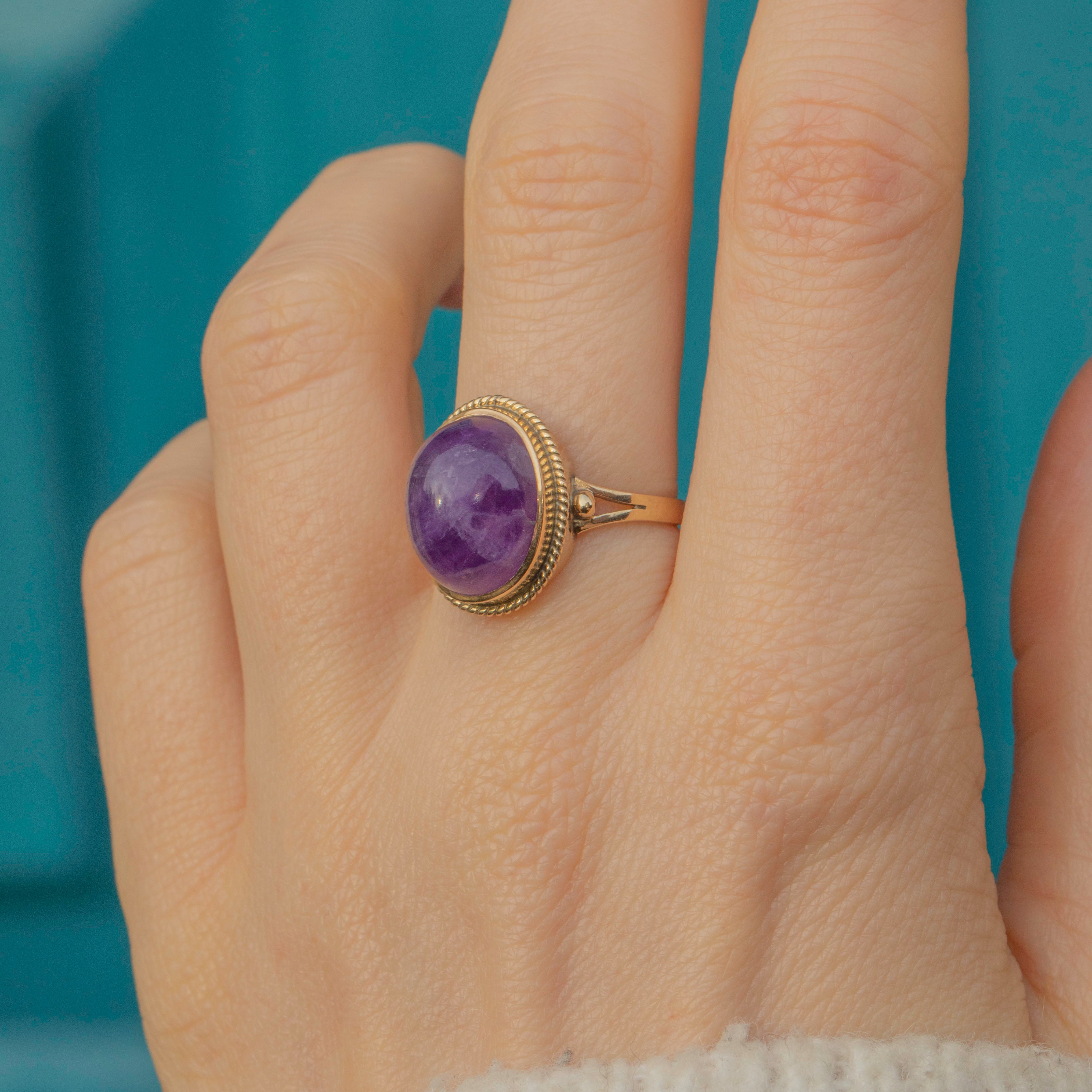 EXCELLENT: This 9ct Gold Amethyst cabochon ring is in excellent condition. The Amethyst is richly hued and well set into her 9ct Gold. There is a very slight scuff to the Amethyst, however, this is only truly visible under close inspection. The ring band has got a well-rounded shape, making her uber comfortable to wear.