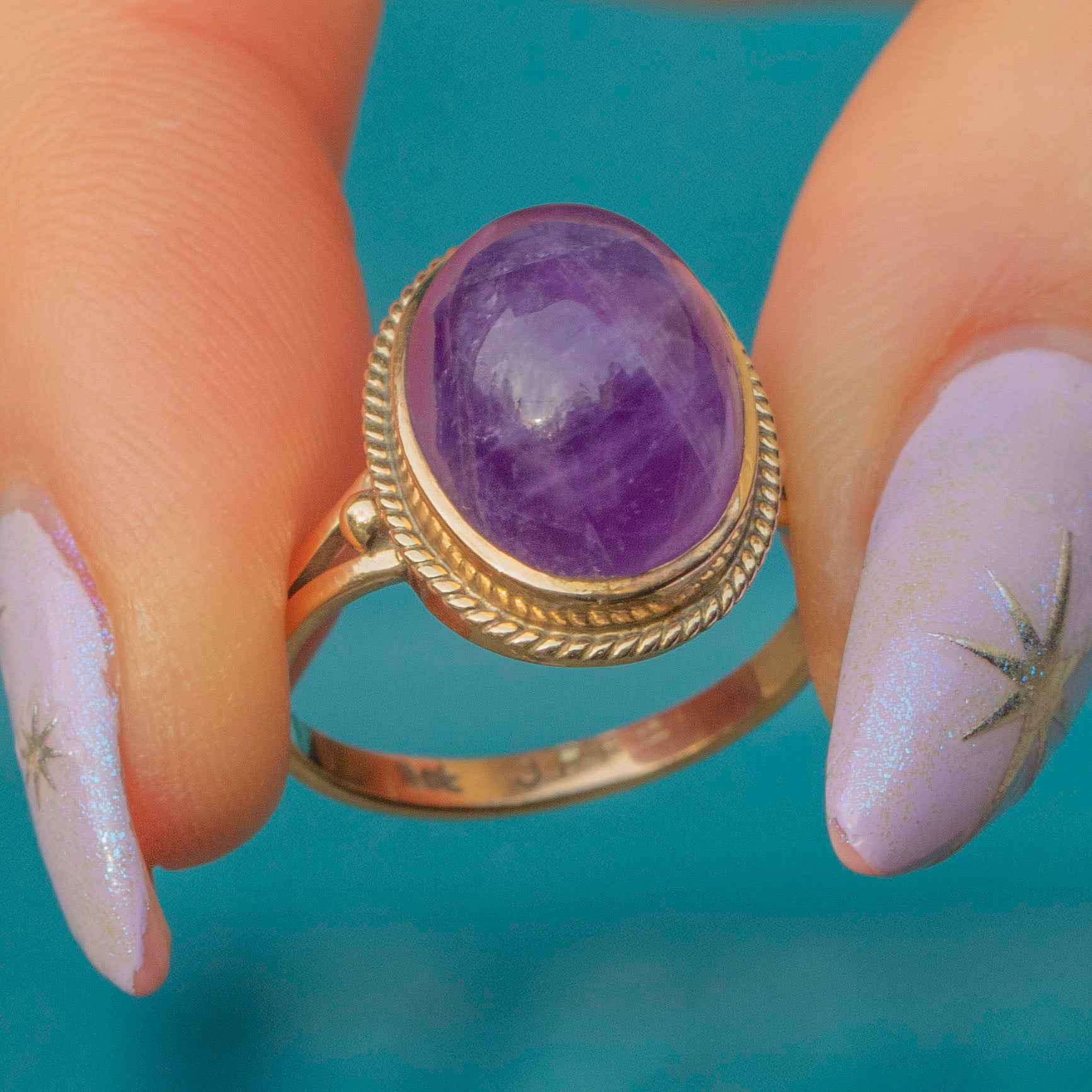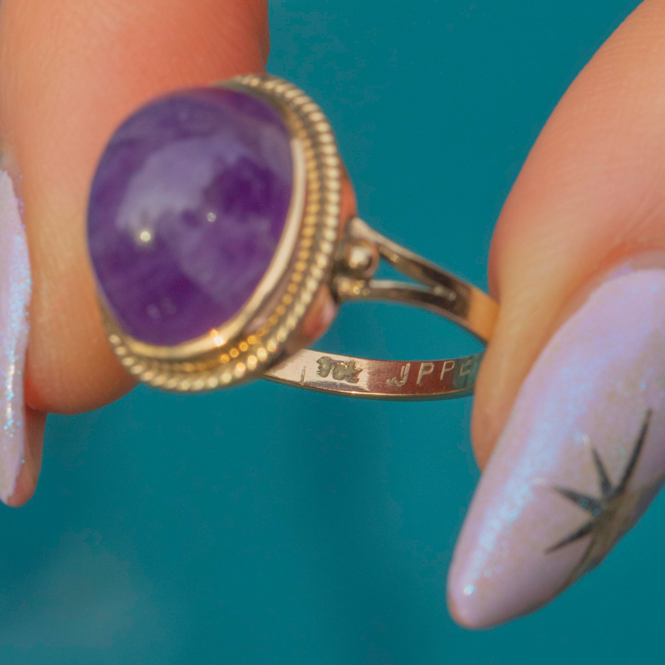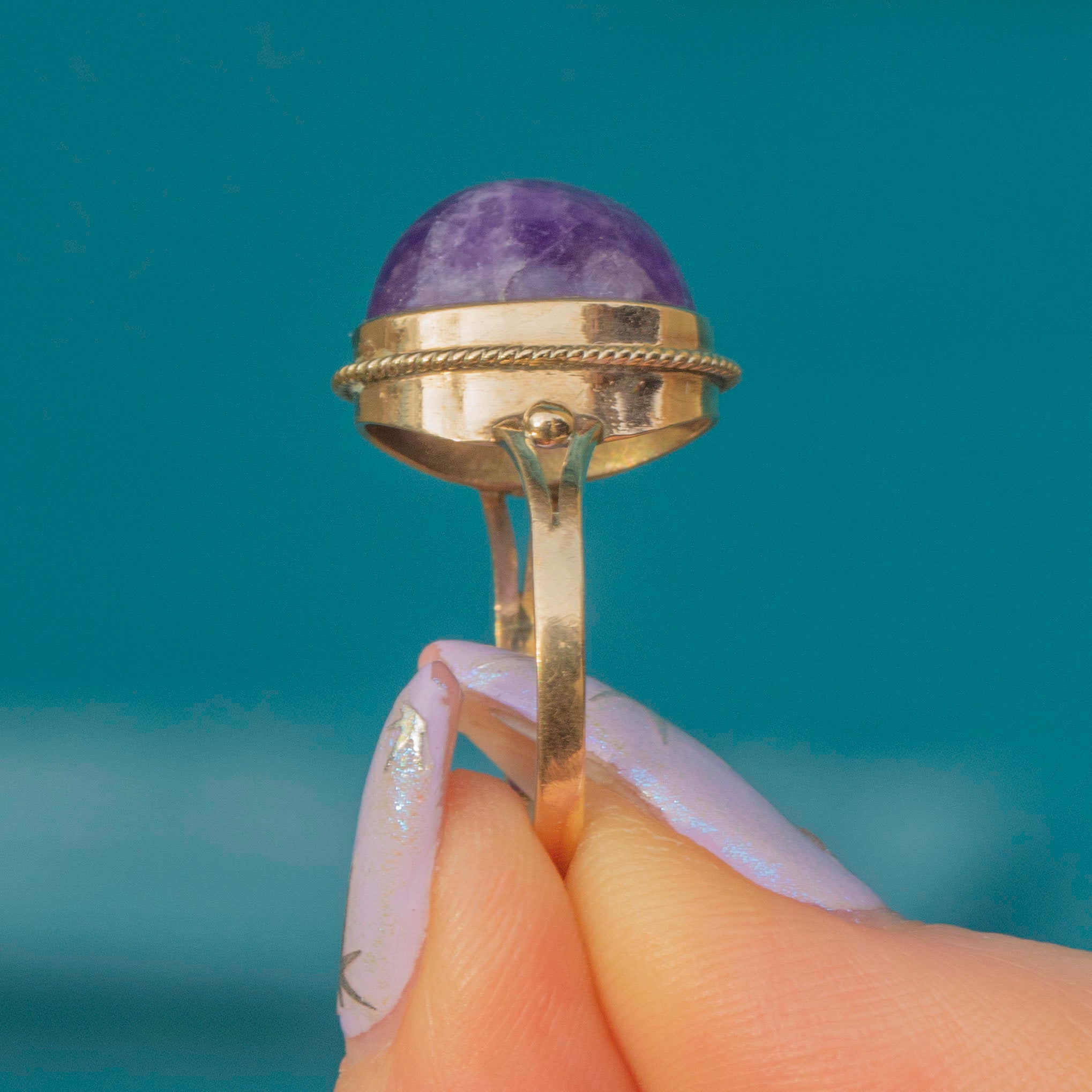 This 9ct Gold Amethyst cabochon ring embodies all things mystical! Like a glowing crystal ball, her deep lavender 5.30 Amethyst cabochon emanates a soft, billowing glow, giving this vintage ring an ethereal allure.