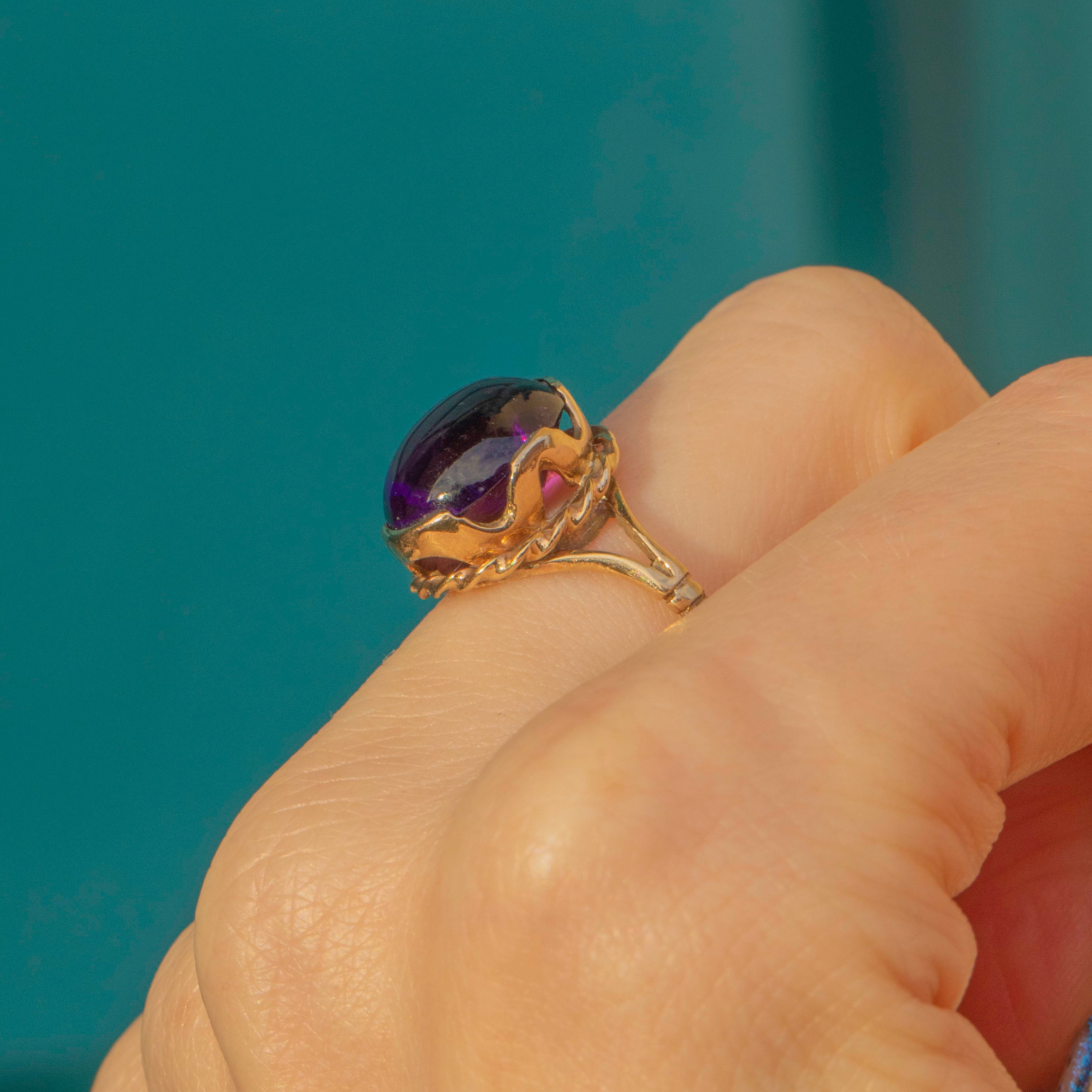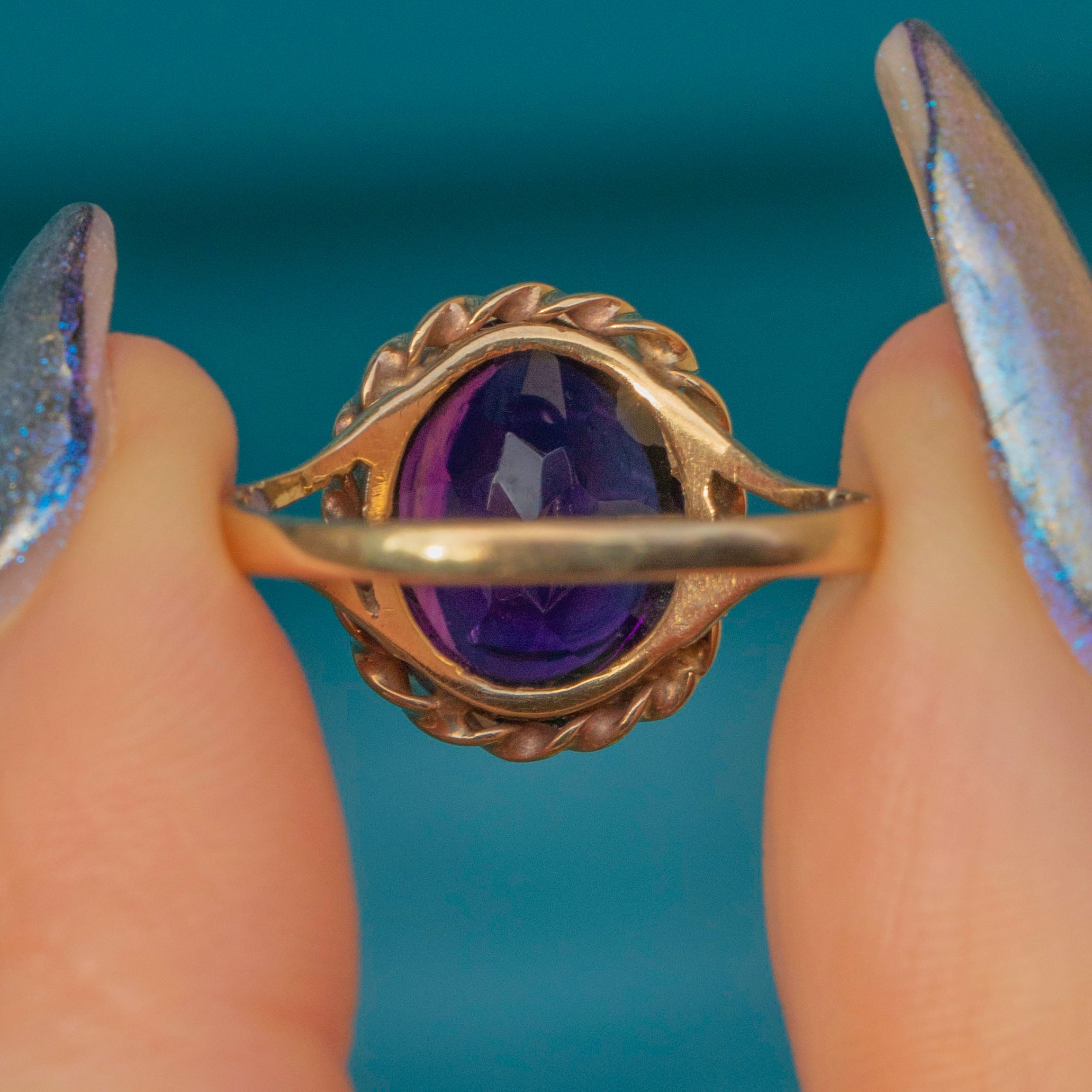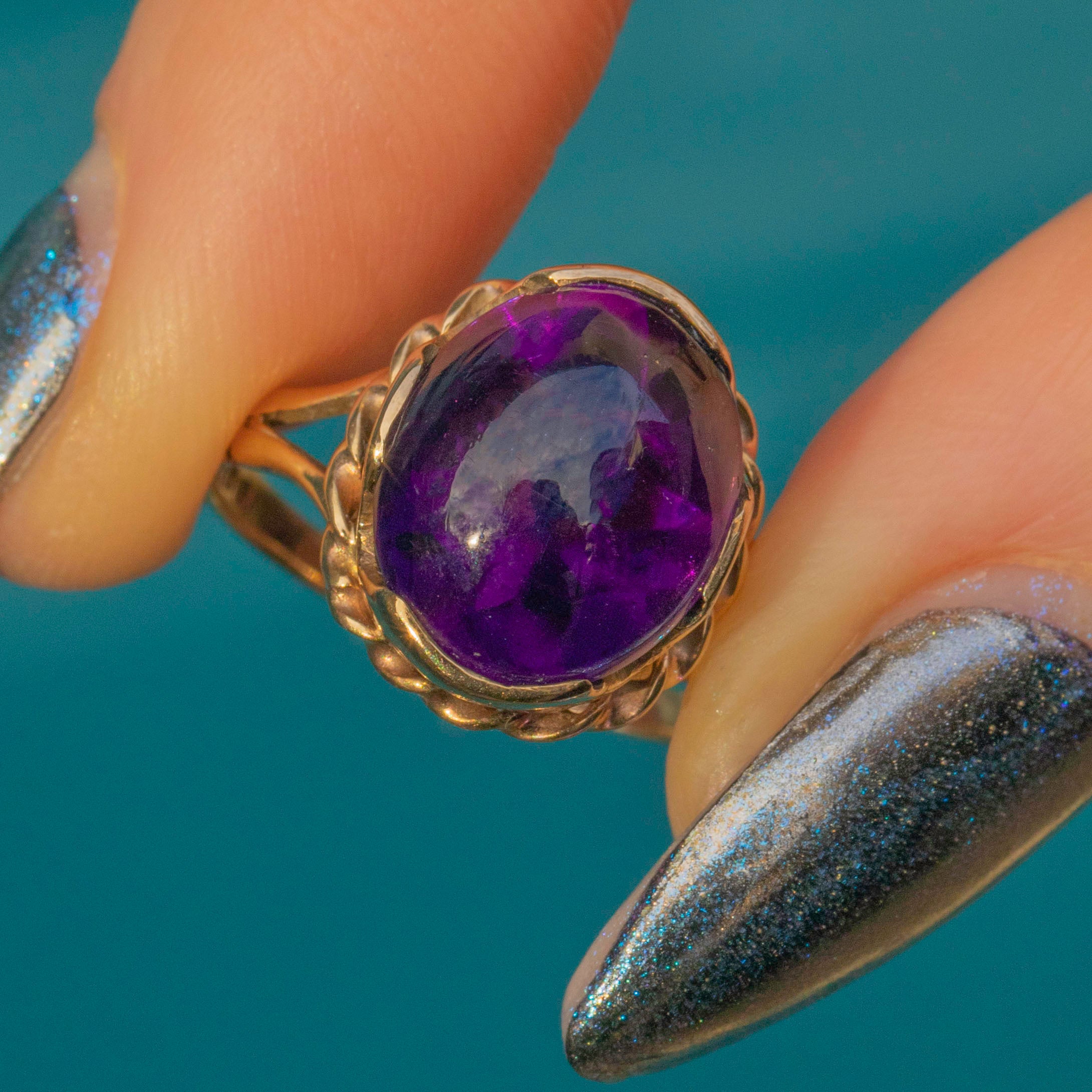 EXCELLENT This 9ct Gold Amethyst Cabochon Ring is in very good condition. The Amethyst is richly hued and well set into her 9ct Gold. There is a very slight scuff to the Amethyst, however, this is only truly visible under close inspection. The ring band has got a well-rounded shape, making her uber comfortable to wear.
