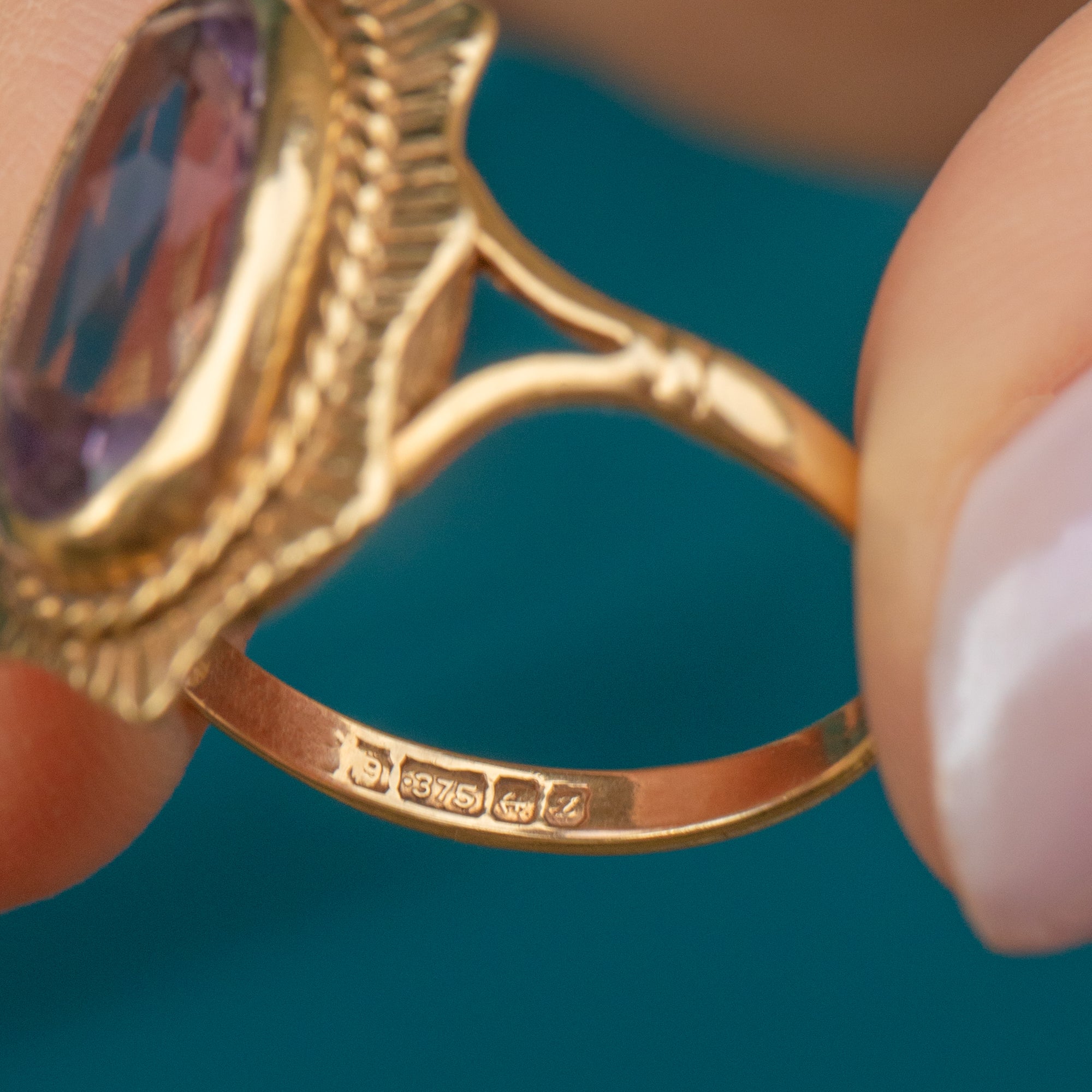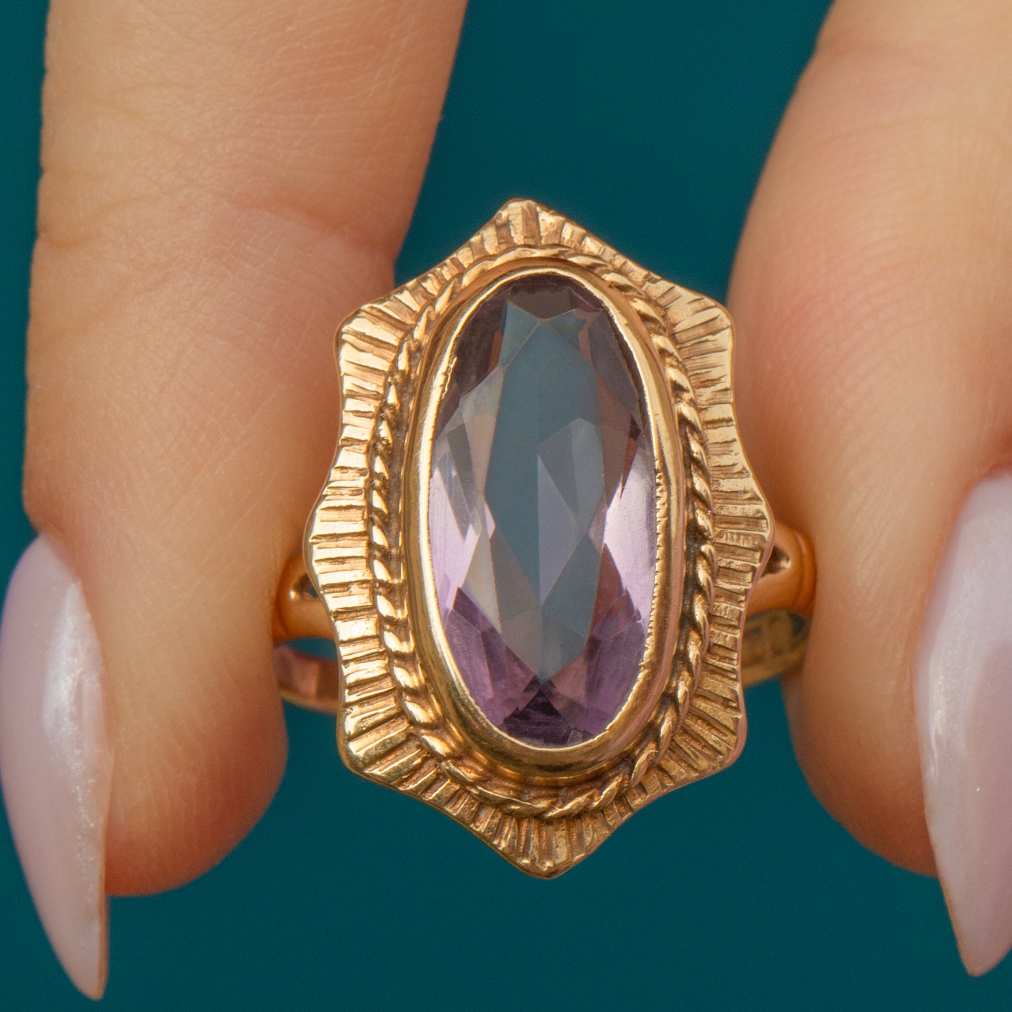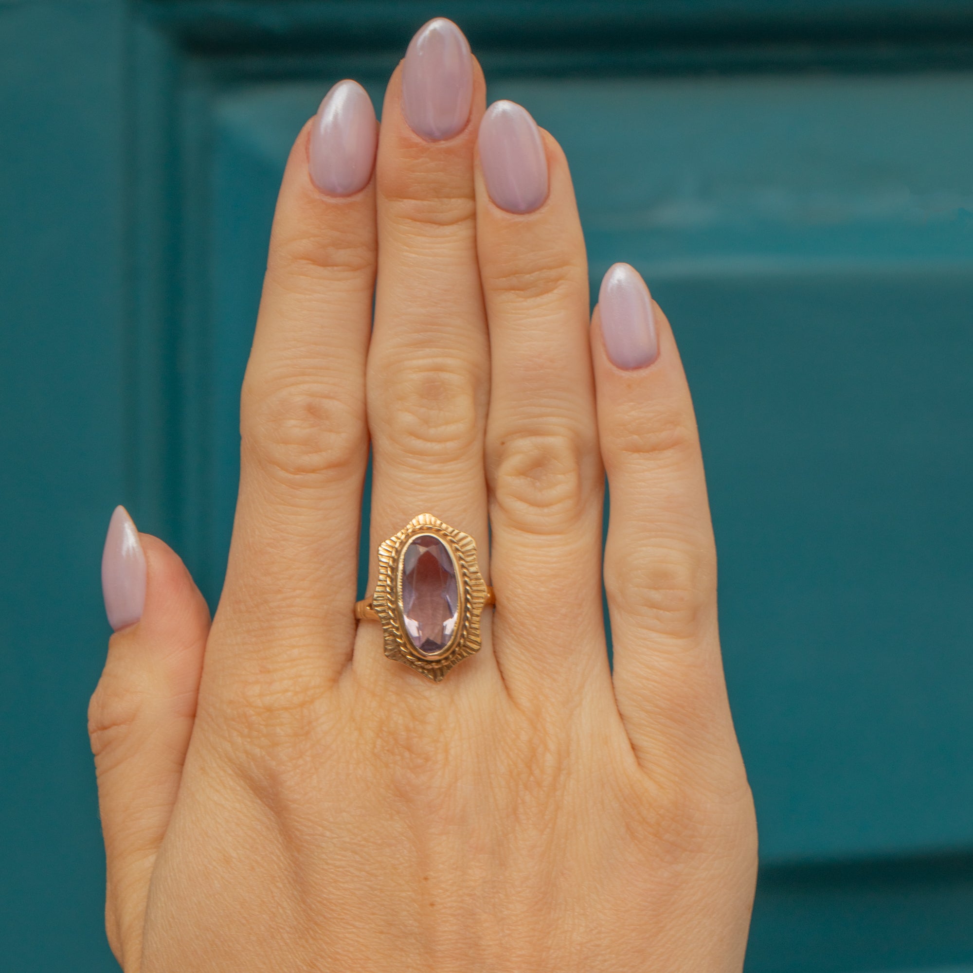 What a bold statement this 9ct Gold Amethyst cocktail ring makes! Boasting a lavender-toned oval cut Amethyst with crisp geometric facets, this mid-century treasure will mesmerise anyone who casts their eyes on her.