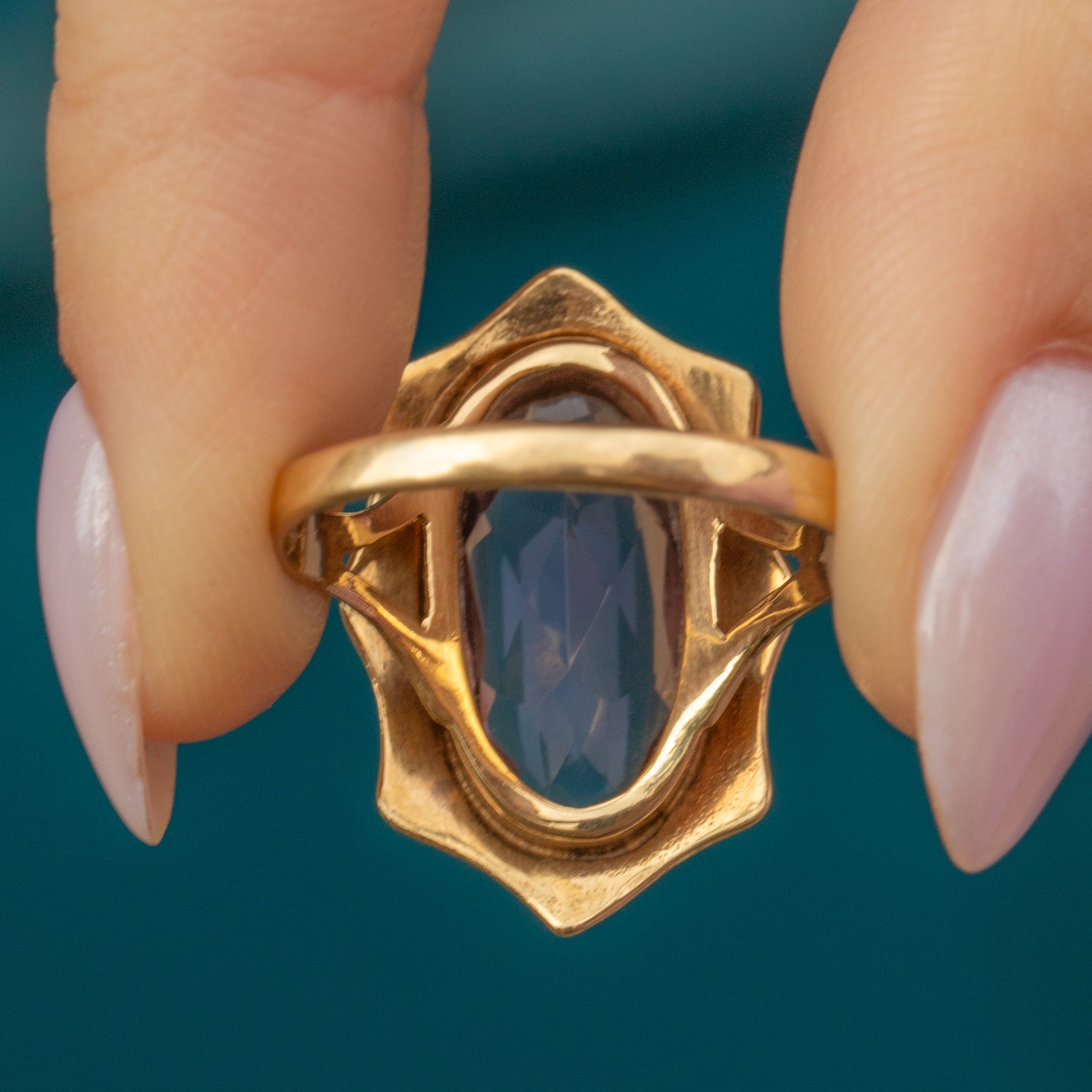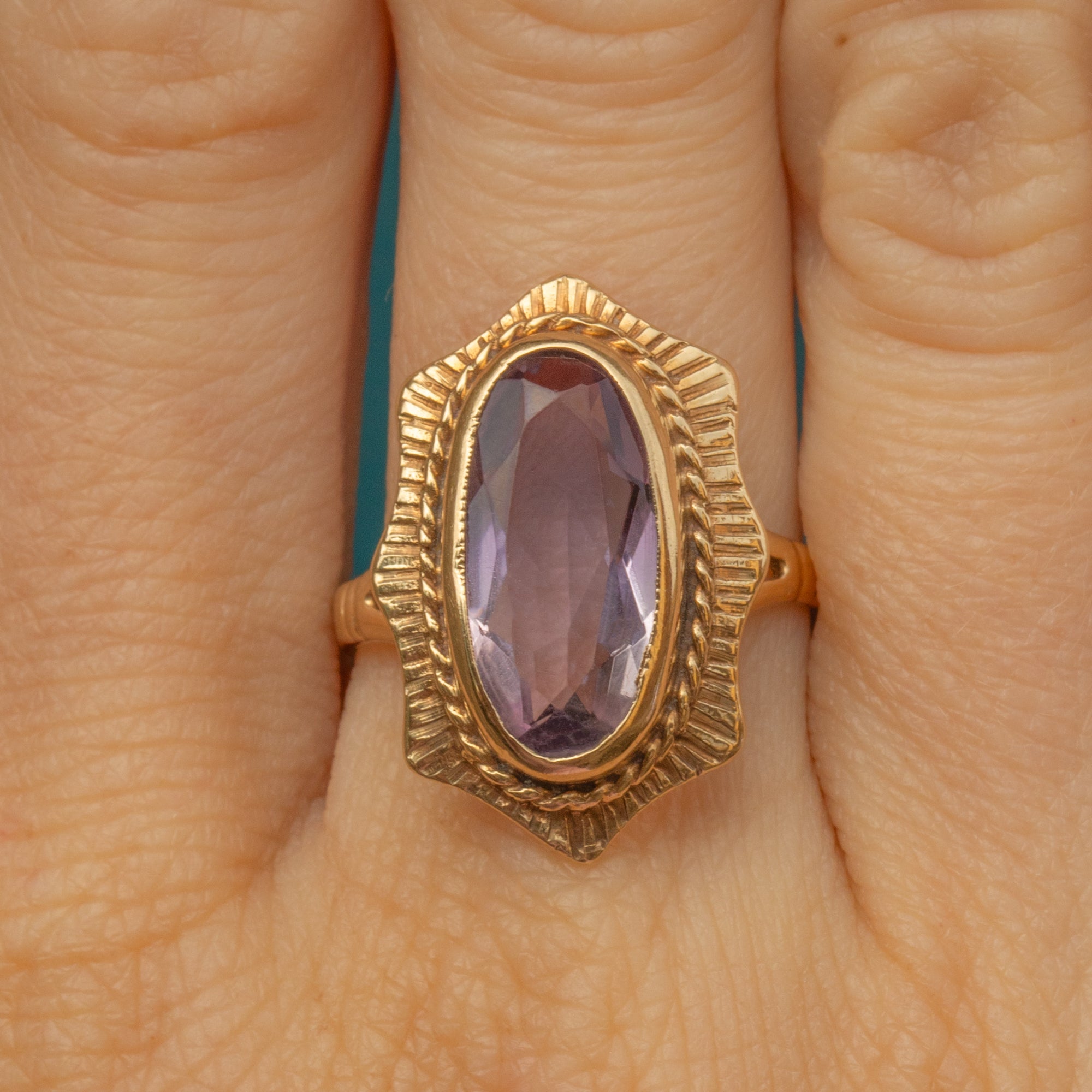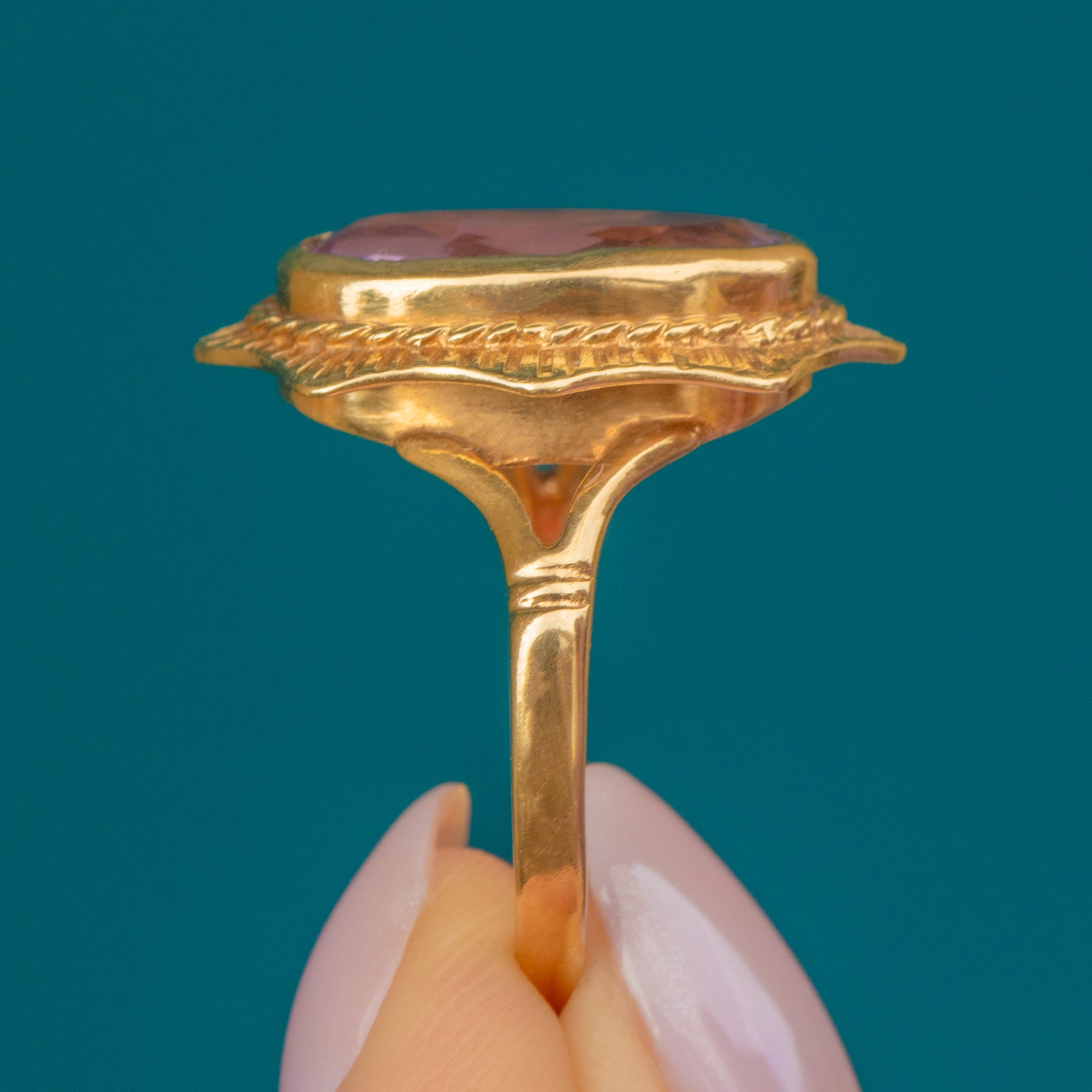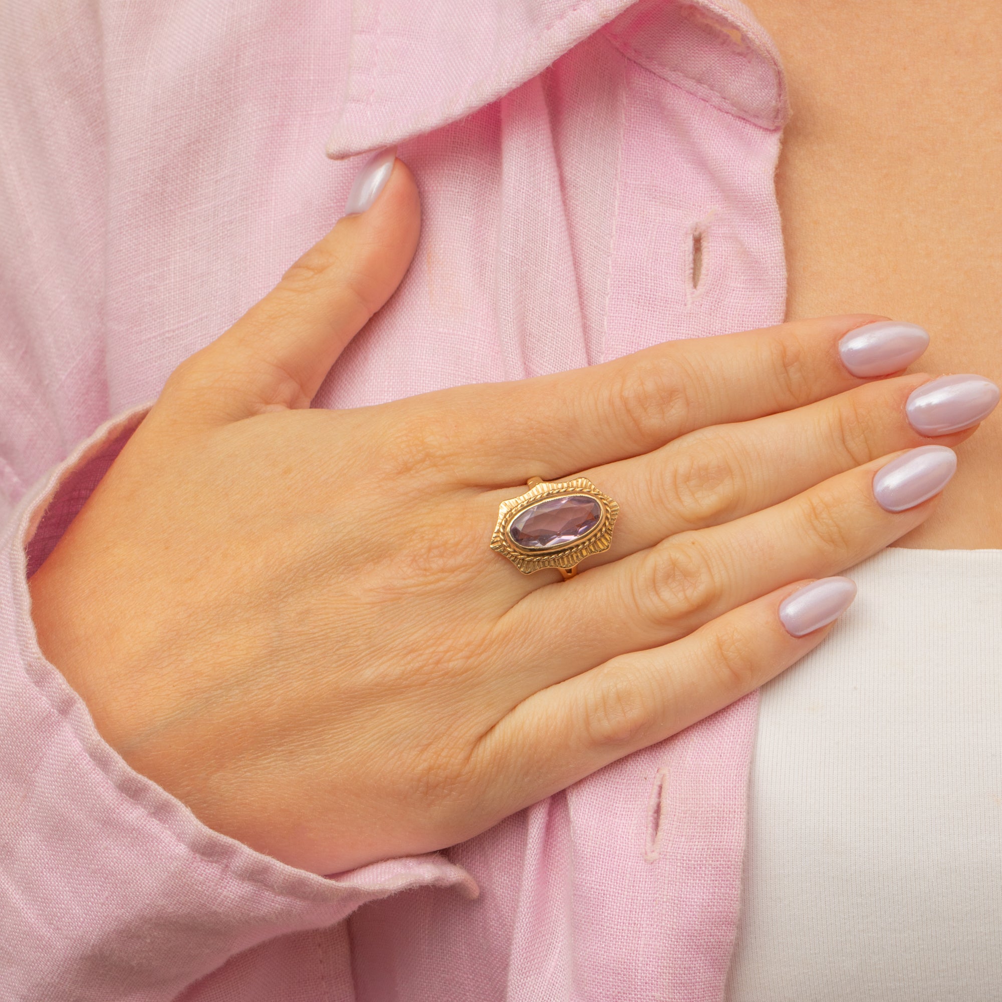 What a bold statement this 9ct Gold Amethyst cocktail ring makes! Boasting a lavender-toned oval cut Amethyst with crisp geometric facets, this mid-century treasure will mesmerise anyone who casts their eyes on her.