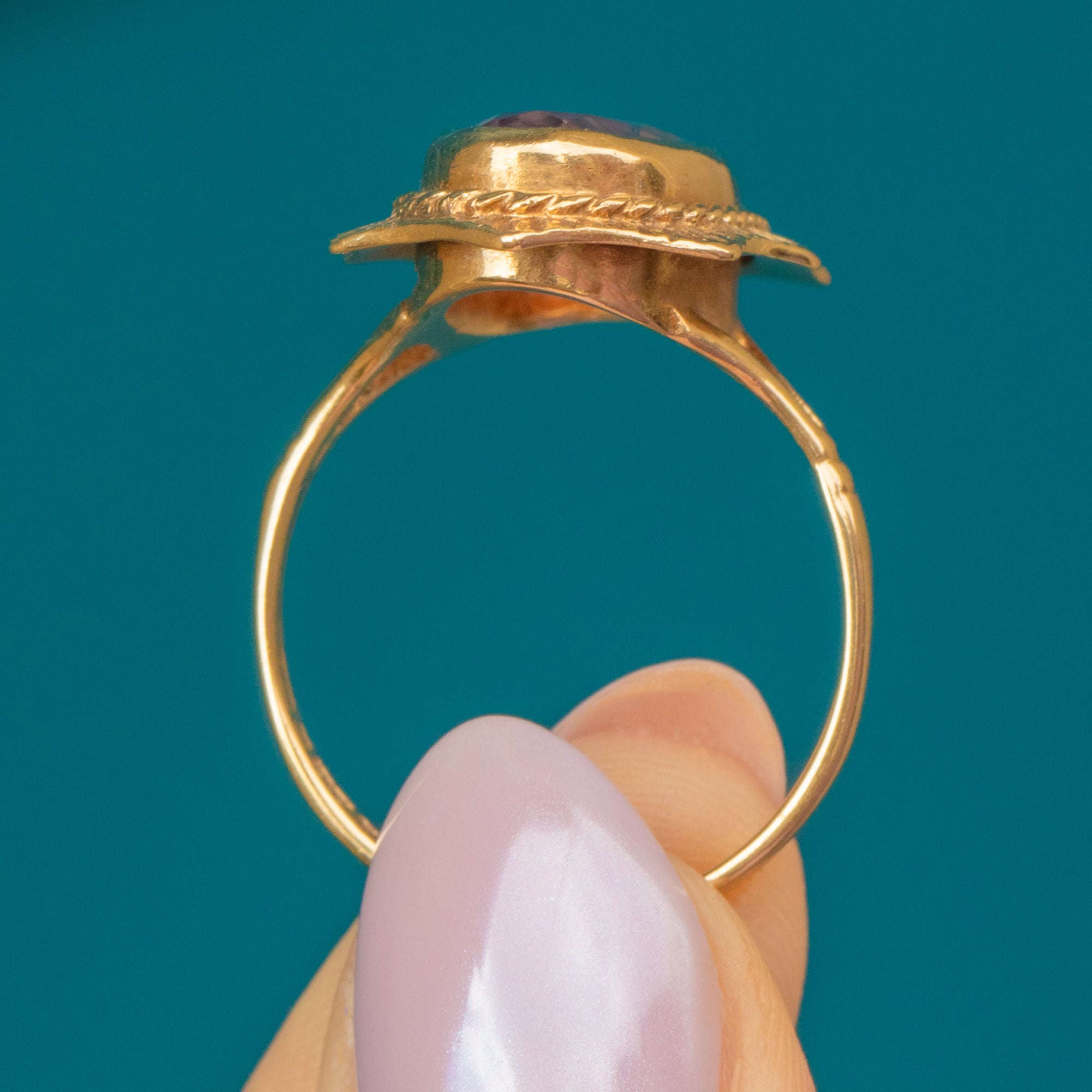 Dated to 1974, this vintage Amethyst ring exudes decadence and luxury, with a rich 9ct Gold forming her thin band that effortlessly flows around your finger. She sits proudly poised upon your hand, allowing you to appreciate her ornate detailing from every angle.