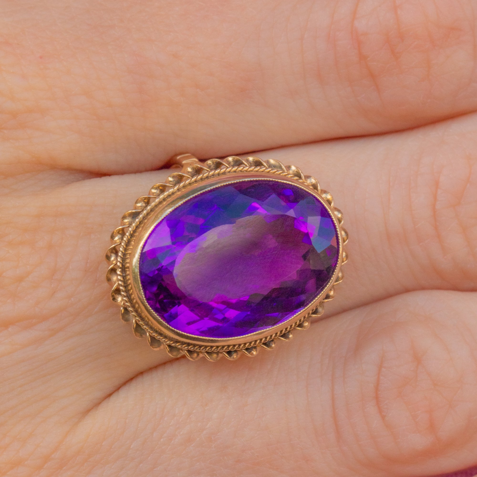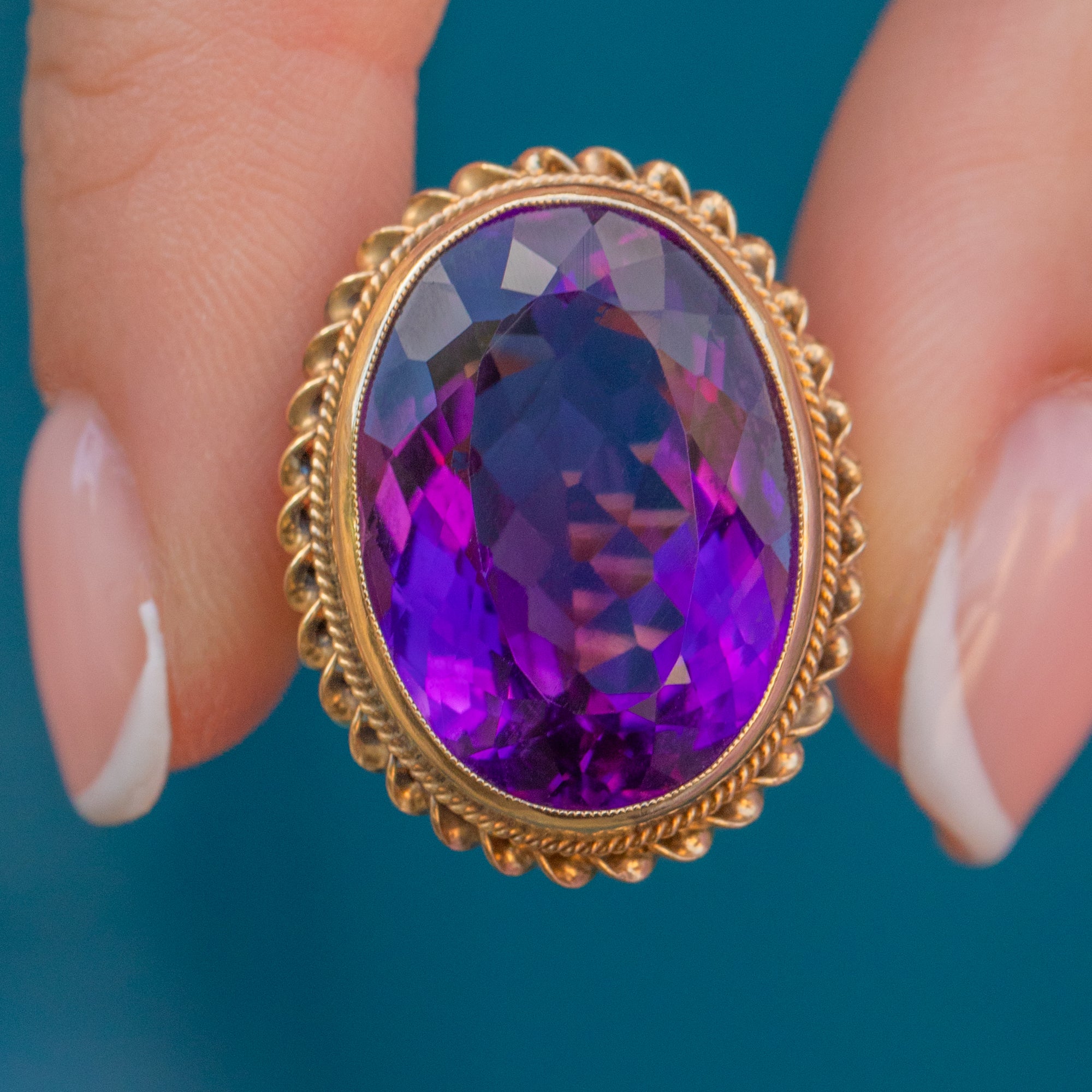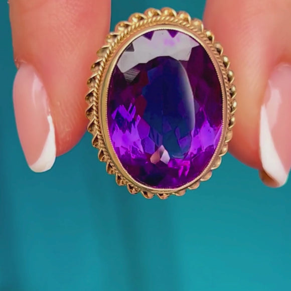 The impressive size of this Vintage Amethyst ring can't go unnoticed too, with her ample finger coverage she requires no additional Gold goodies to style her with. Bound together by buttery 9ct Gold with a rope border, cocktails rings are just as popular today as when first crafted after the prohibition in the 1920's!