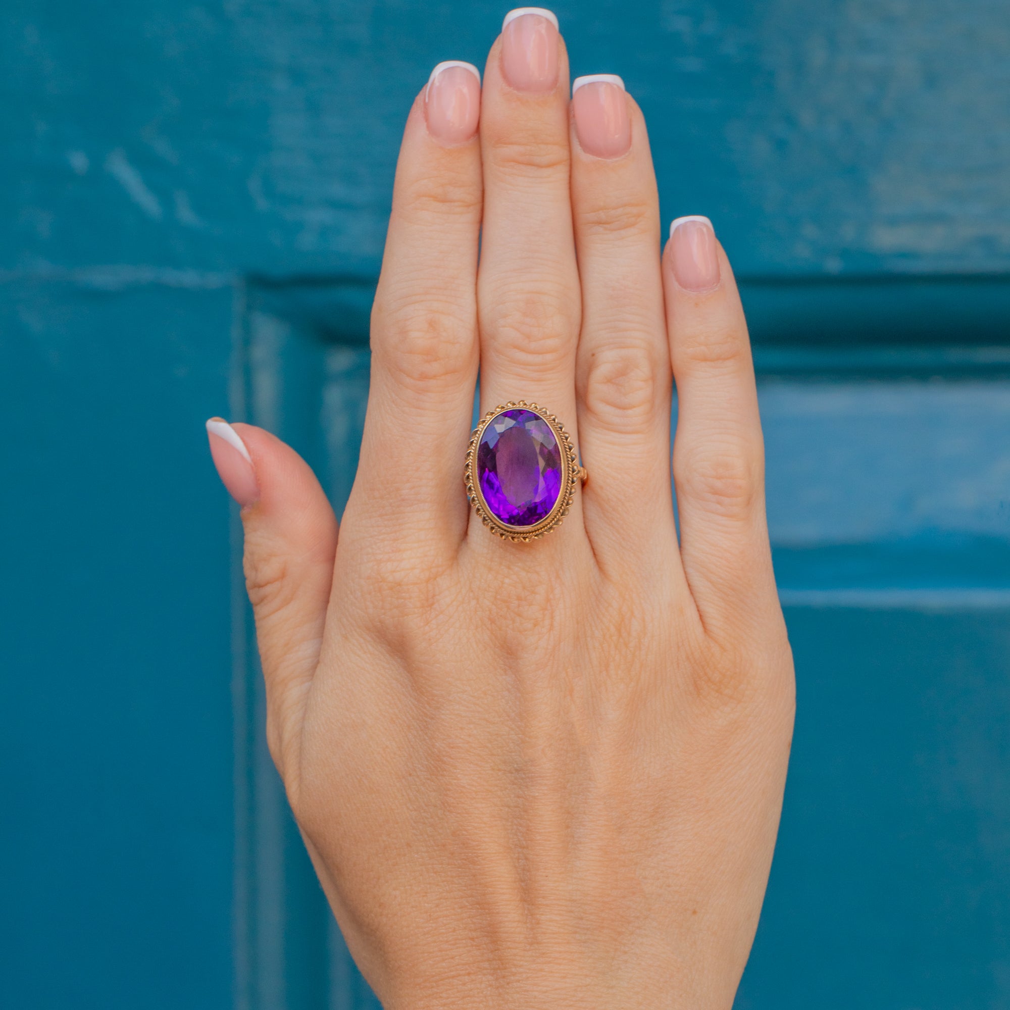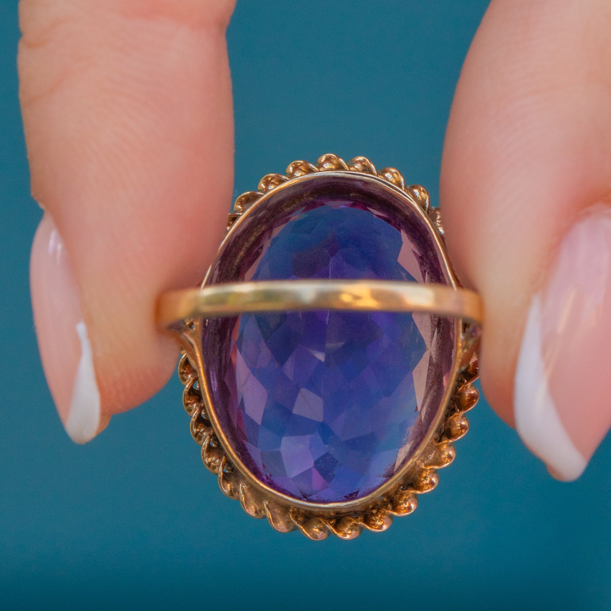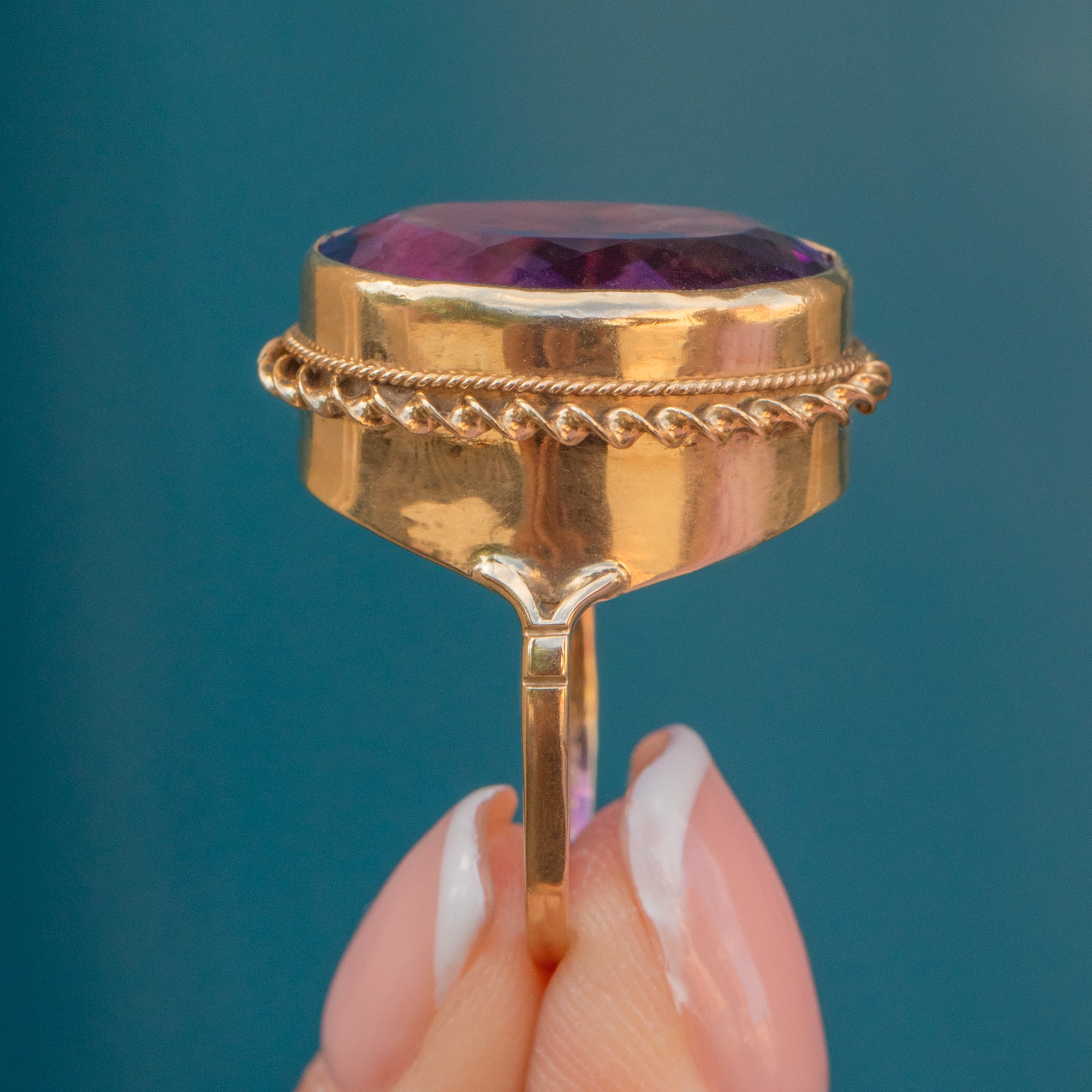The impressive size of this Vintage Amethyst ring can't go unnoticed too, with her ample finger coverage she requires no additional Gold goodies to style her with. Bound together by buttery 9ct Gold with a rope border, cocktails rings are just as popular today as when first crafted after the prohibition in the 1920's!