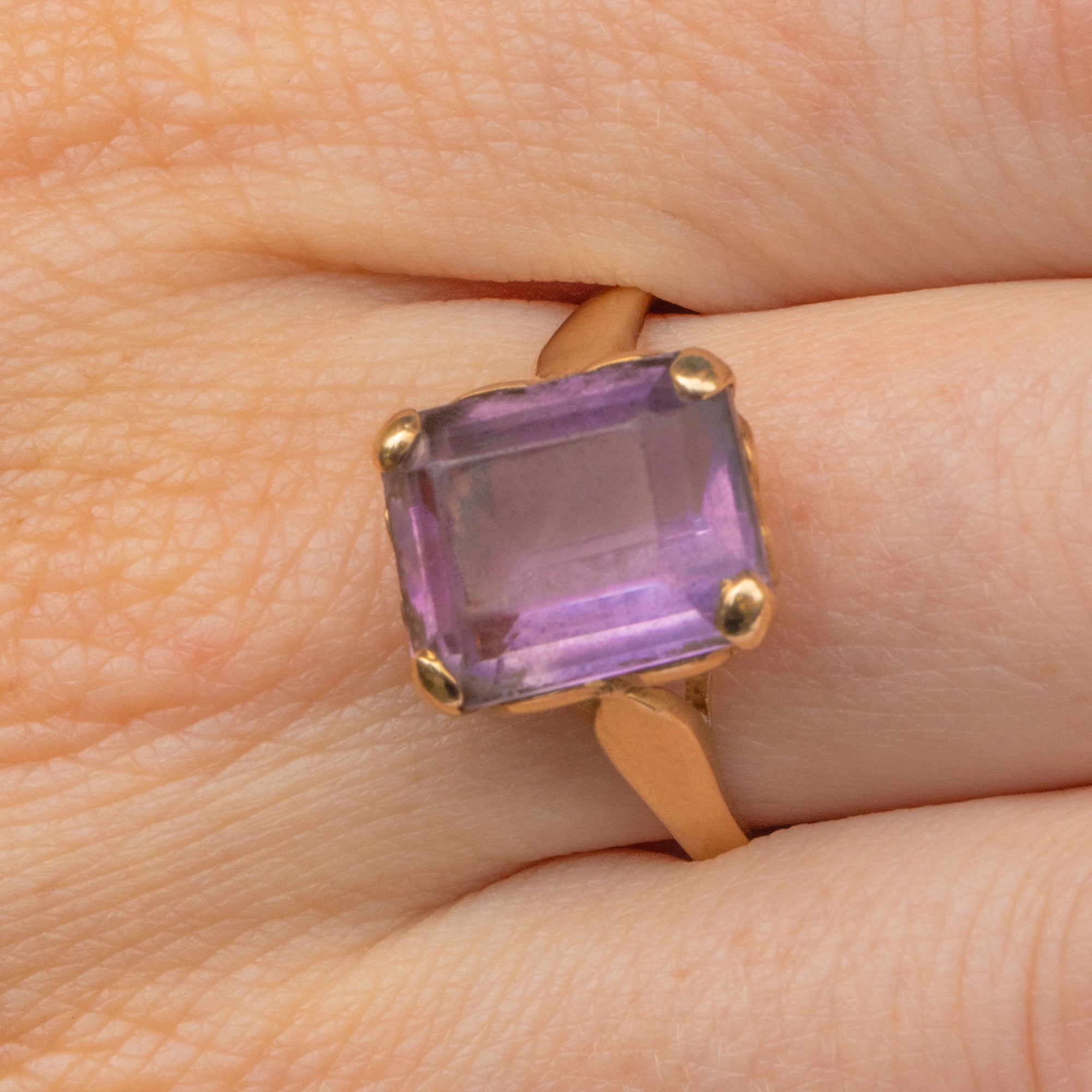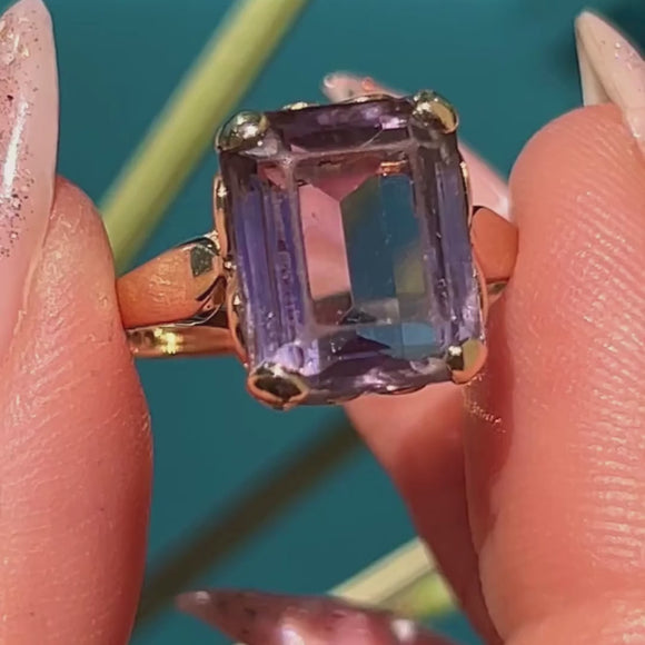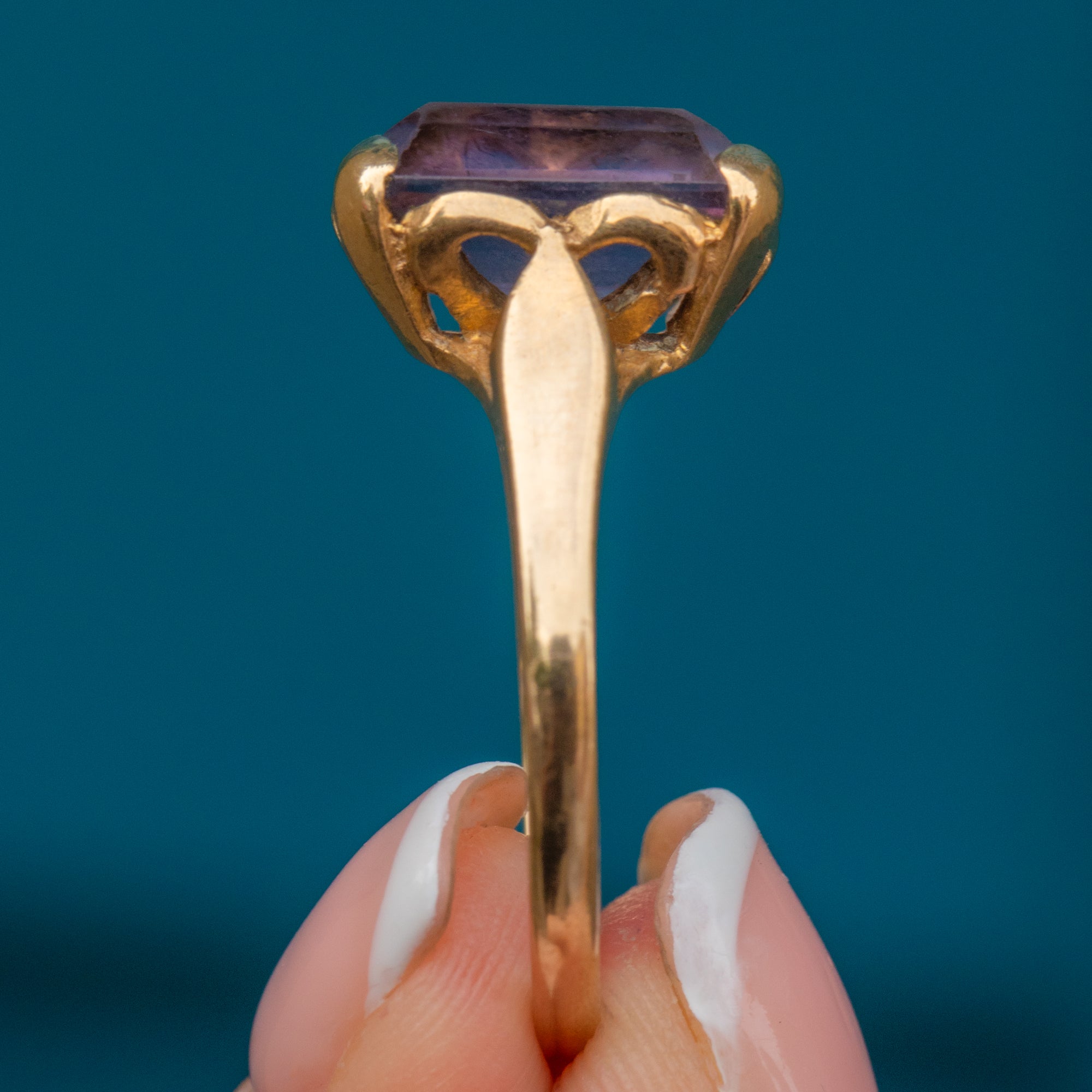VERY GOOD. This 9ct Gold Amethyst cocktail ring is in very good condition. Securely set in her four claw settings, her Amethyst is rich in colour, with only slight surface wear commensurate with age. The 9ct Gold band has retained its shape well and flaunts a gorgeous honey hue throughout. She is the perfect vintage Amethyst ring to add a kick of colour to any attire.