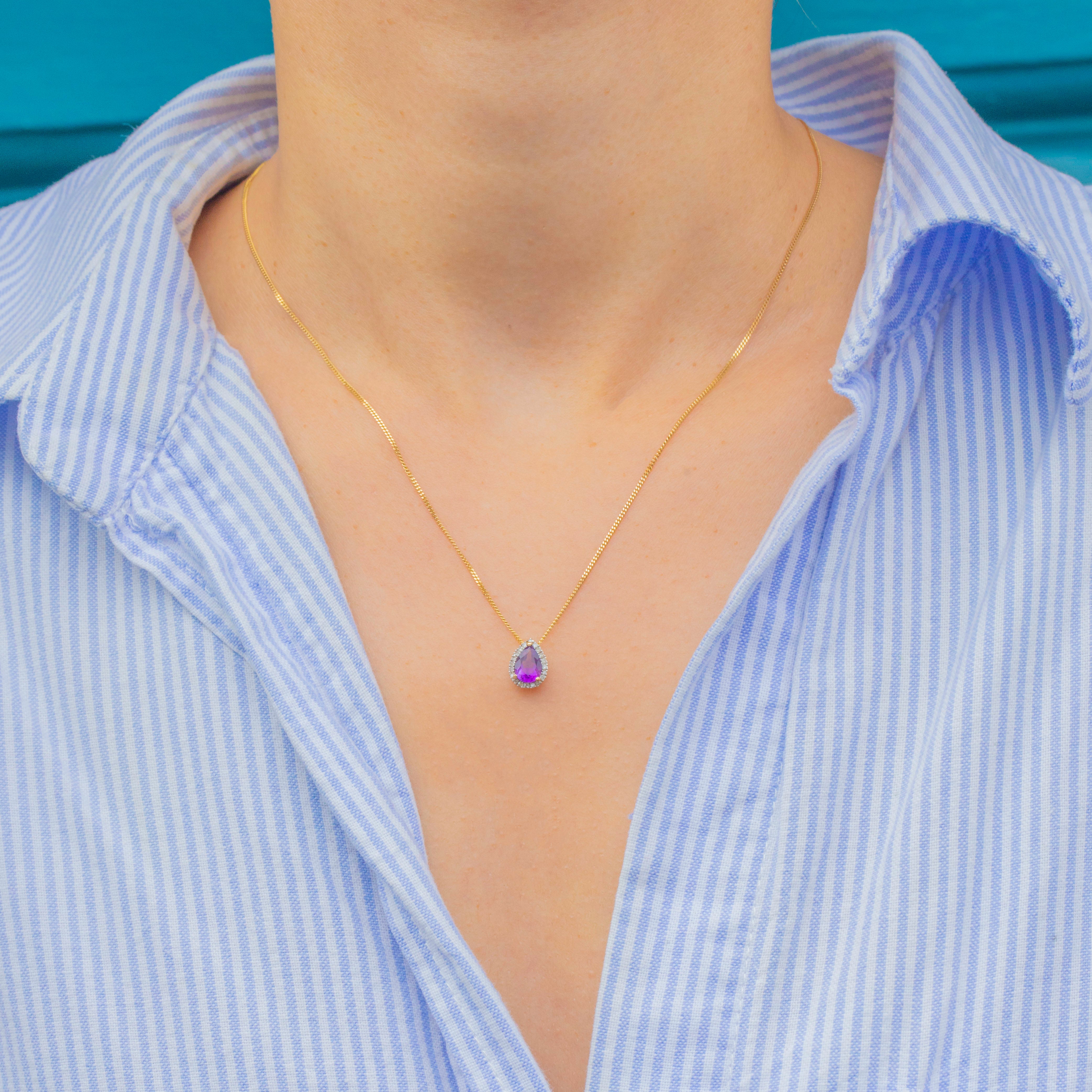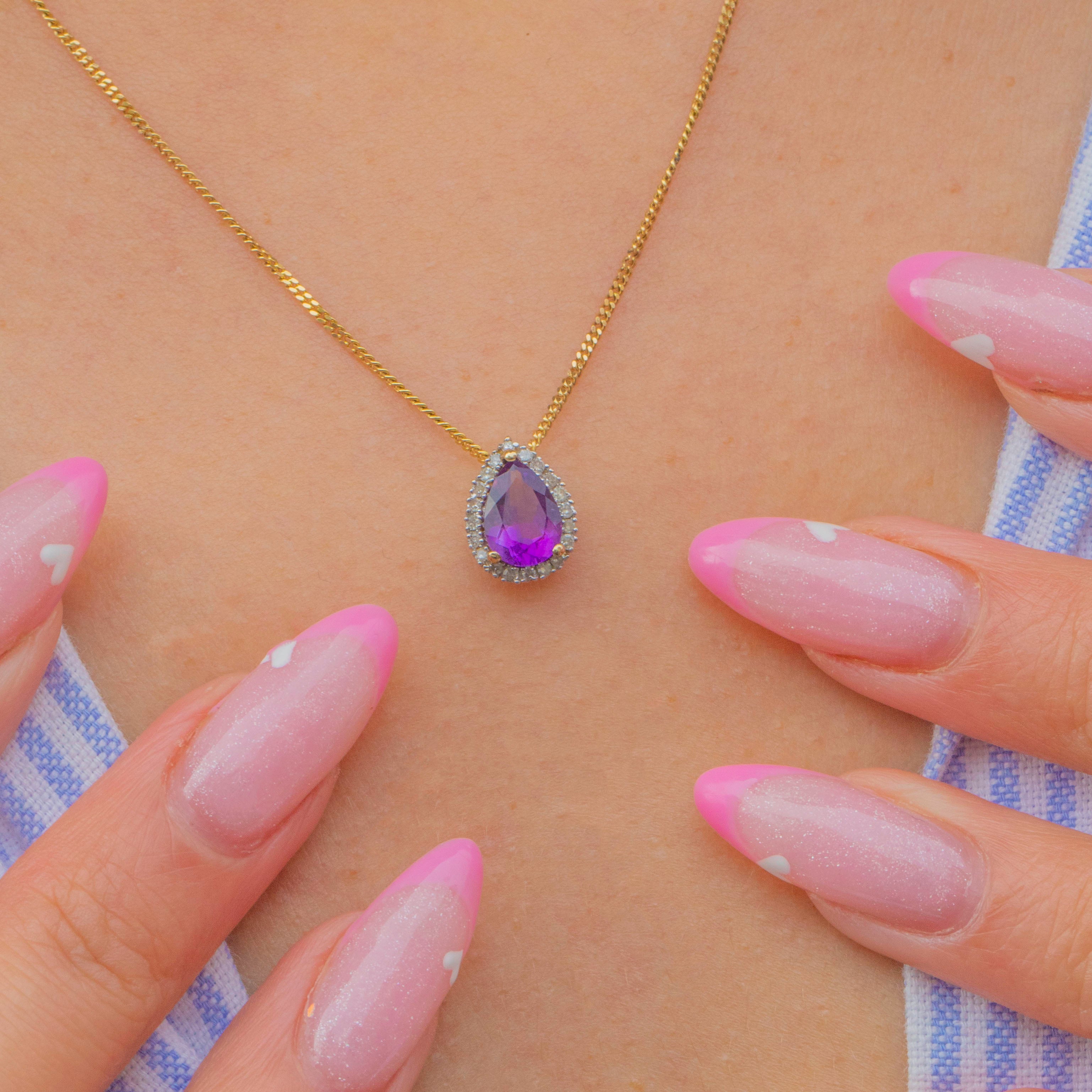This elegant pendant features a vibrant pear-cut Amethyst framed by a sparkling Diamond halo, set in 9ct Yellow Gold with contrasting 9ct White Gold Diamond settings for added brilliance. The rich purple hue of the Amethyst glows beautifully, complemented by the fine 18" curb chain that completes the look.