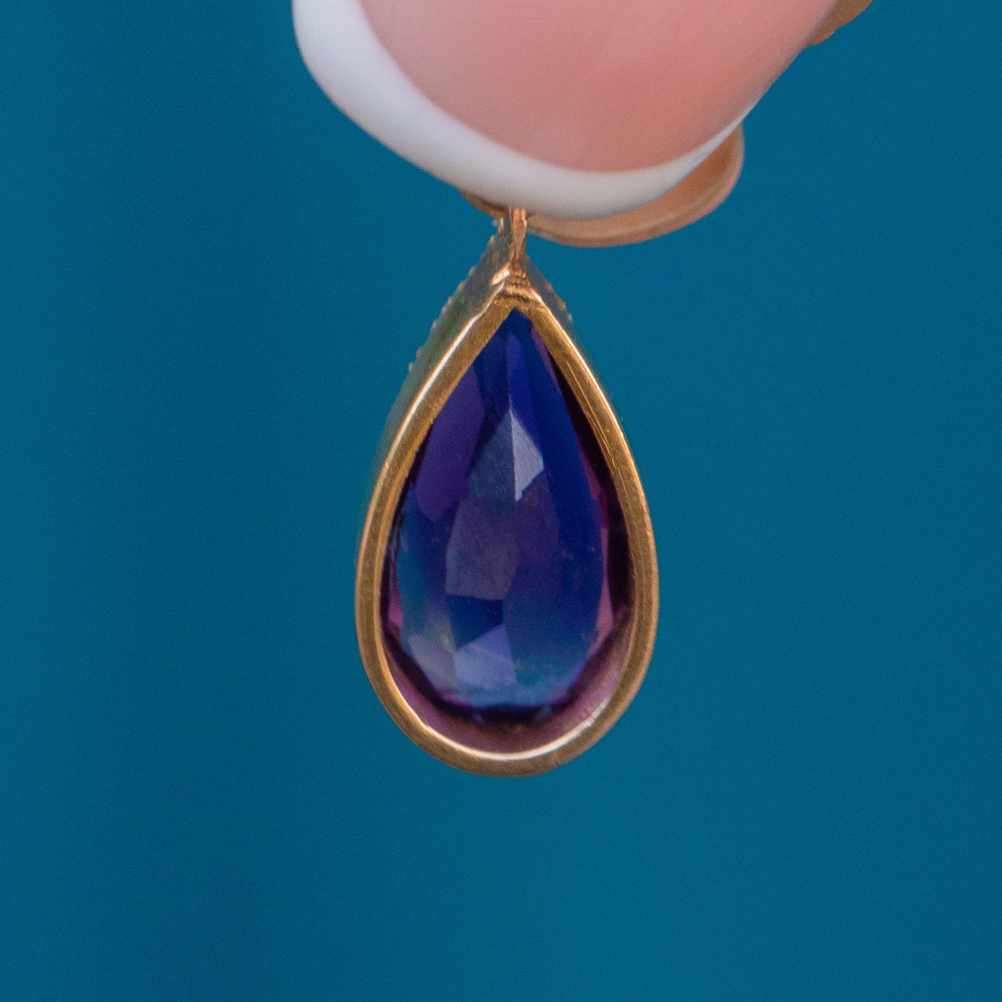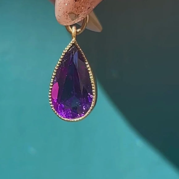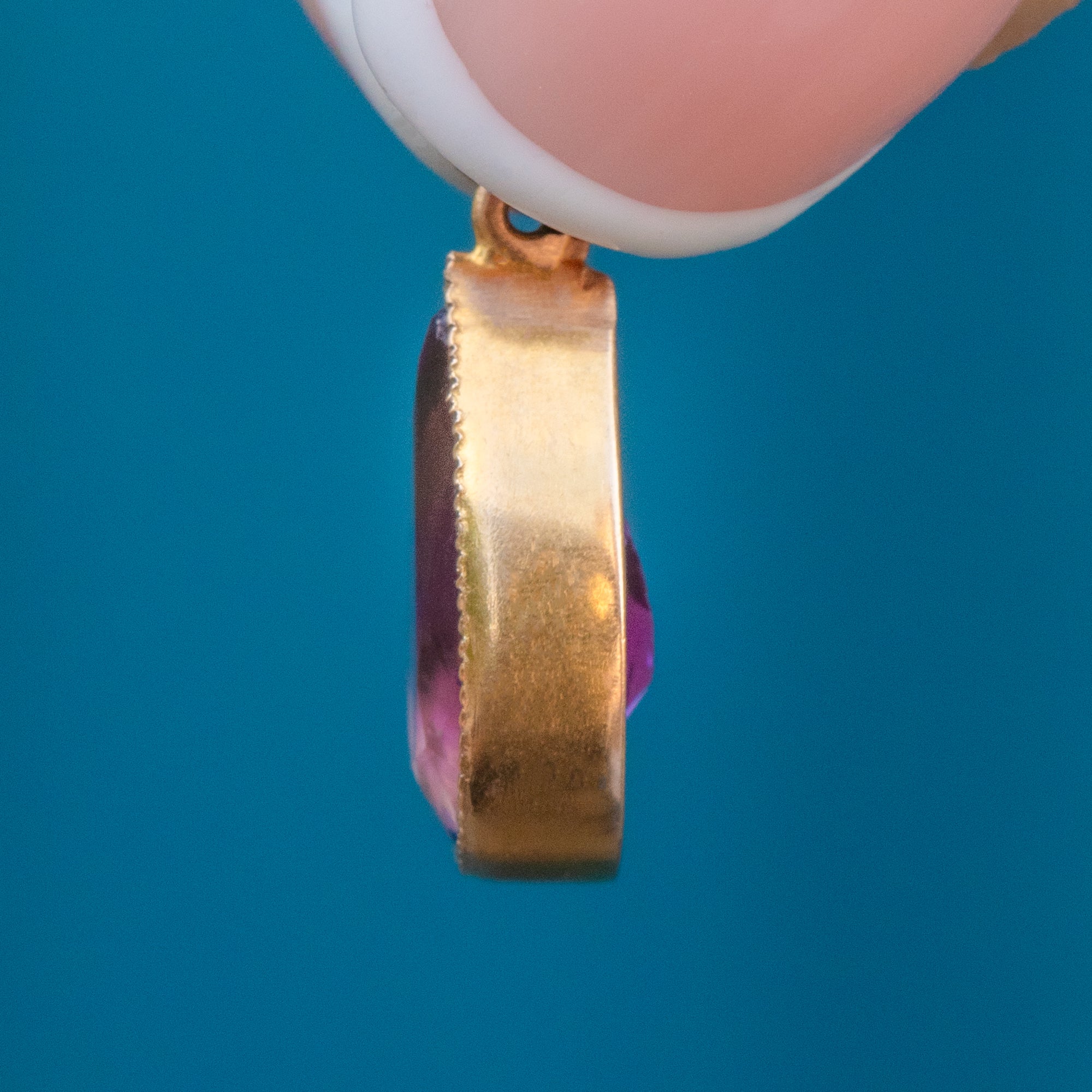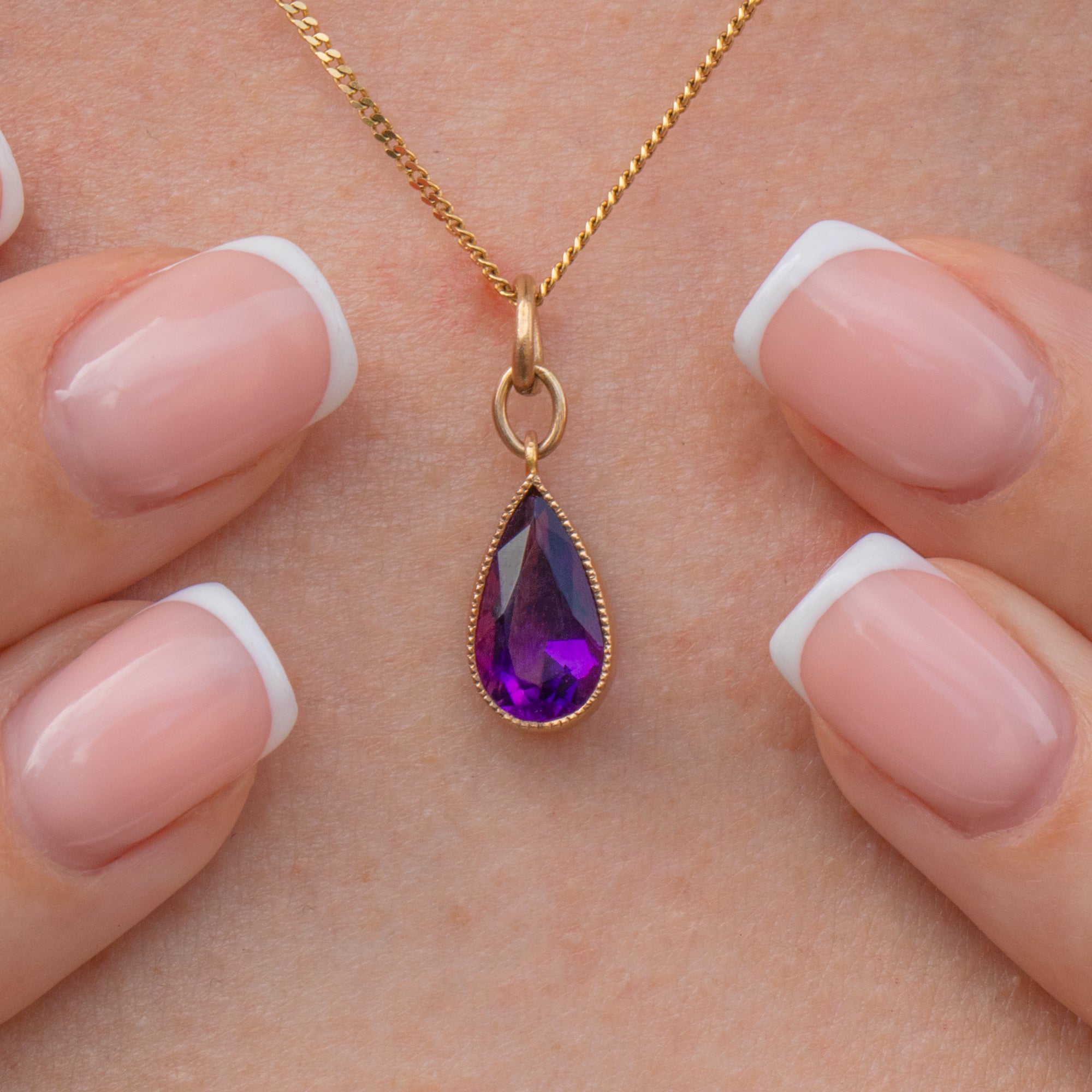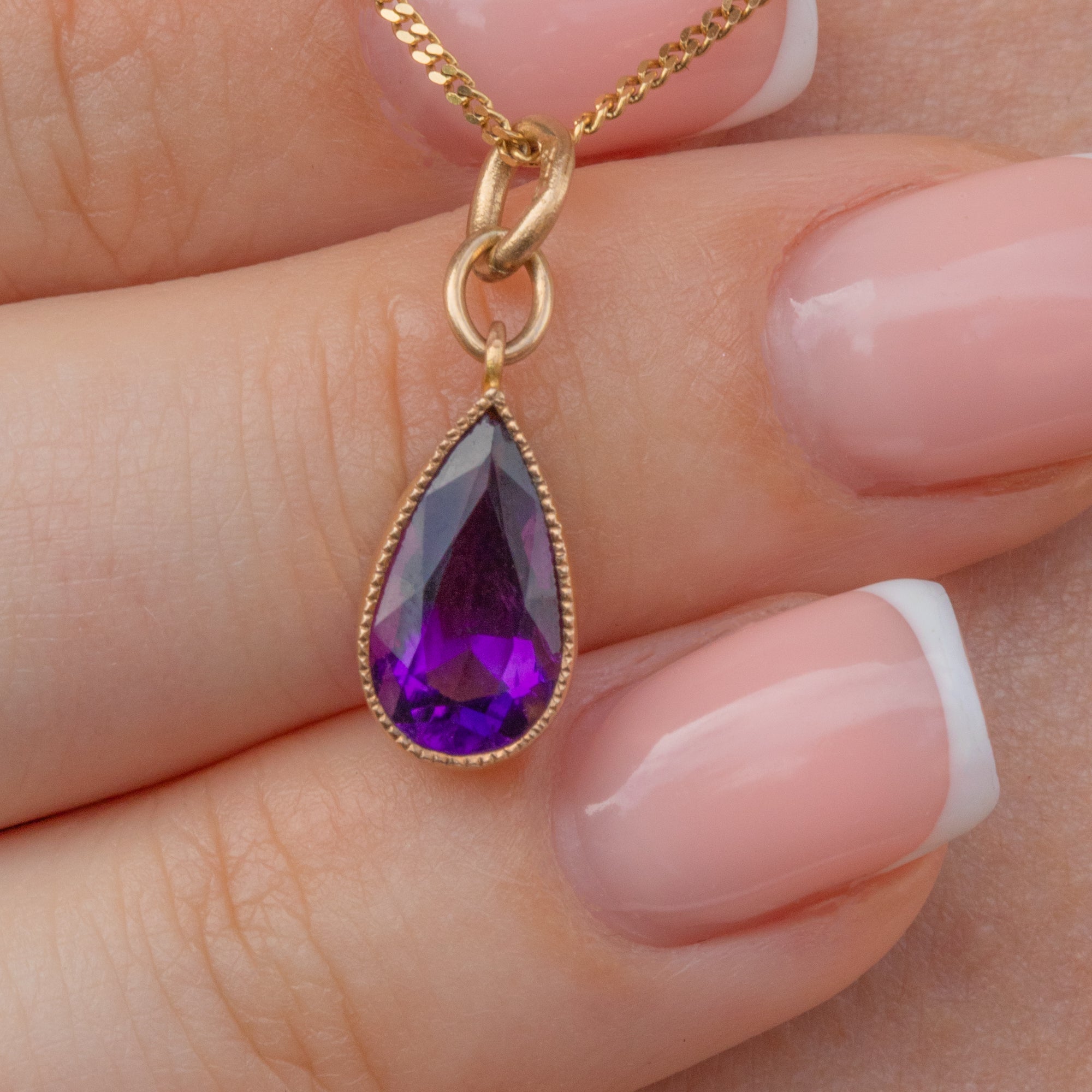 VERY GOOD-EXCELLENT. This 9ct Gold Amethyst pear drop pendant is in very good to excellent condition overall! This treasure can be worn with a Gold chain effortlessly, with her generously sized jump ring. The Amethyst has a lovely colour, it does have one very, very small nibble mark to the tip of the Amethyst but nothing untoward. There is minimal wear to note, which makes it a fabulous investment for your collection!