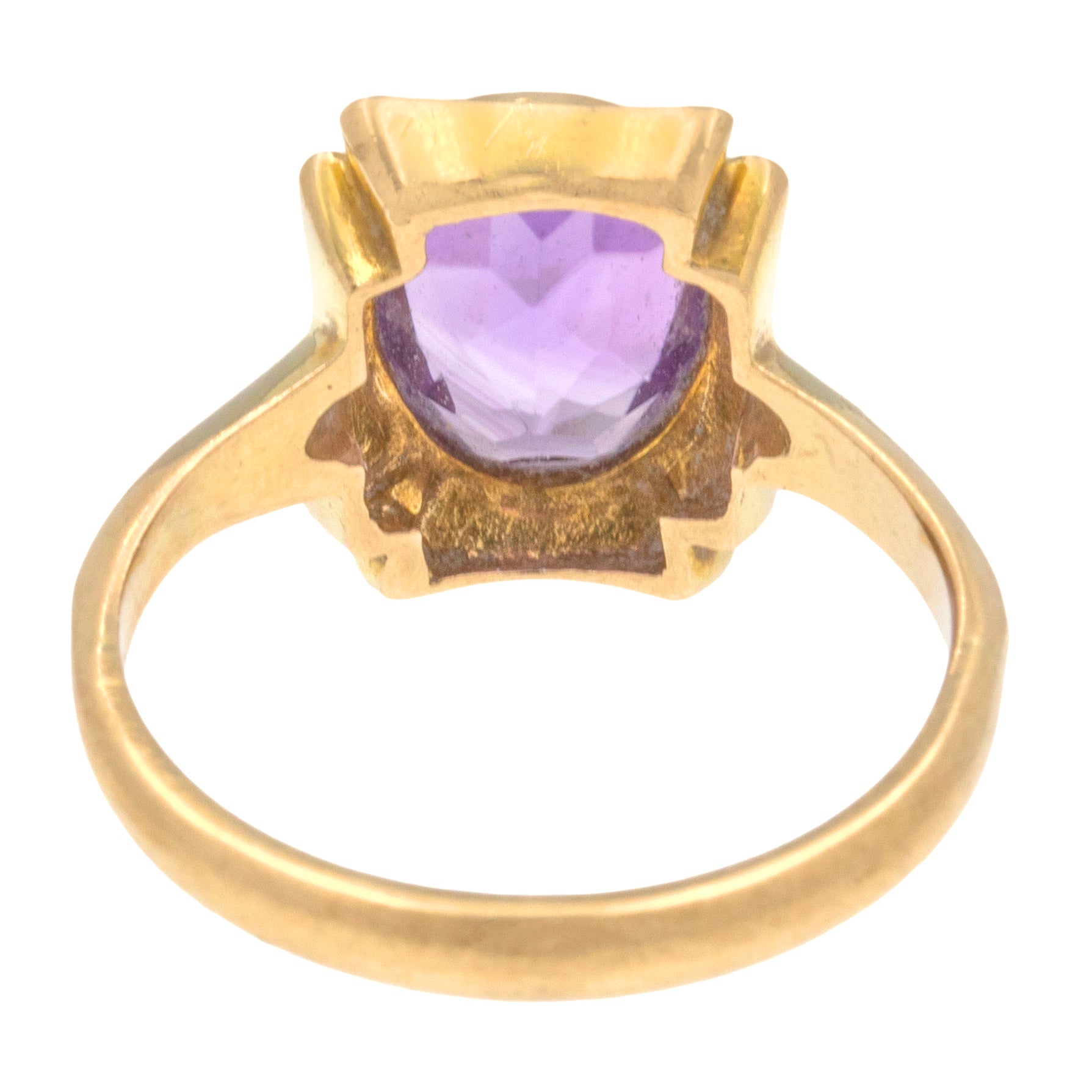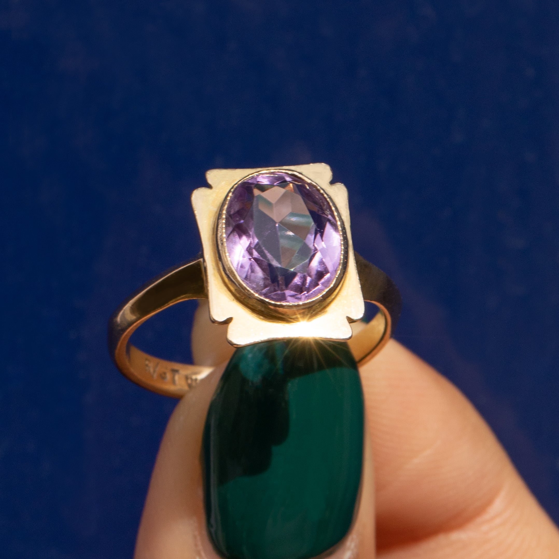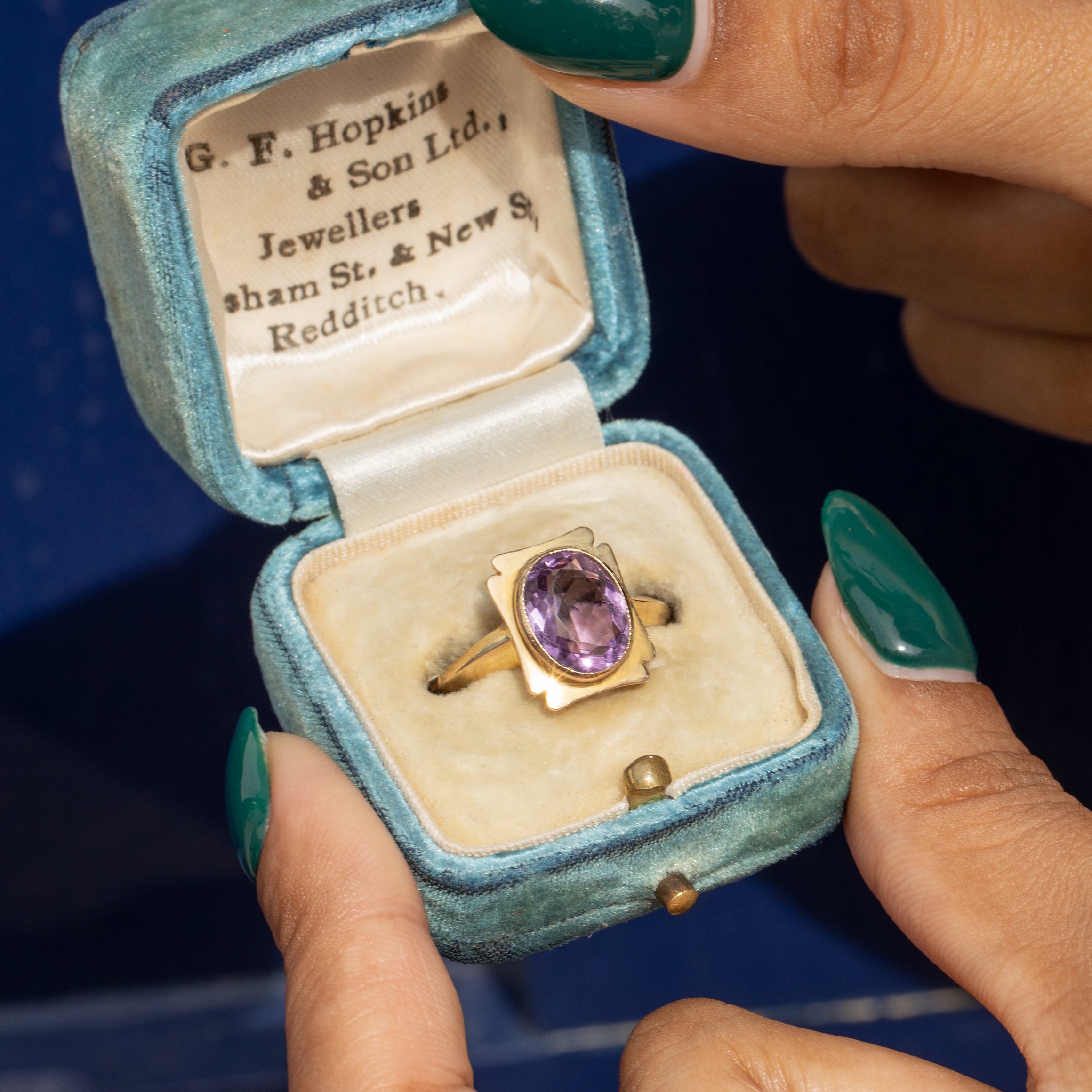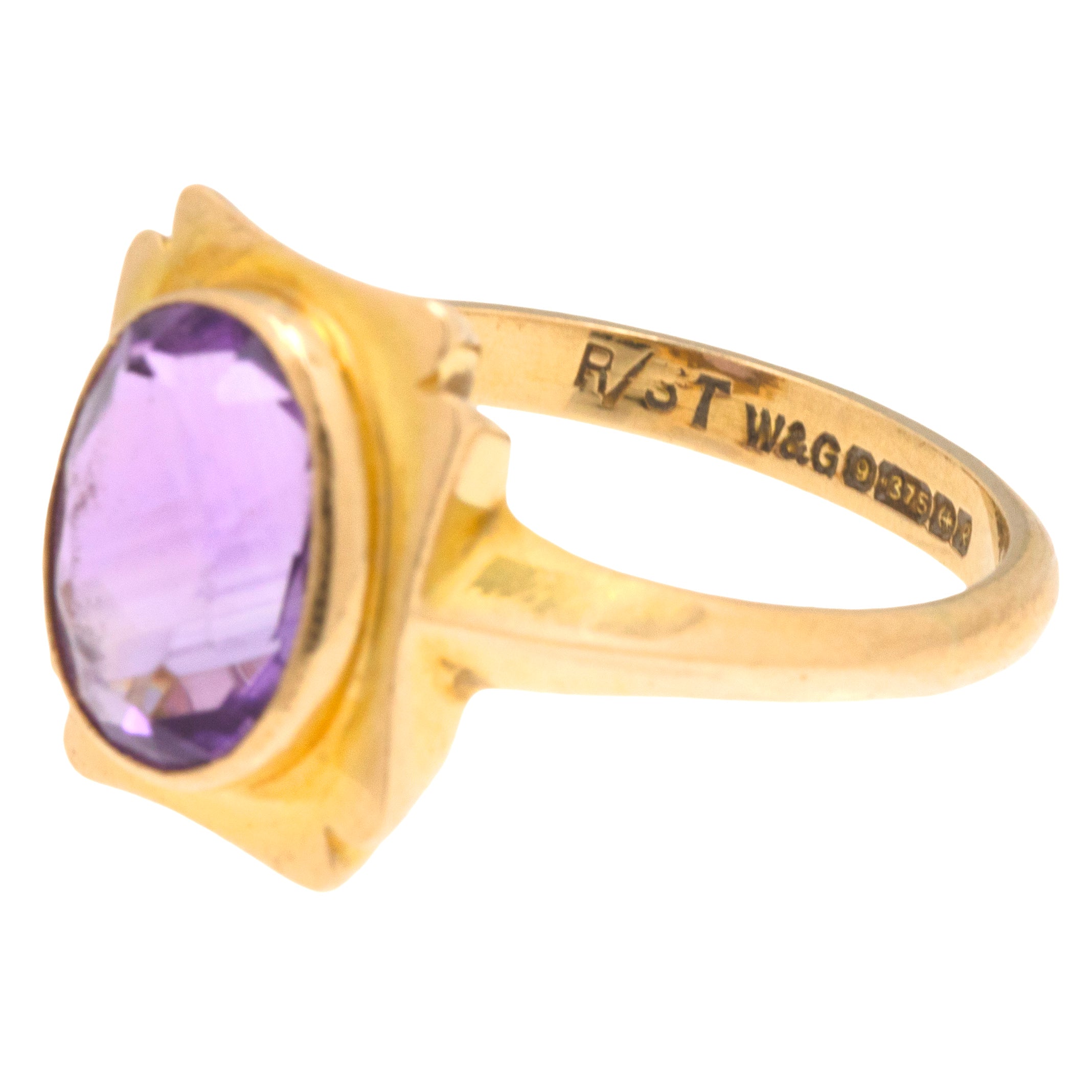 EXCELLENT. This 9ct Gold Amethyst ring is in excellent condition! The Amethyst is secure within its bezel, the 9ct Gold is rich in saturation with no dings or dents to note. The band is robust and comes complete with a full set of hallmarks allowing us to accurately date this piece to 1991!