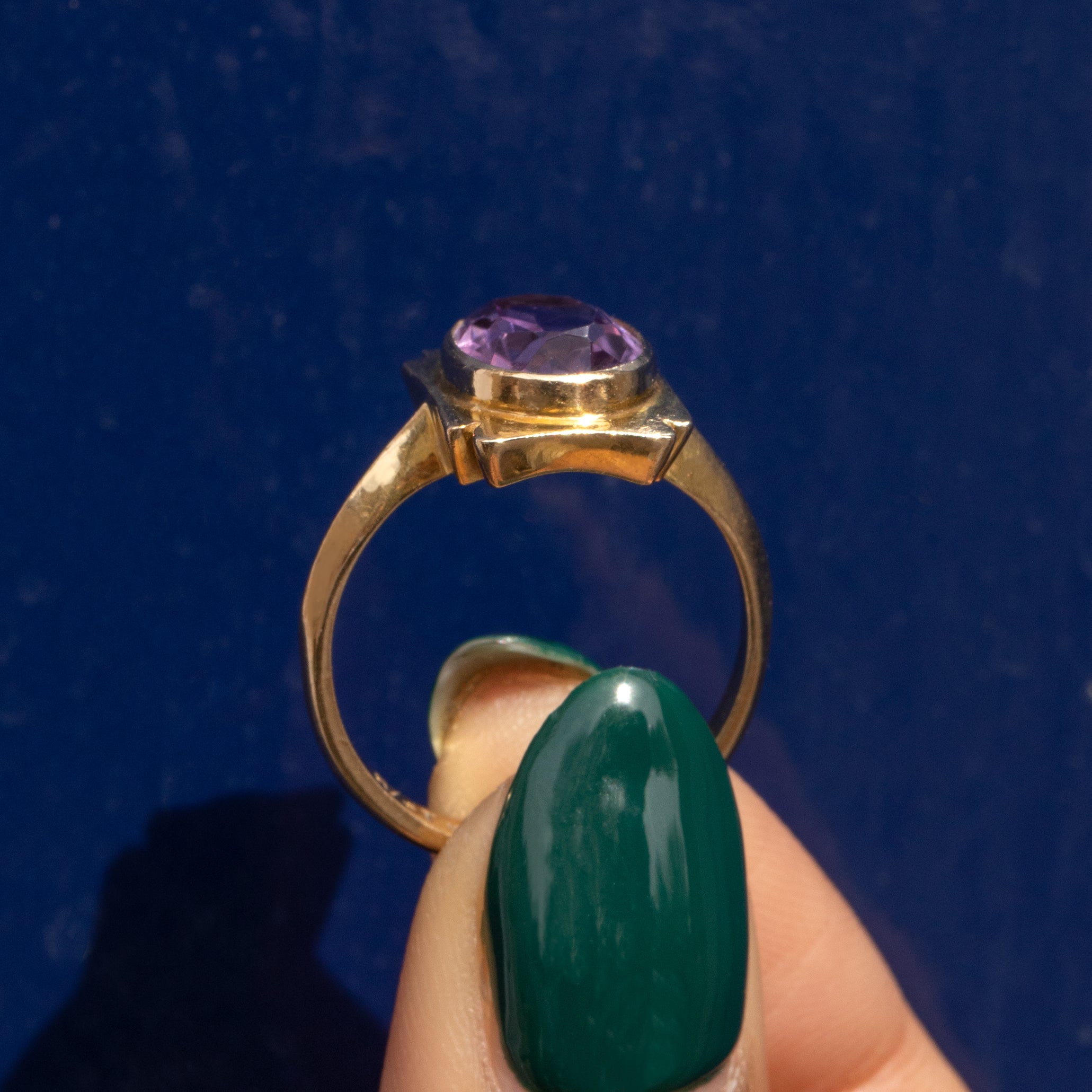 This 9ct Gold Amethyst ring is an absolute delight! A 1.40ct Amethyst sits centre stage with glistens of periwinkle emanating from her lilac core.