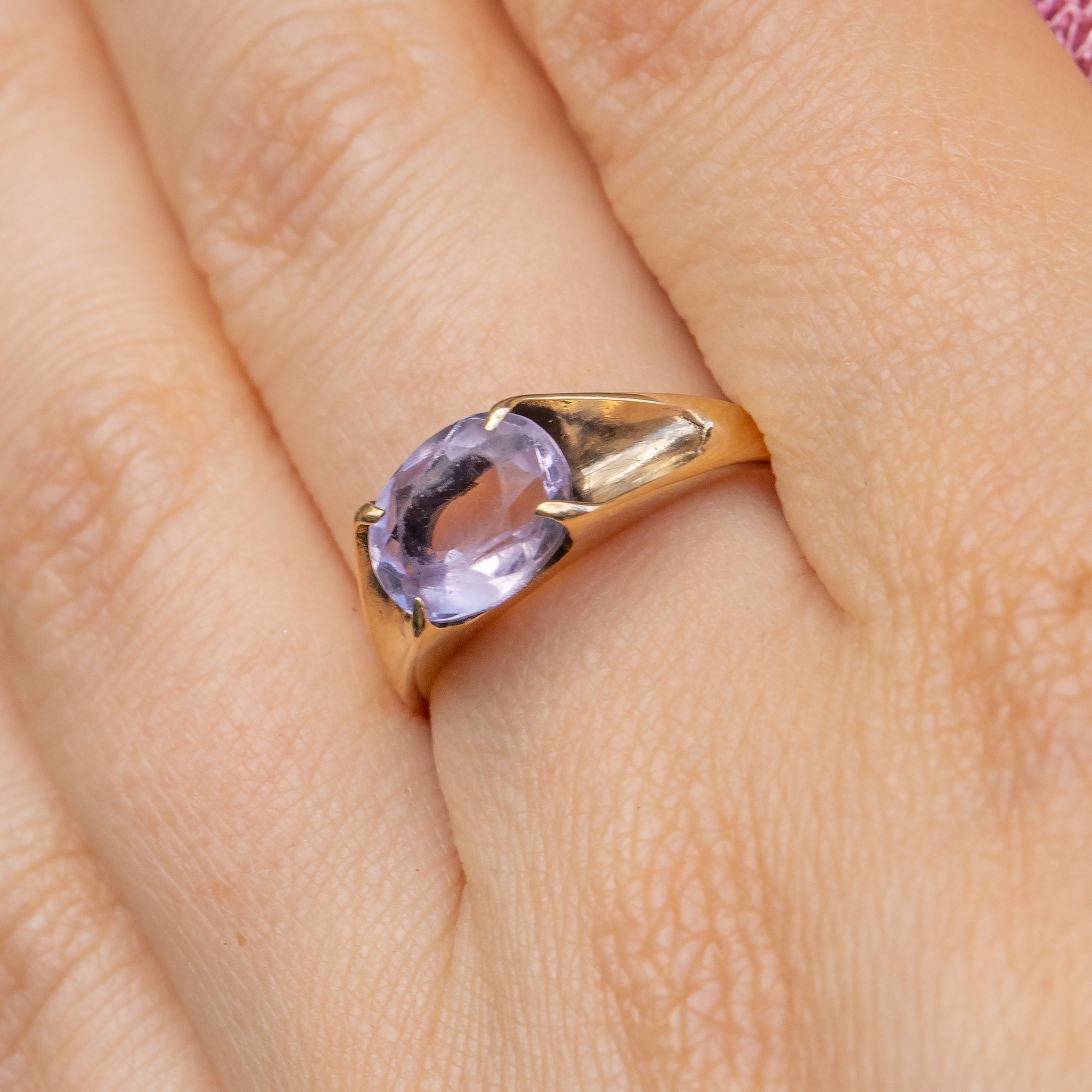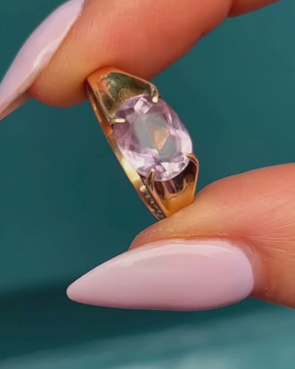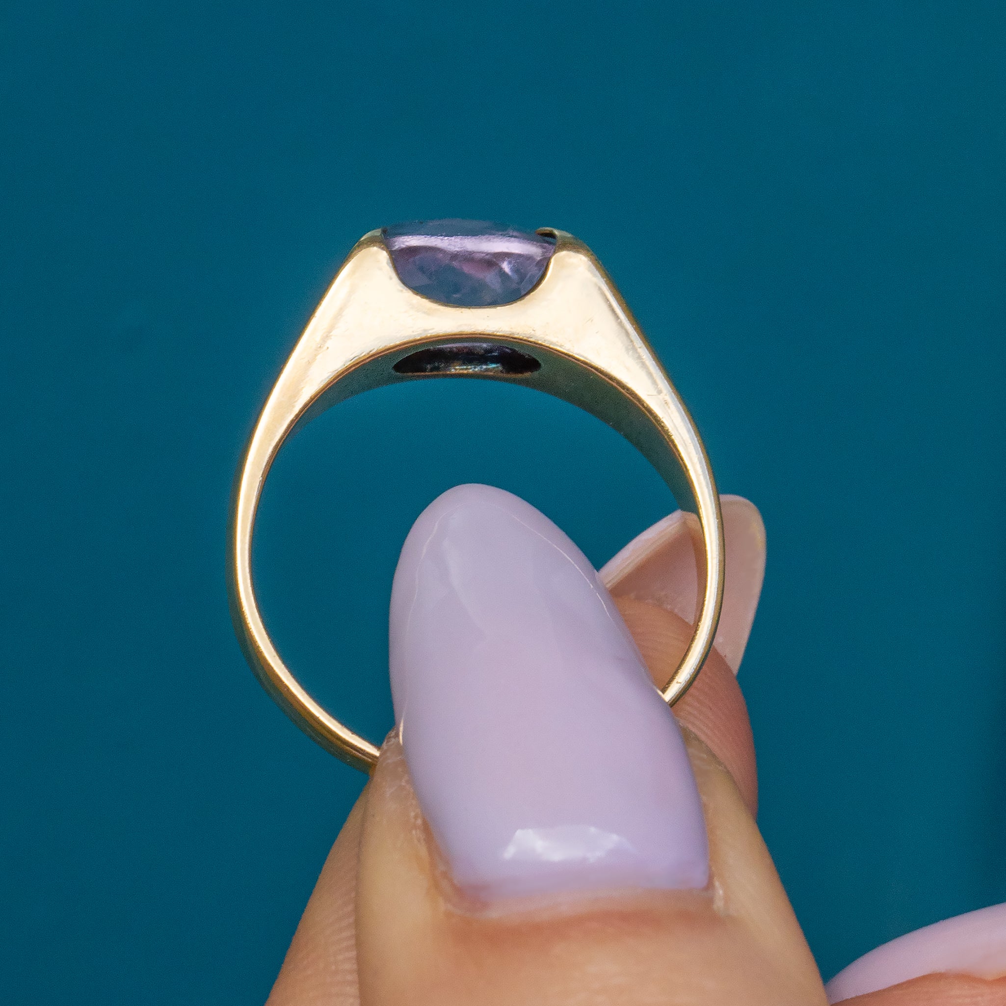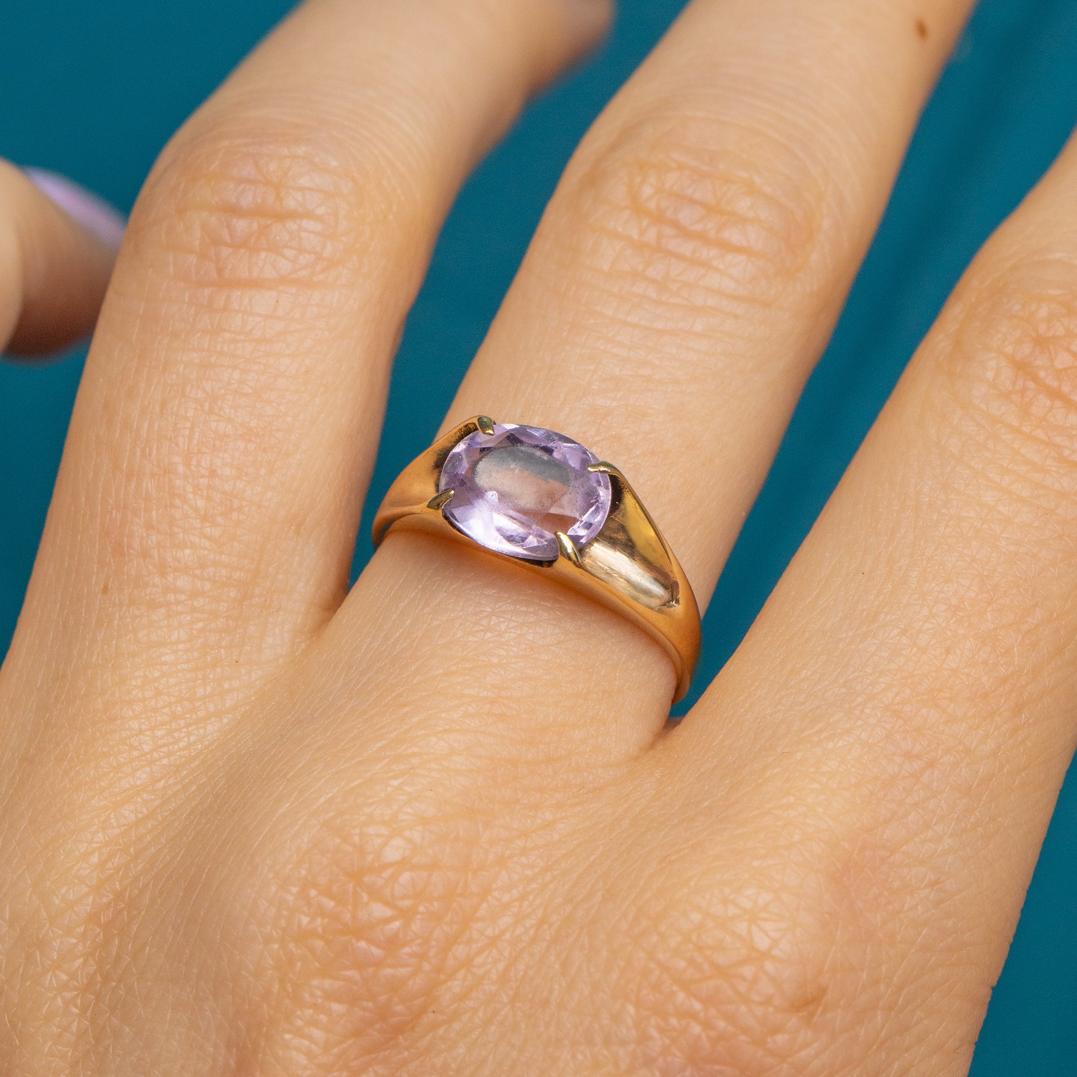 VERY GOOD. This 9ct Gold Amethyst ring is in very good condition! The Amethyst is secure within her sleek settings and the raised profile will bring character to your ring stack. The Amethyst does have some subtle wear to the facets, but this does not affect her sparkle. The ring band is a comfortable fit and can be worn with absolute confidence!