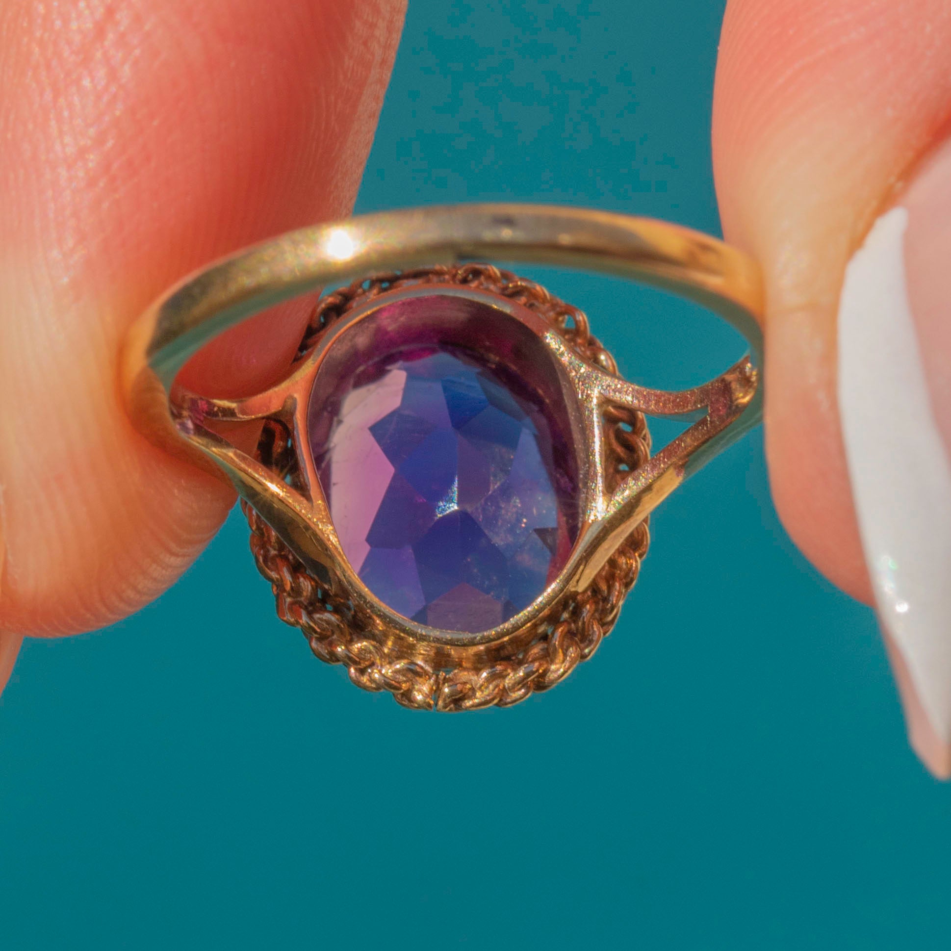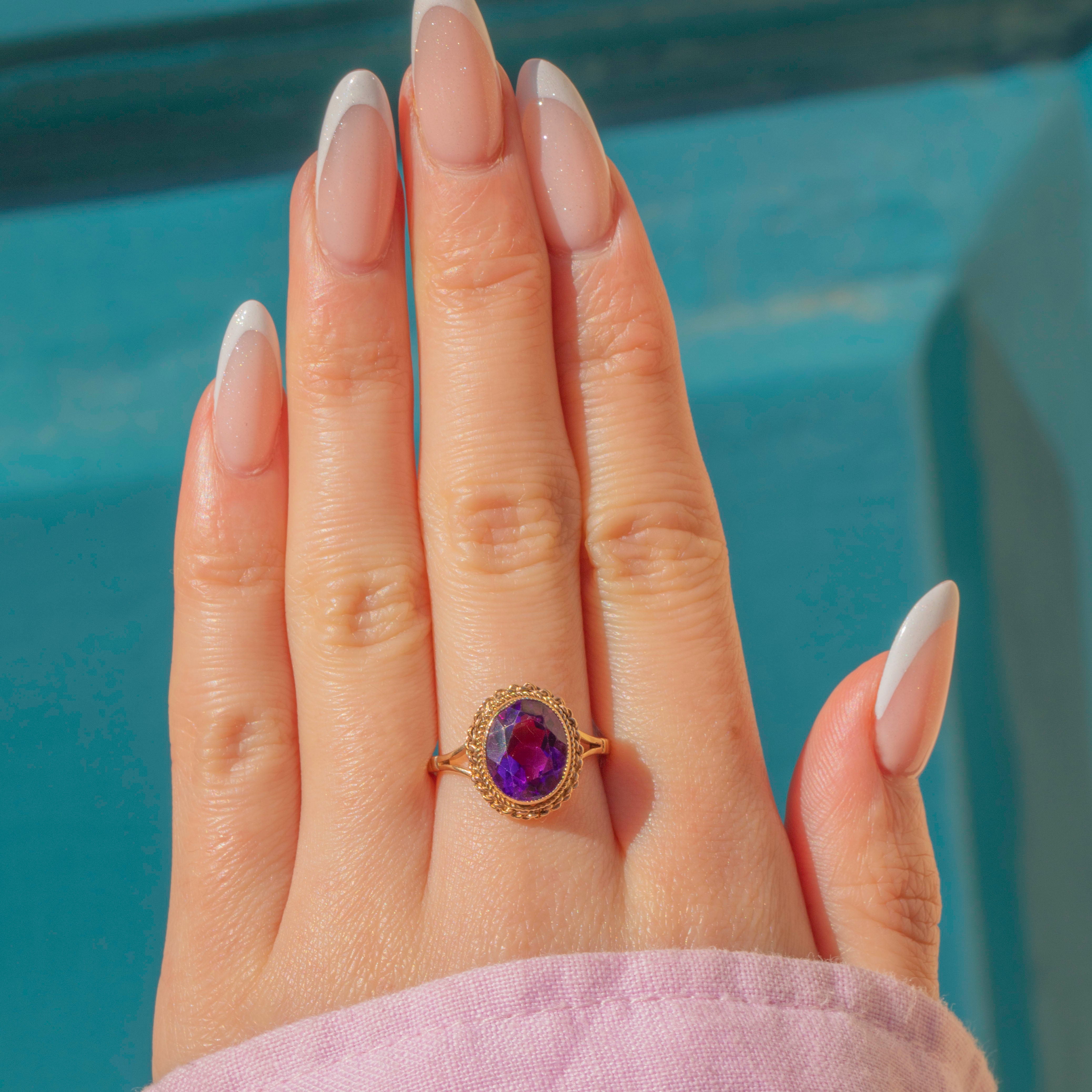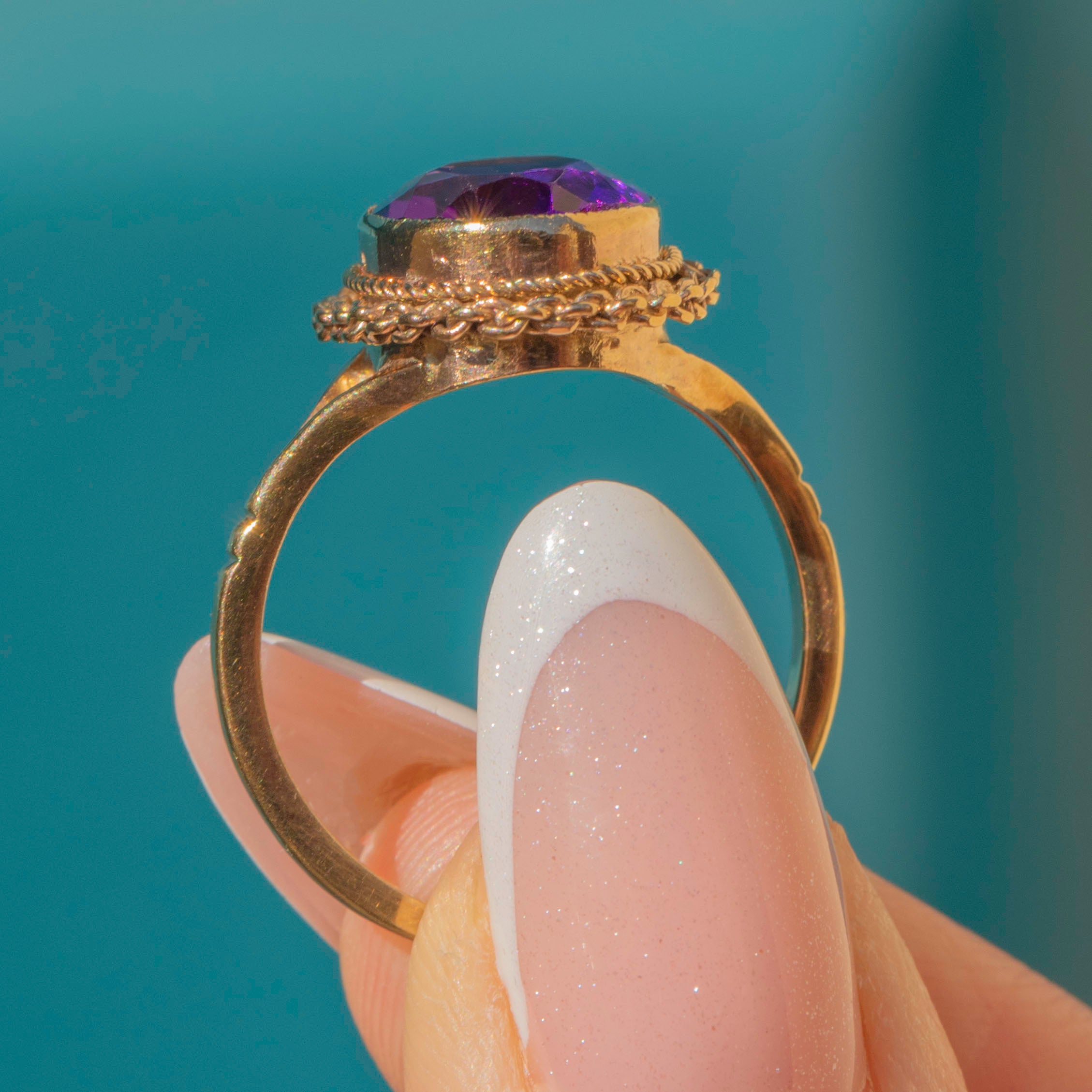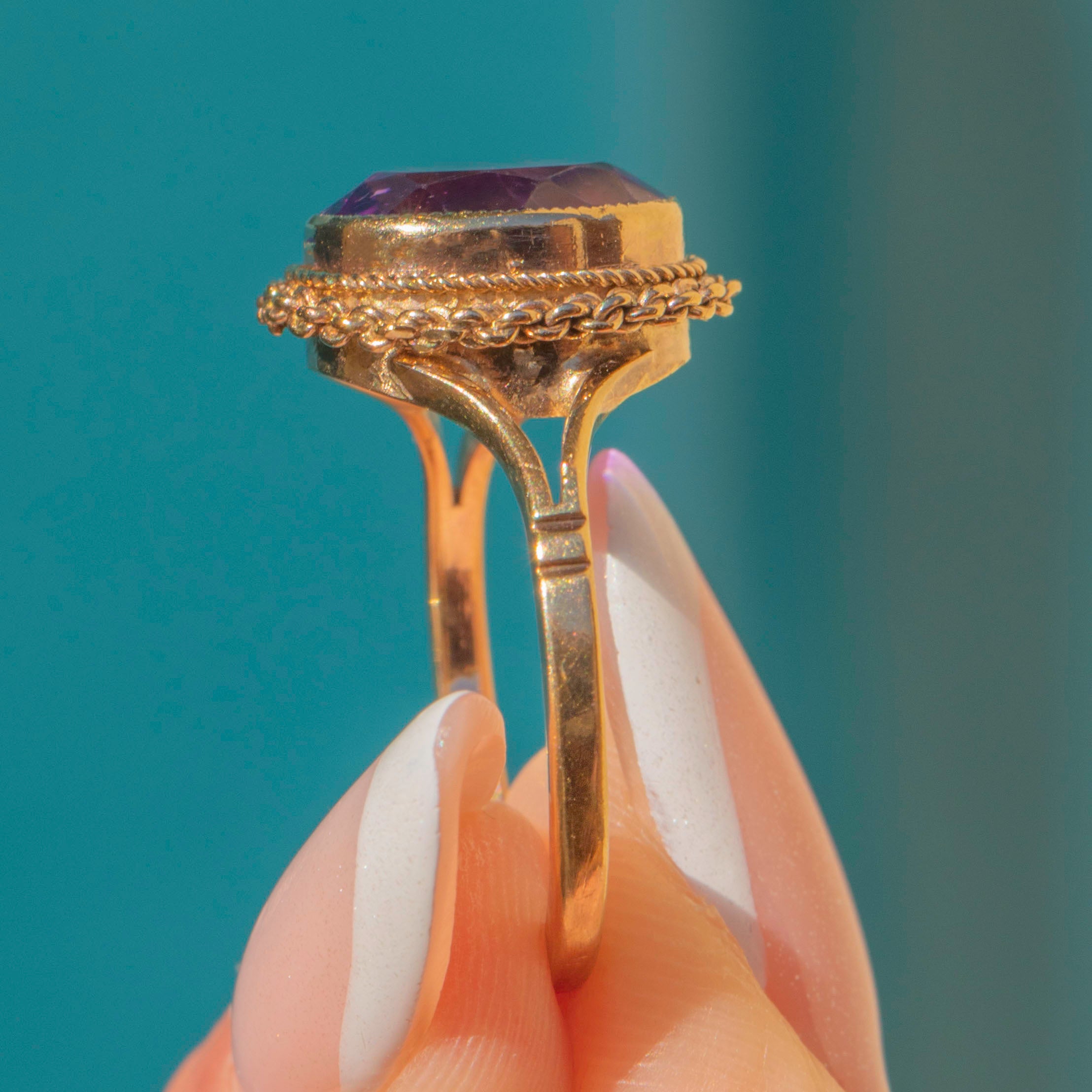 Sophisticated and timeless, her ring face boasts a gorgeously high profile, complete with a twisted rope border. This vintage Amethyst ring would make a divine gift for a friend or the perfect treat for yourself!