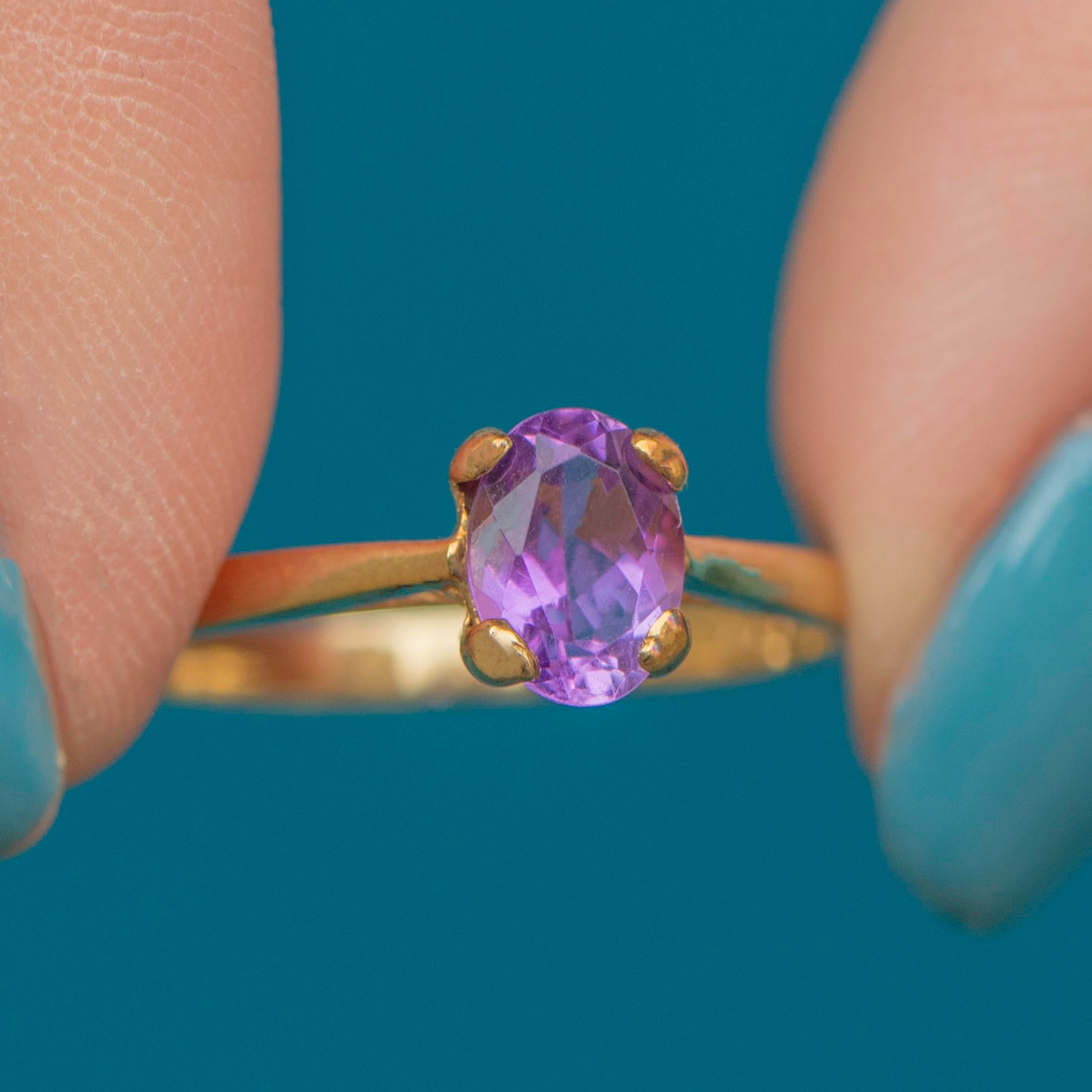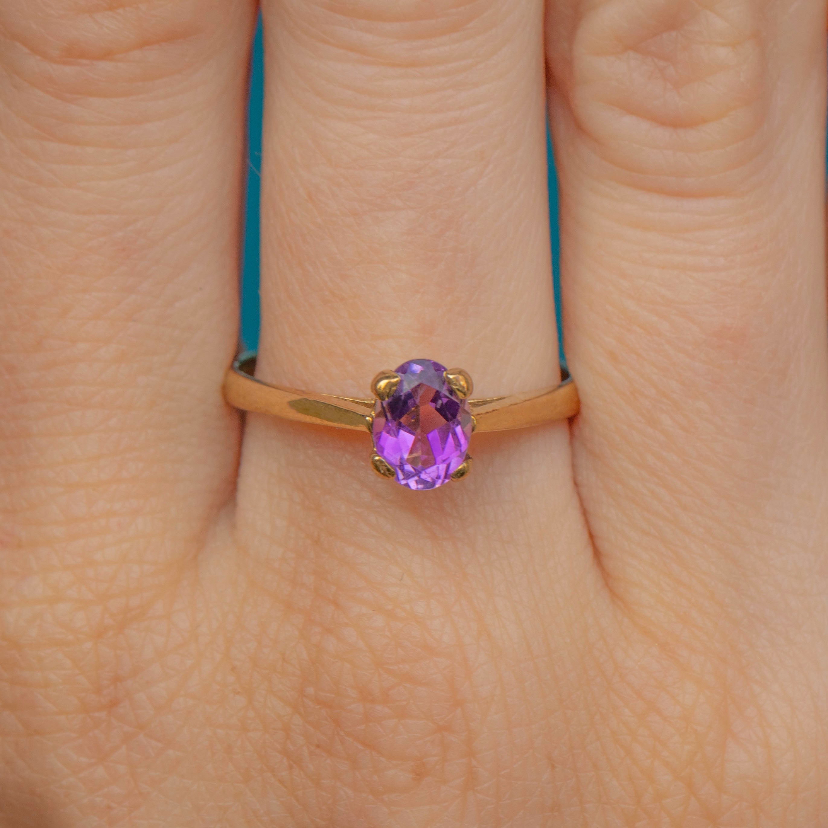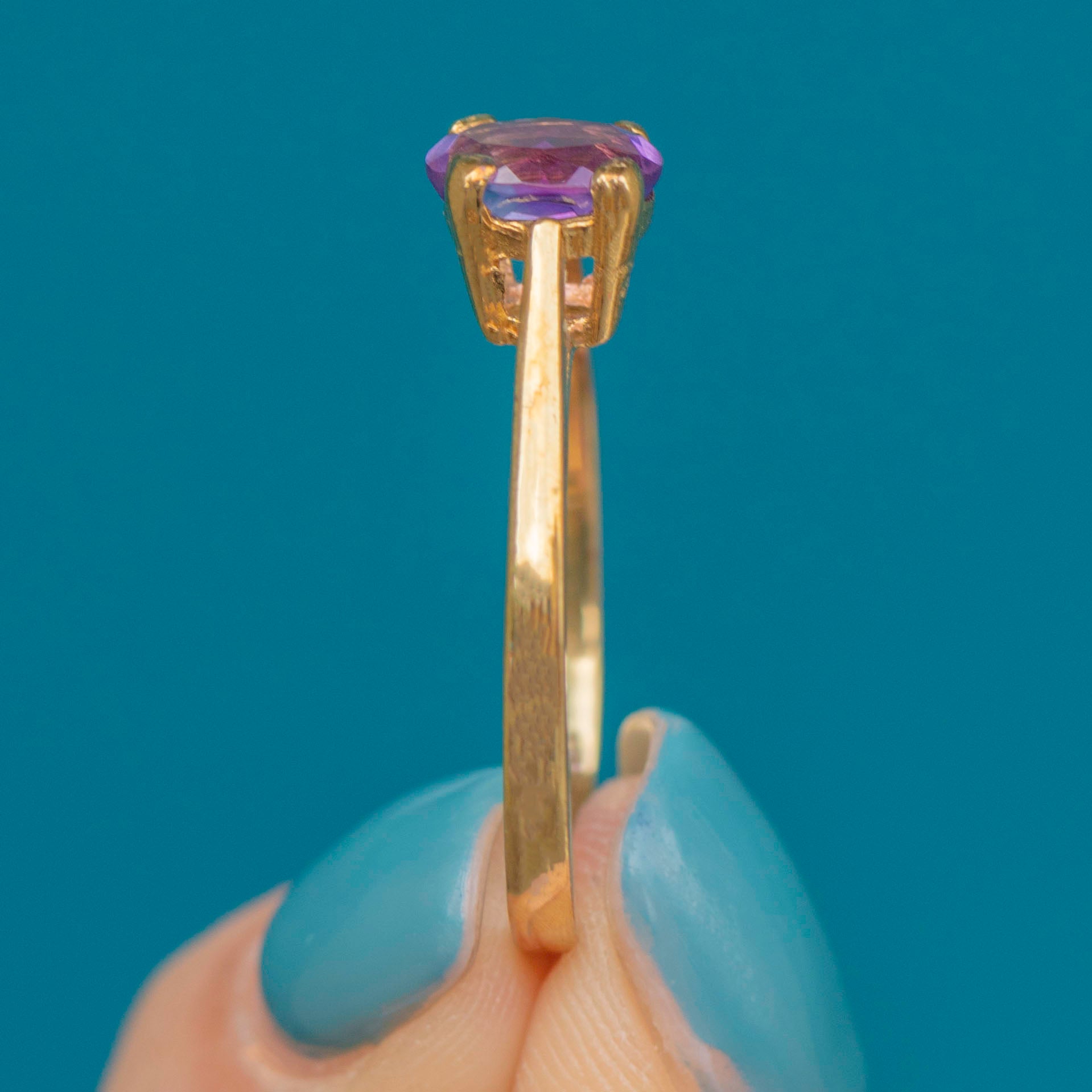 This 9ct Gold Amethyst solitaire ring will make a sweet and sparkling addition to any jewellery box! A single Amethyst is held within four claw settings, with an impressive profile to add to the grandeur of this vintage ring.