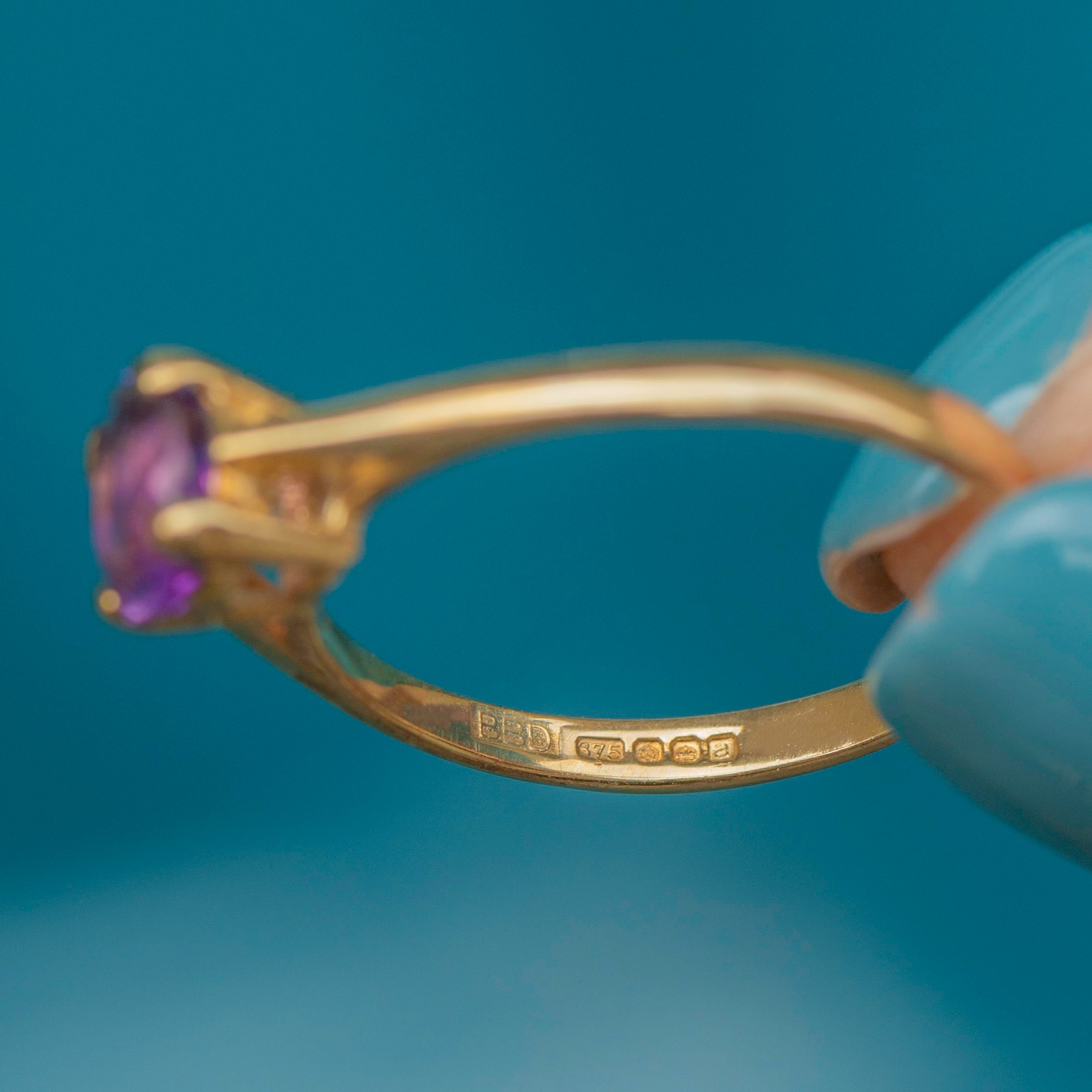 EXCELLENT. With a securely set Amethyst, buttery Gold claws and a perfectly formed ring band, this 9ct Gold Amethyst solitaire ring is in excellent condition!
