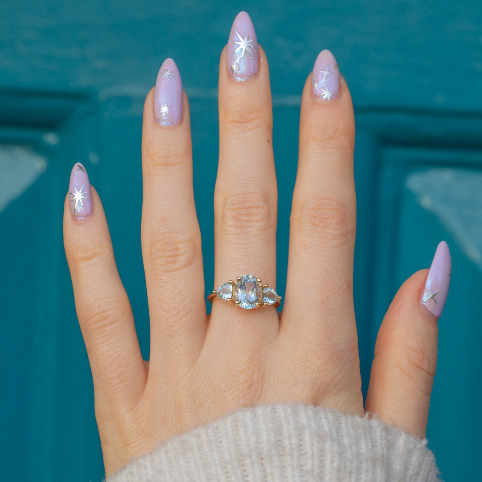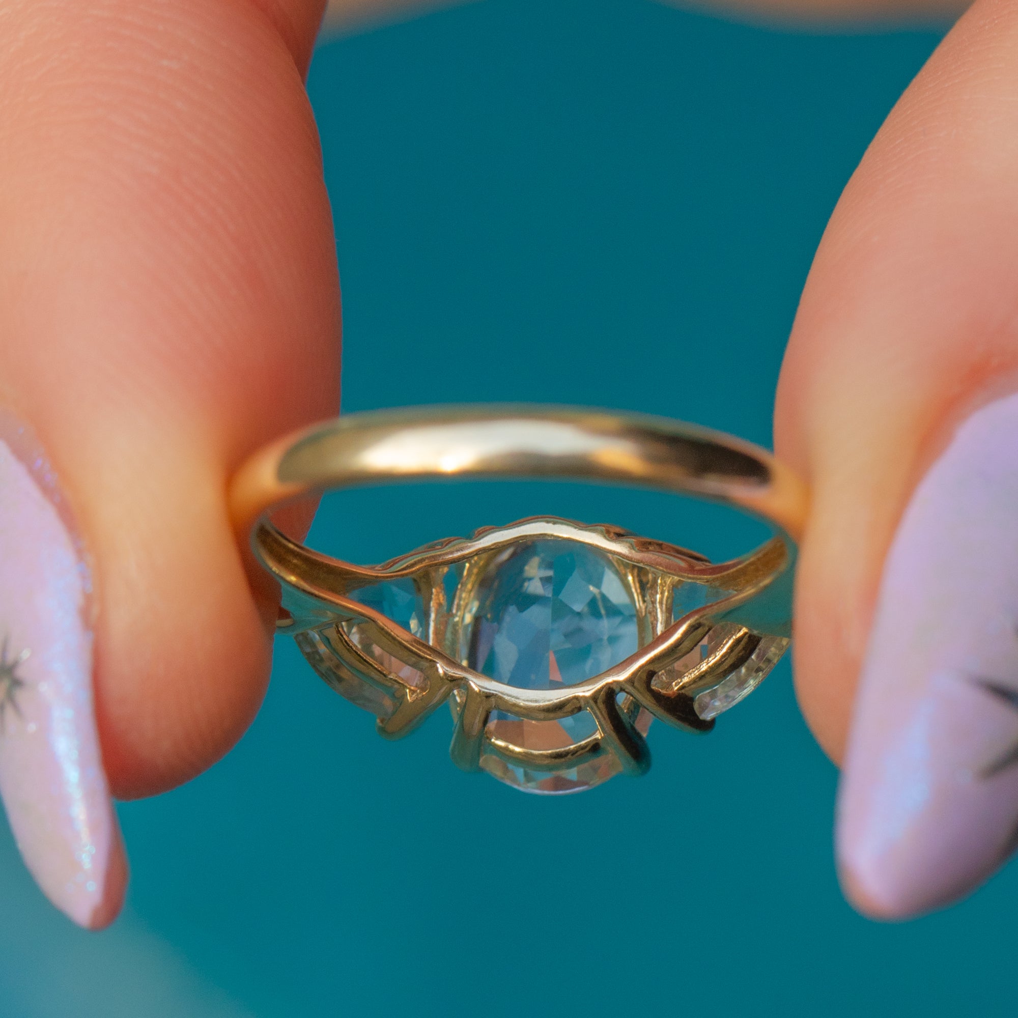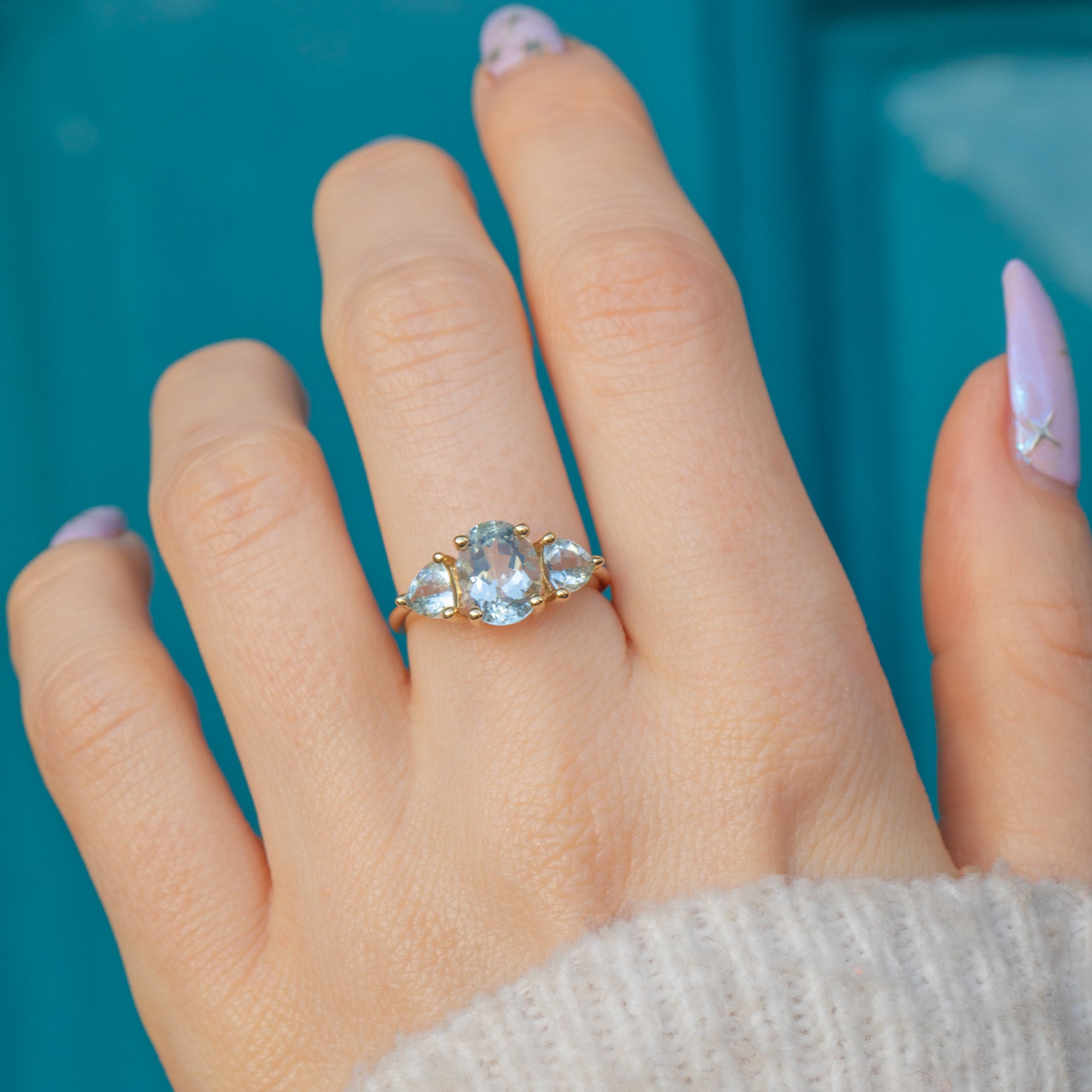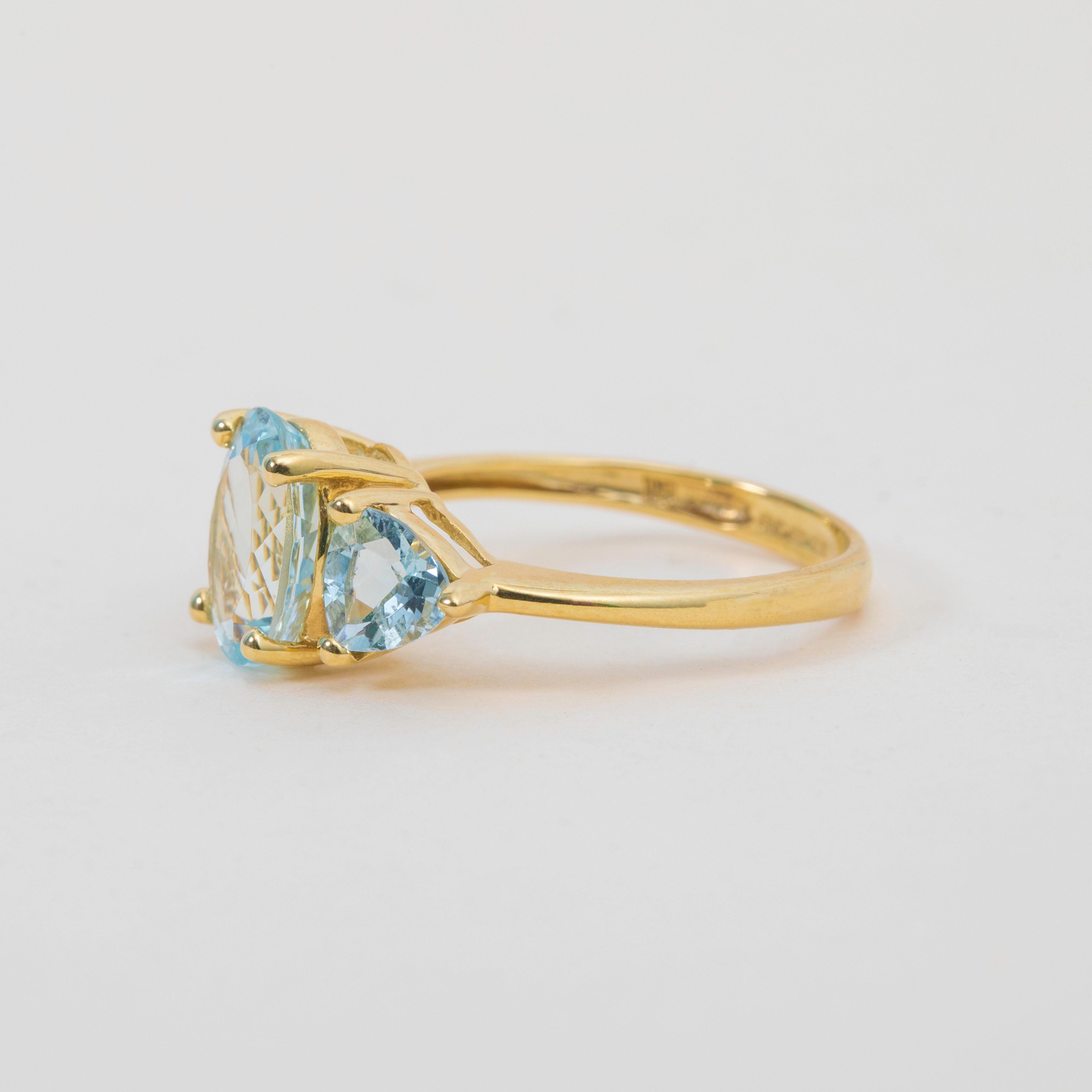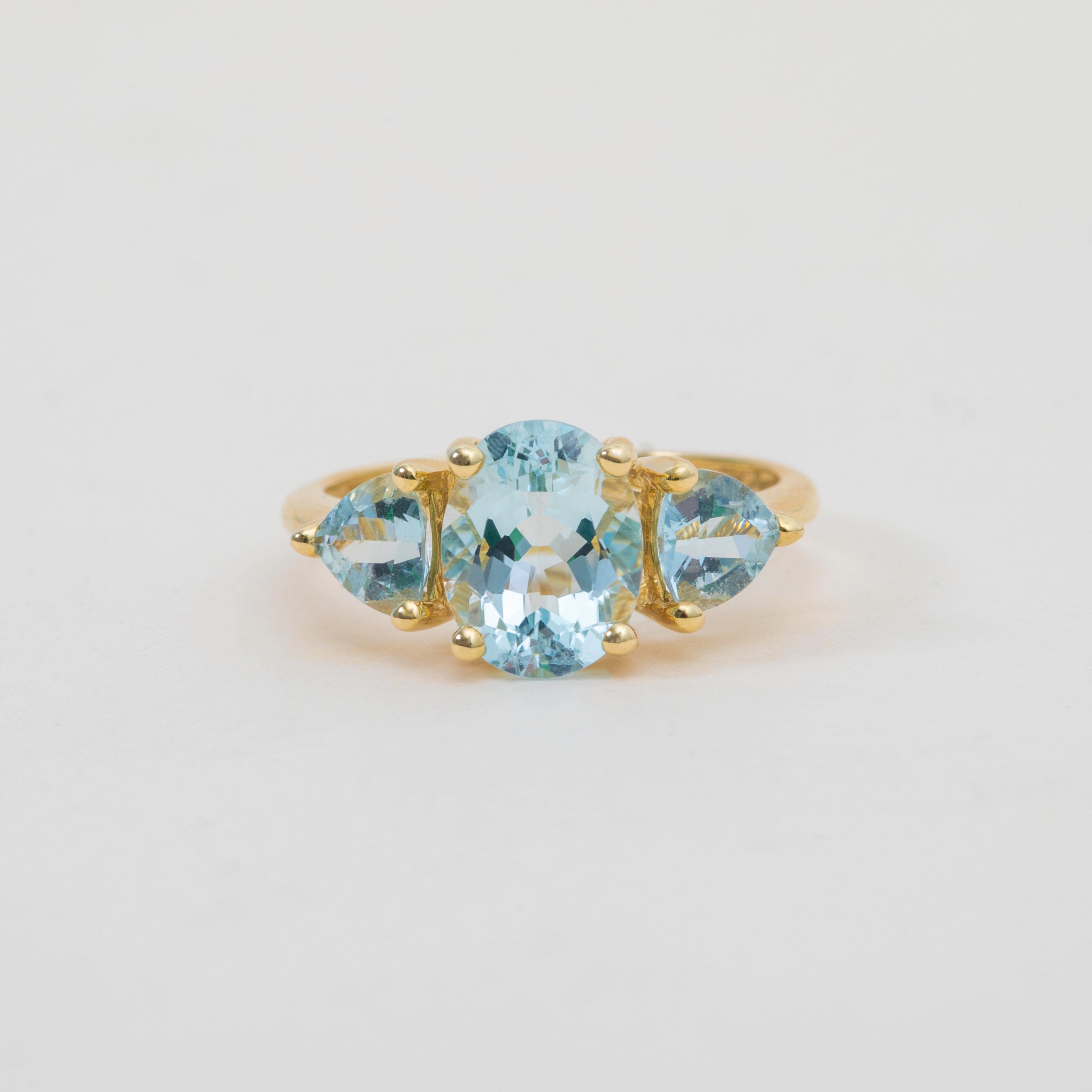 This 9ct Gold Aquamarine ring is a delight! Crafted from luscious 9ct Gold, she boasts three stunning Aquamarines, weighing a total of 2.00 carats, each one faceted wonderfully with striking icy blue hues, like dainty frozen droplets.