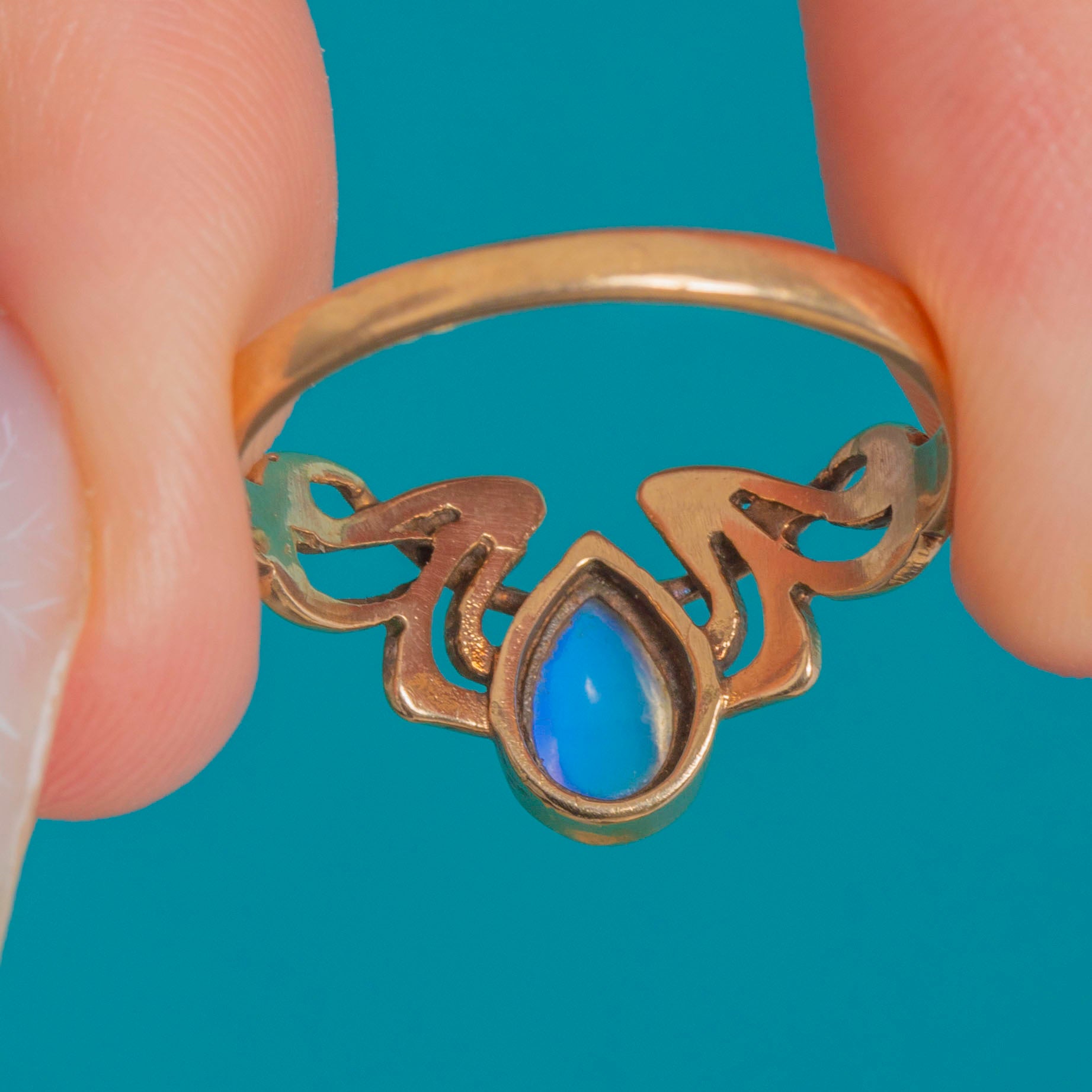 A dreamy Moonstone shimmers at the heart of this 9ct Gold ring, its pear-shaped cabochon glowing with ethereal blue-lilac adularescence. The gemstone is cradled in a smooth bezel setting, giving a sleek, elegant profile that’s both refined and wearable.