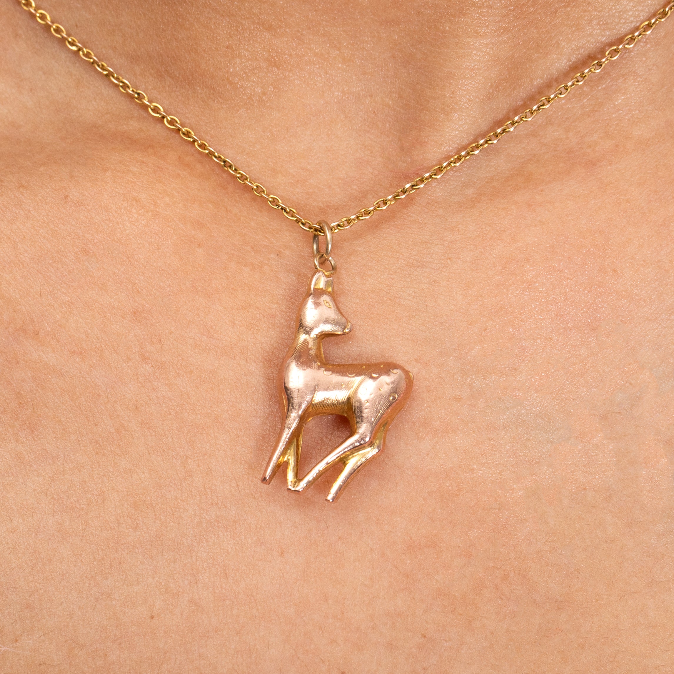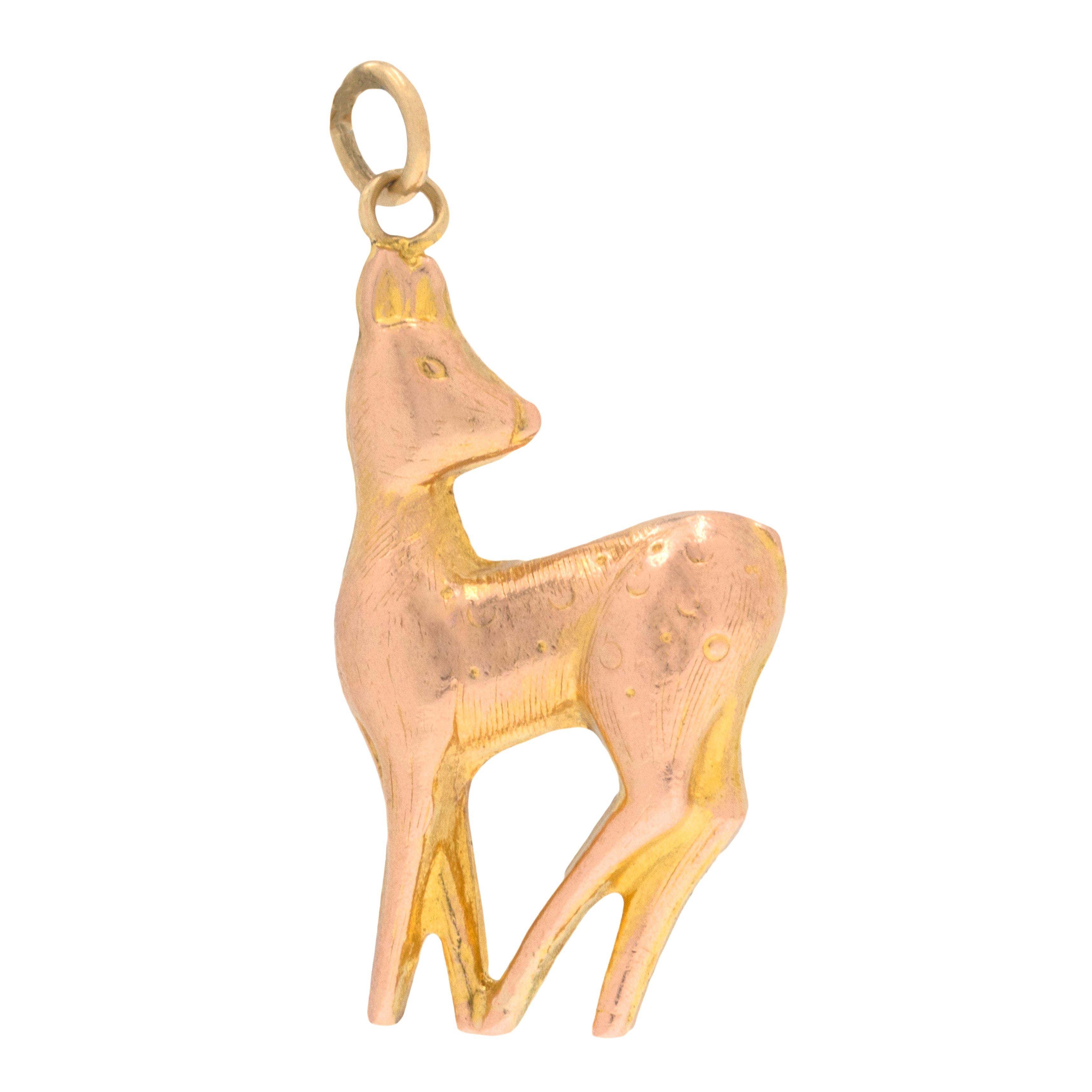 VERY GOOD. This 9ct Gold Bambi pendant is offered in excellent condition. The 9ct Gold is buttery and smooth, free from dents or dings. Some of the engraved details have worn over time, but the pendant has retained its form impeccably. With a soldered jump ring, you can suspend this vintage Gold charm from a chain with ease and wear her confidently!