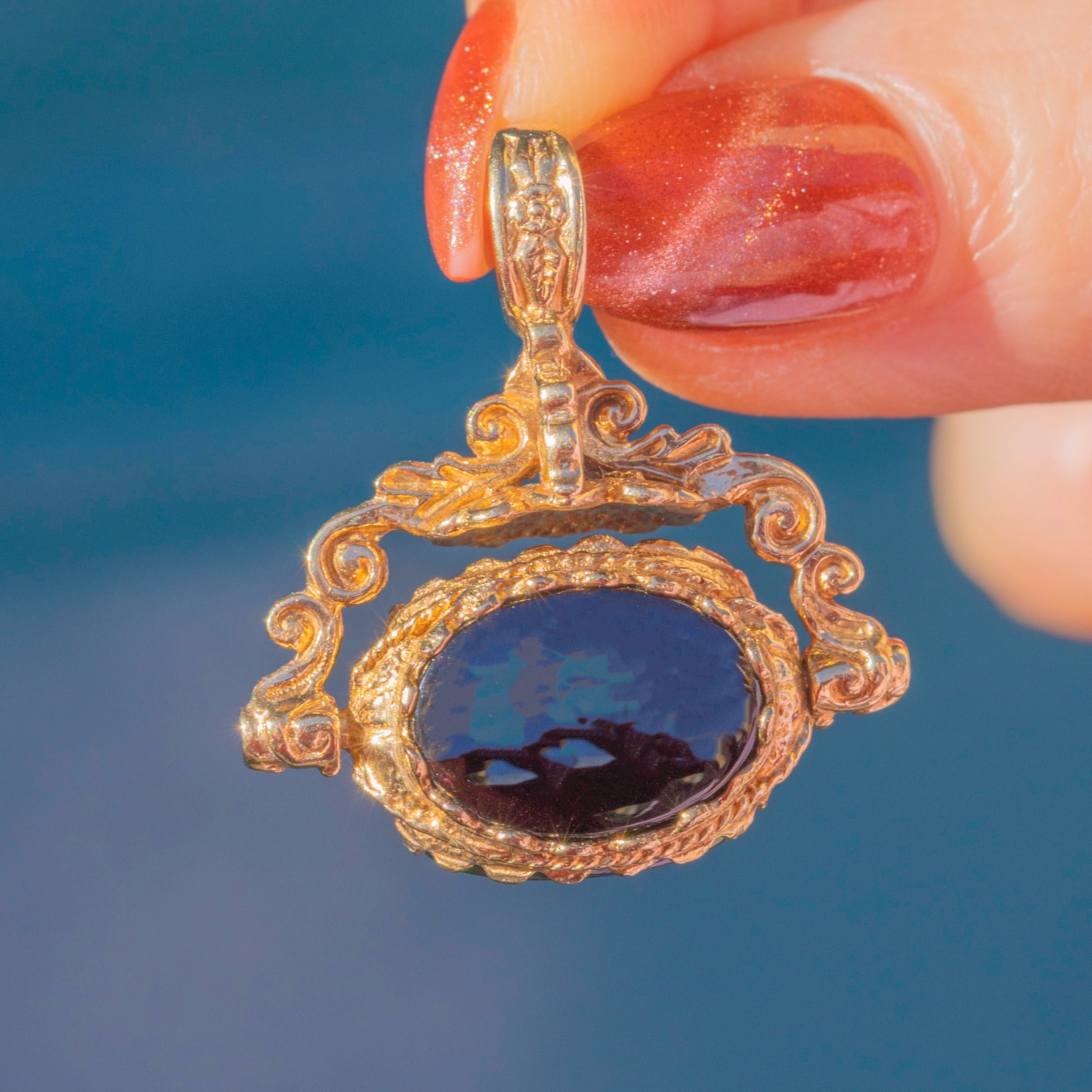 This 9ct Gold Bloodstone Carnelian Onyx spinner fob pendant is a ten out of ten! The spinner fob is inlaid with a tantalising combination of Bloodstone, Carnelian, and Onyx, setting her apart from many other fobs we have been lucky enough to lay our hands on.