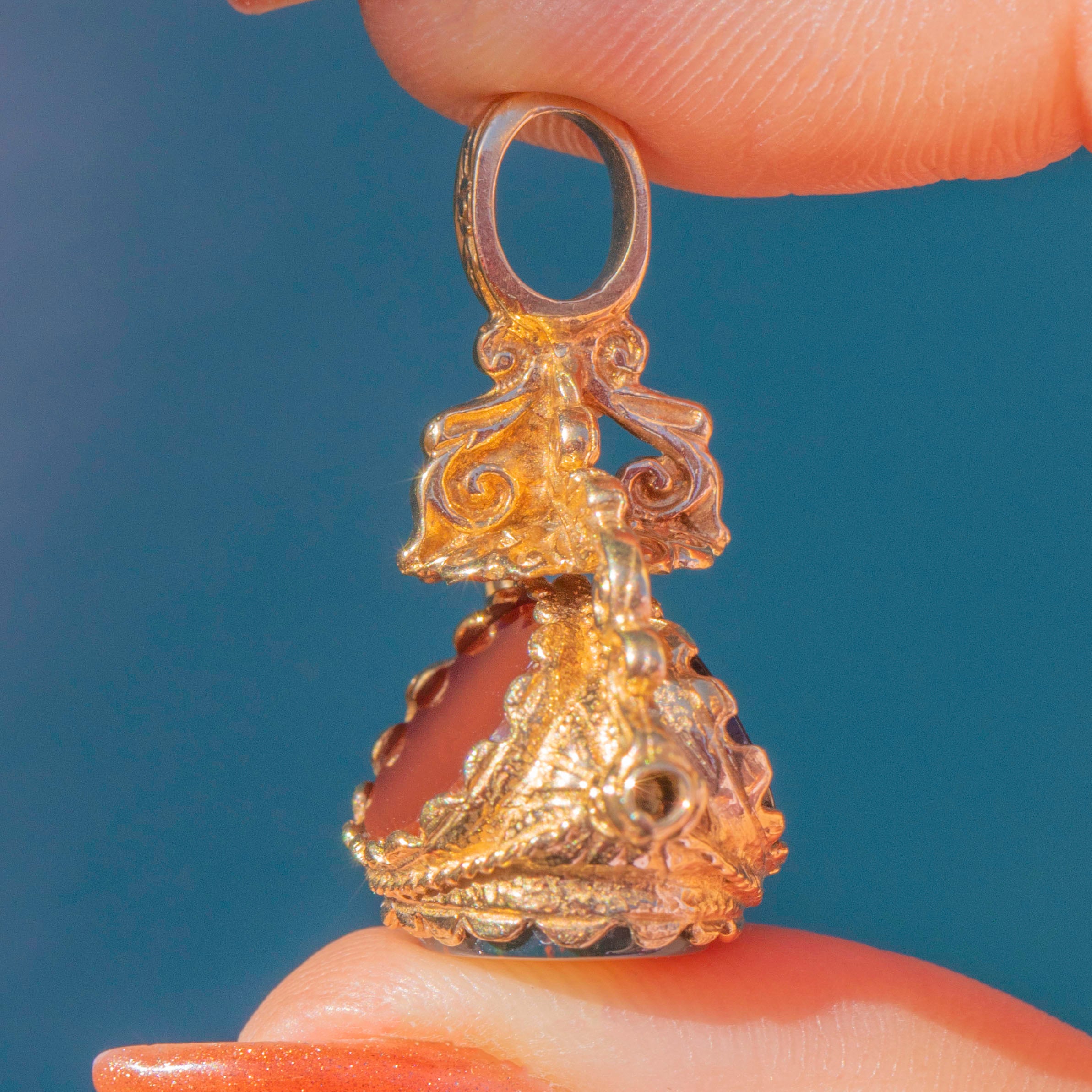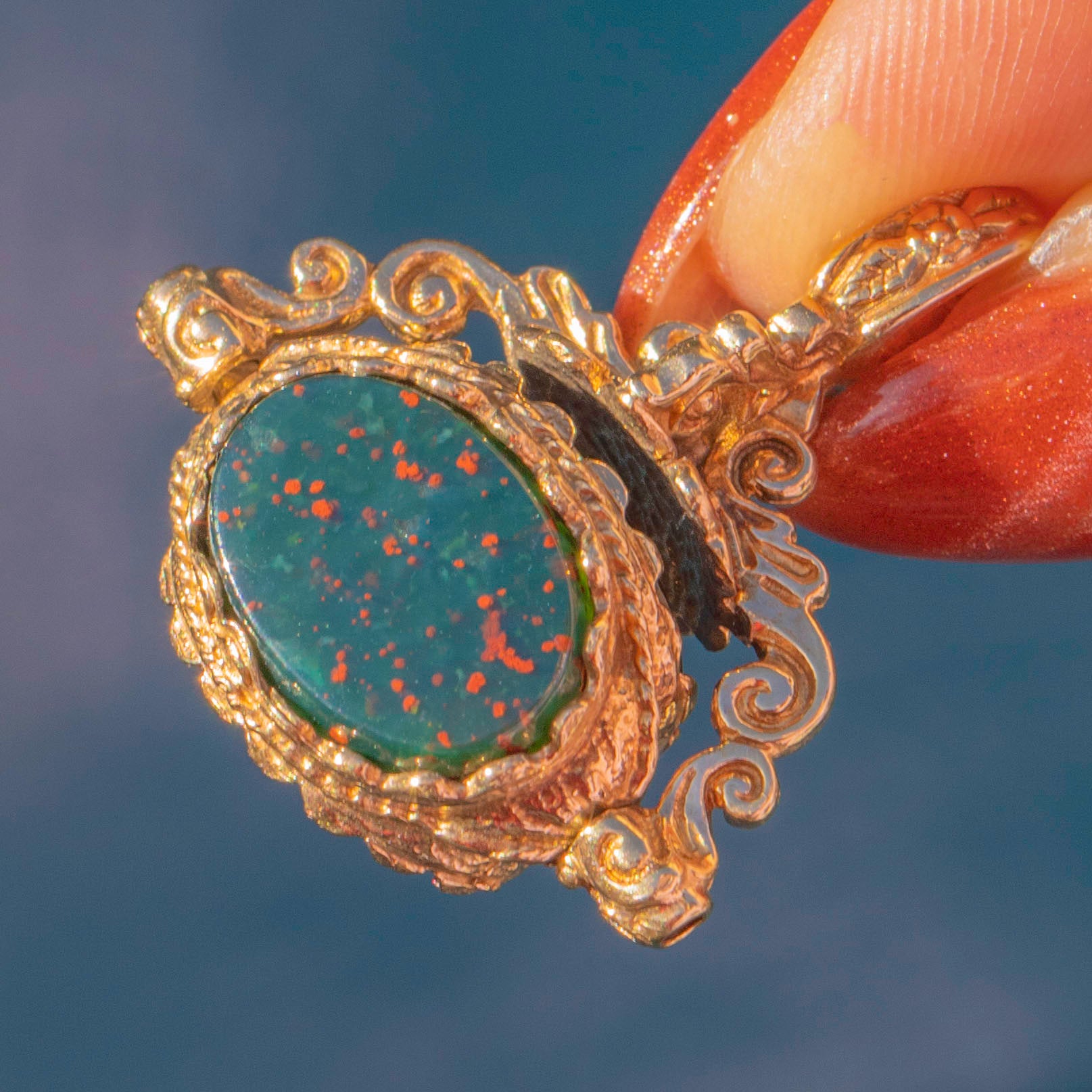 EXCELLENT: This 9ct Gold Bloodstone Carnelian Onyx spinner fob pendant is in superb condition. The 9ct Gold is bright and radiant, and the intricate Goldwork remains beautiful. Each stone is inlaid securely, free from any chips or scratches. There is some wear to the scalloped edge of the settings, but the stones remain secure. This vintage Gold fob will be like no other in your collection—she will add glamour and charm to any attire!