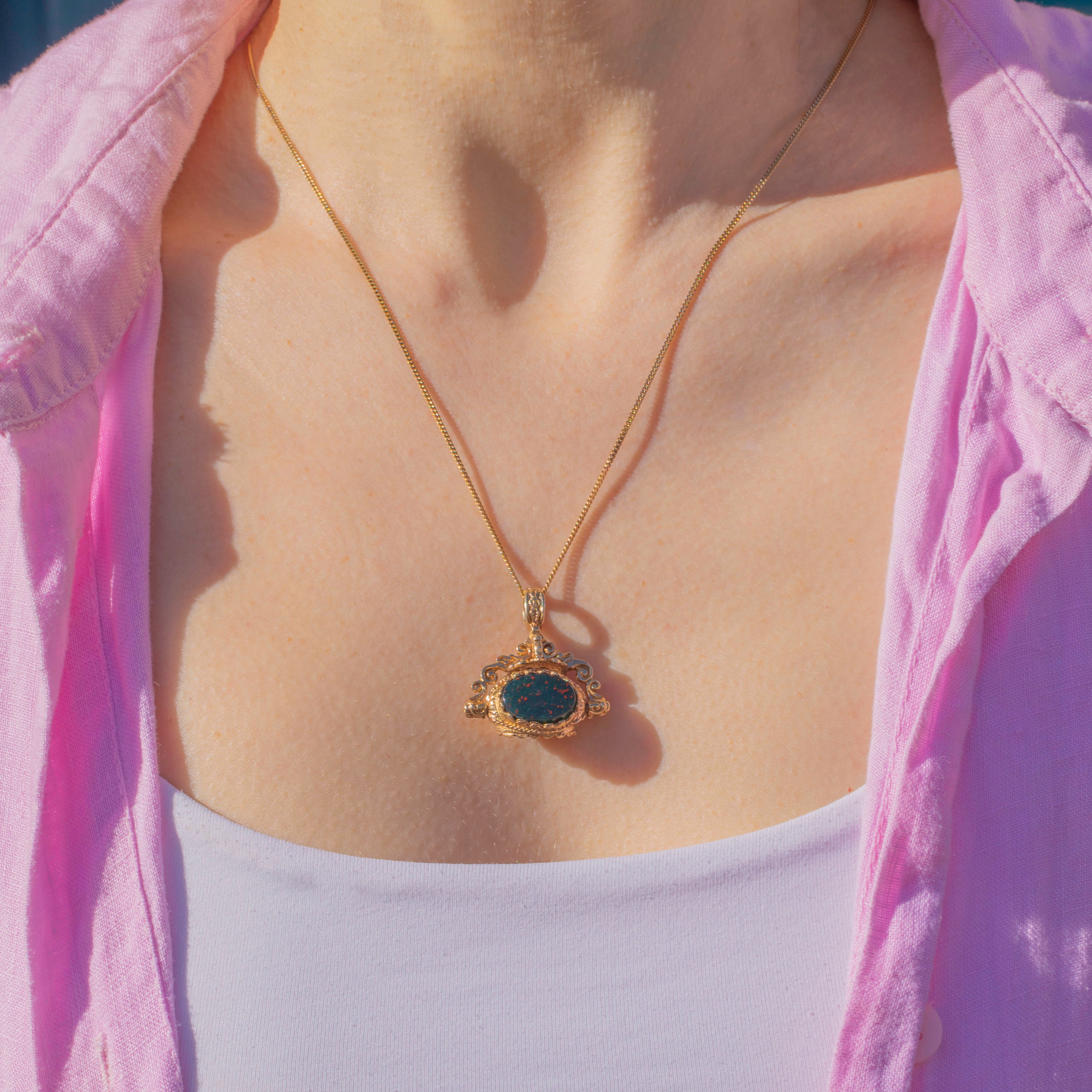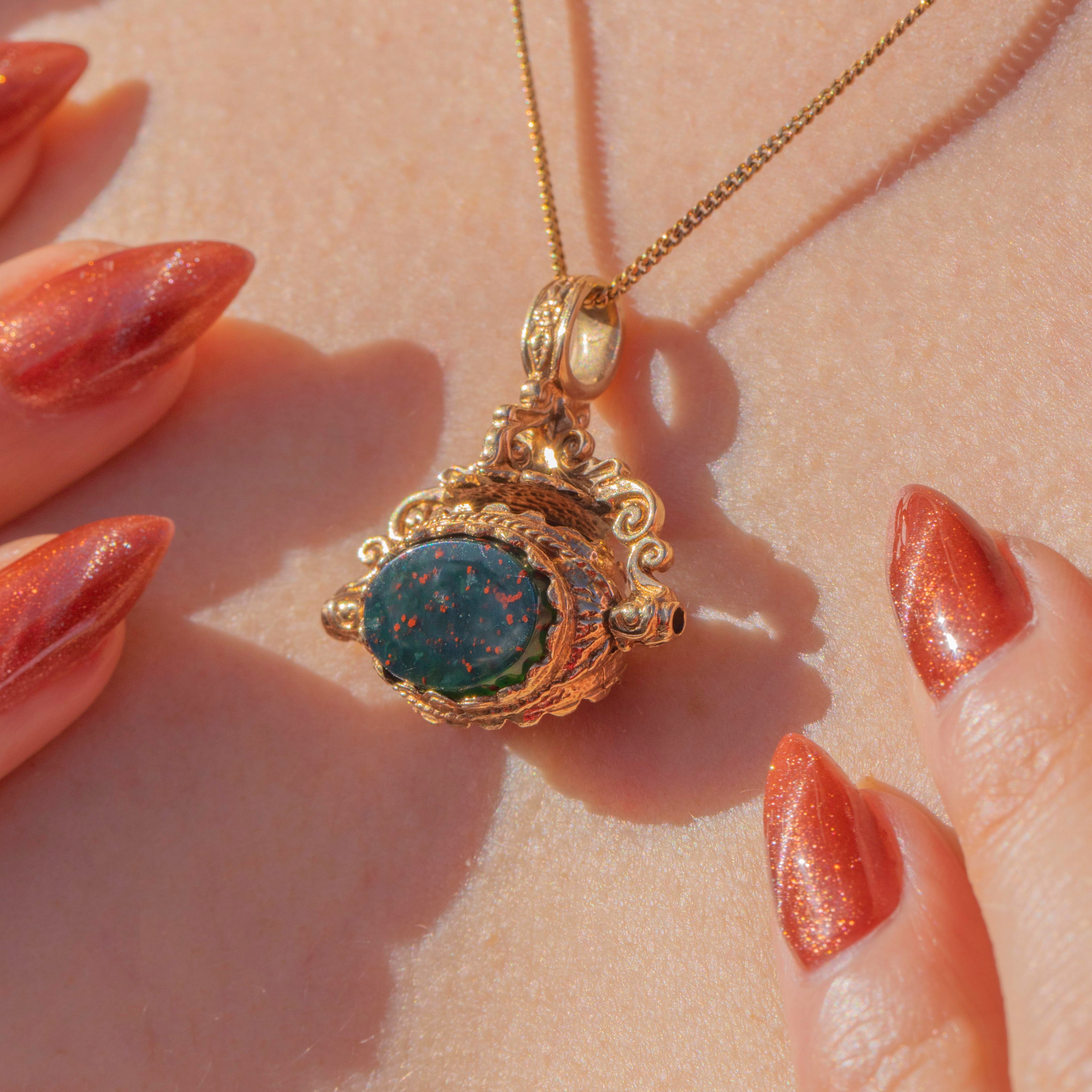 Ever so whimsical, this vintage spinner fob is crafted from bright 9ct Gold, flaunting a show-stopping bale, with each stone displayed in glamorous scolloped settings. Satisfyingly spin her to admire the flashes of rouge and forest green from her Bloodstone and Carnelian amongst the inky jet black Onyx.
