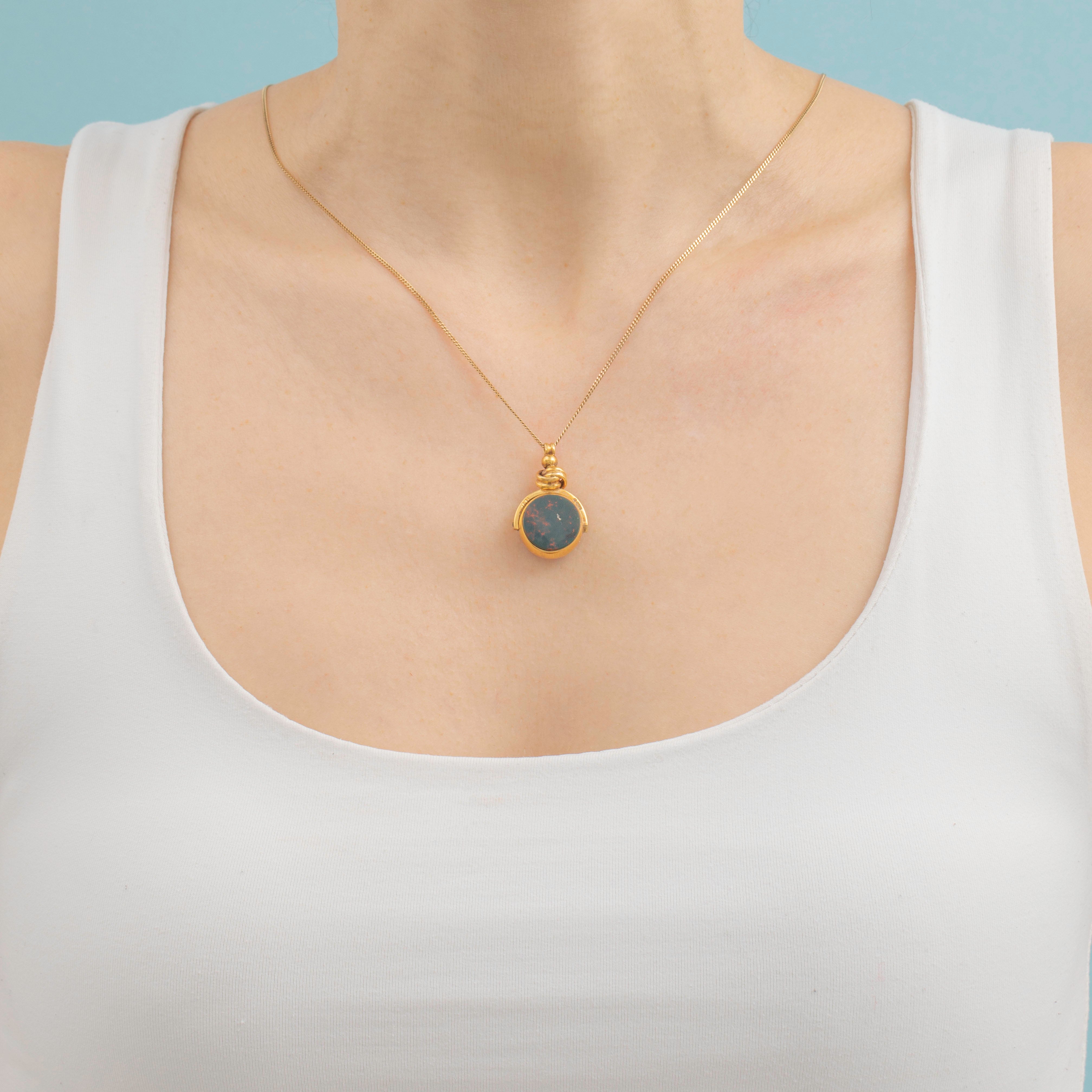 Her Carnelian face boasts a deep crimson red hue and her deep green Bloodstone face is speckled with flashes of fiery oranges. A beacon of warmth and antique charm, this spinner fob pendant would look beautiful suspended from a fine chain and is perfect for both everyday and occasion wear!