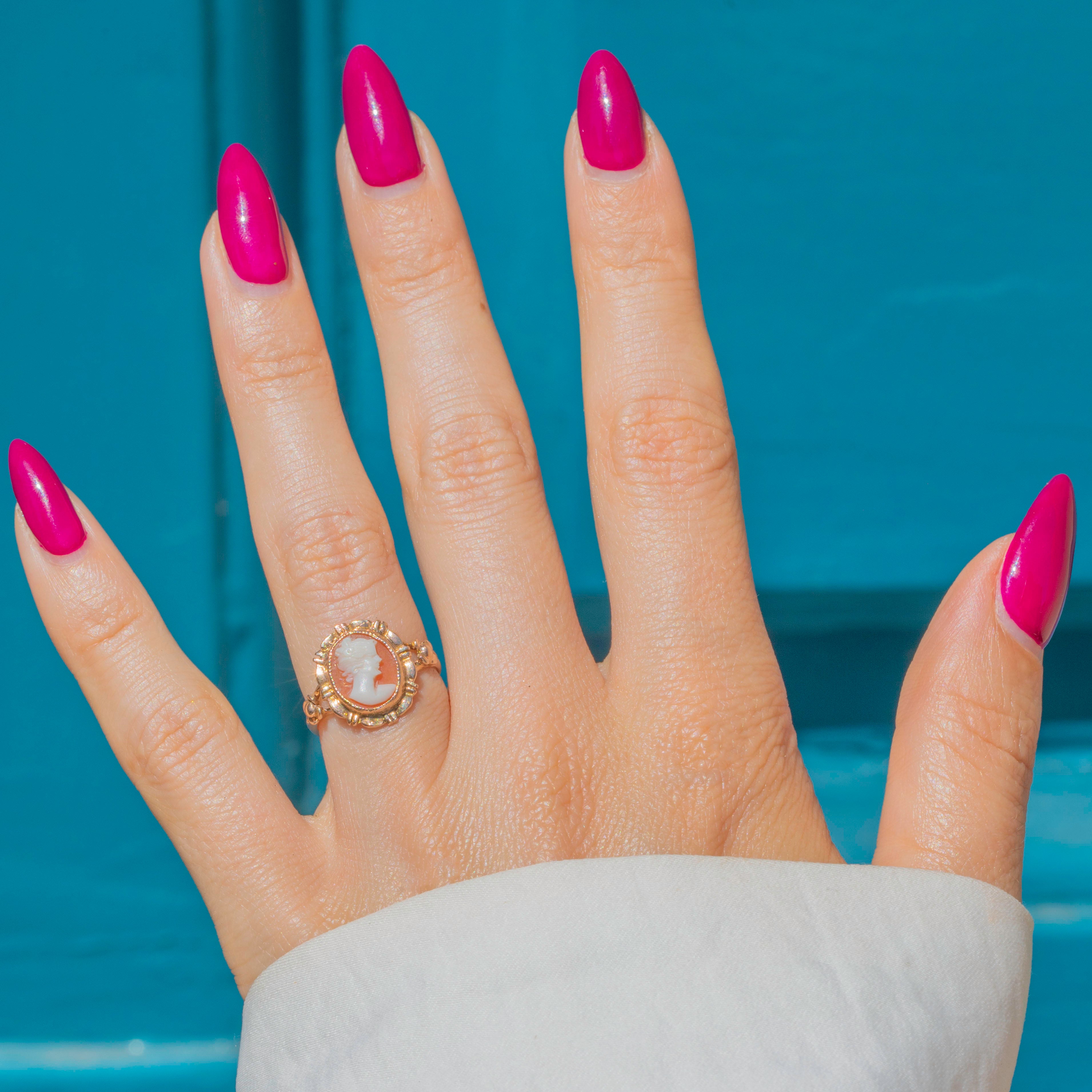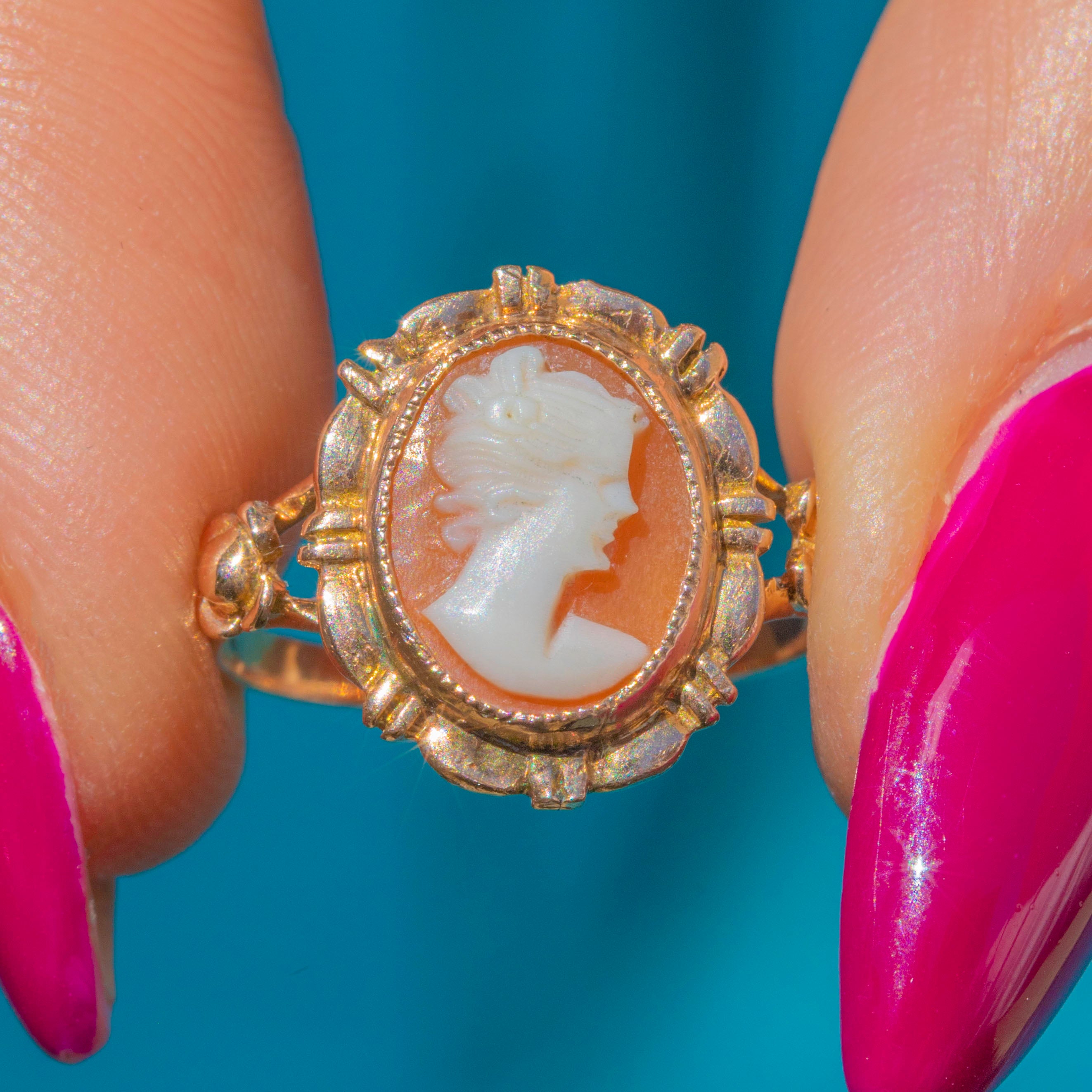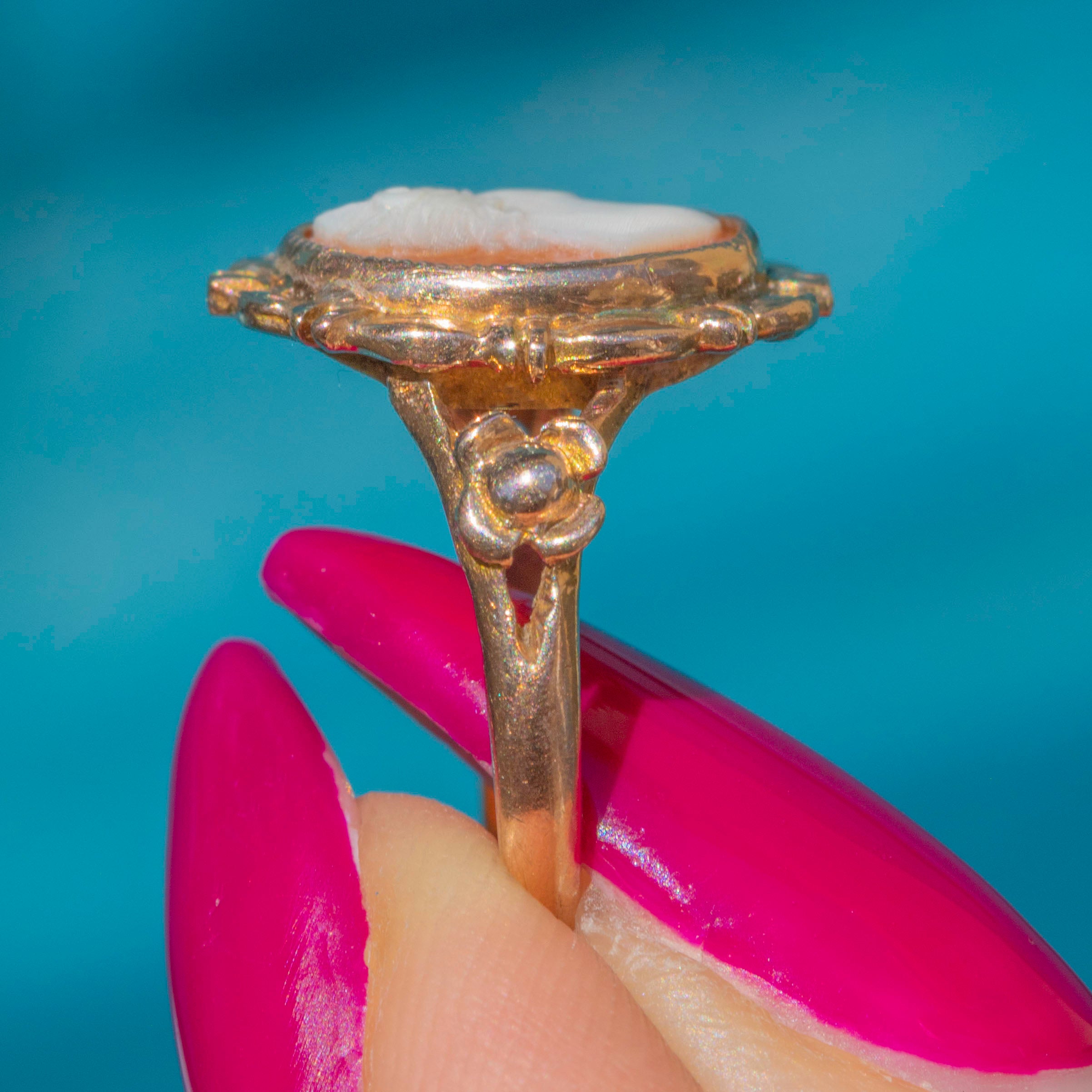 EXCELLENT: The Gold is in lovely condition with good shine and polish, and only minor wear to the very back of the band, with only a faint resize mark on the back of the ring. The delicately carved cameo is in perfect condition, with no splits, chips or damage whatsoever, and it is held firmly in place- ready to wear & enjoy!