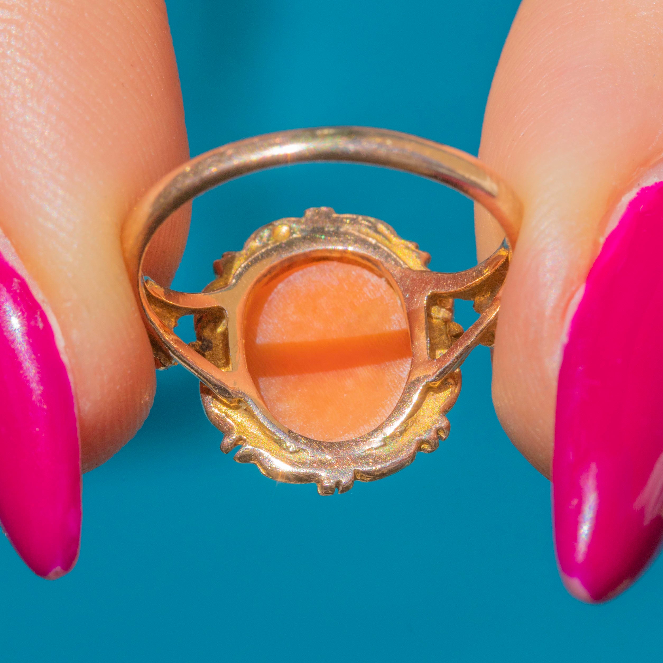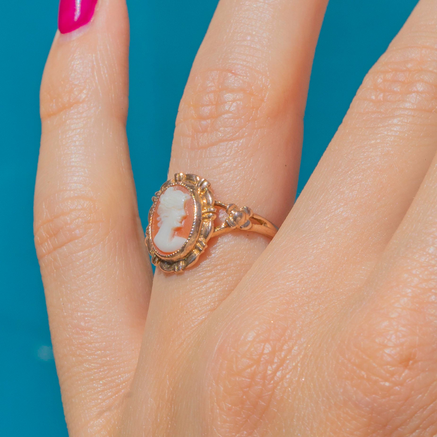 This sweet 9ct Gold cameo ring features a skillfully hand-carved portrait of a young lady on a soft terracotta coloured background.