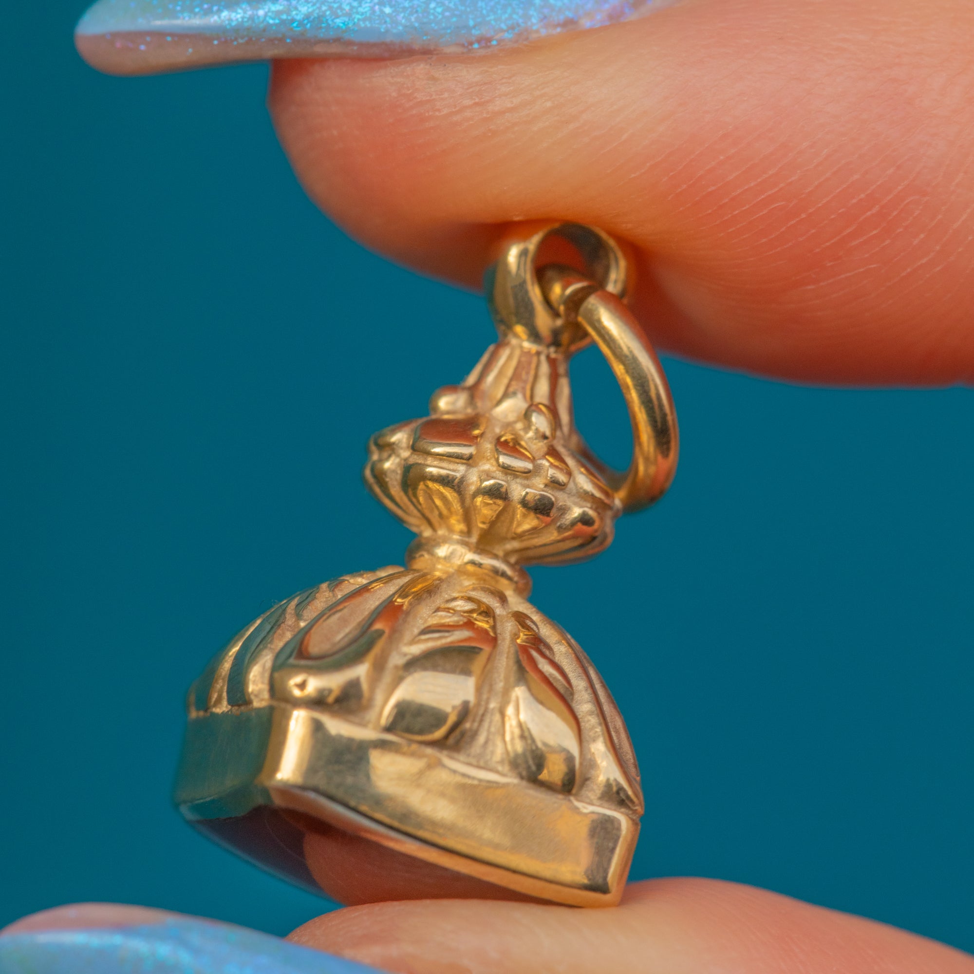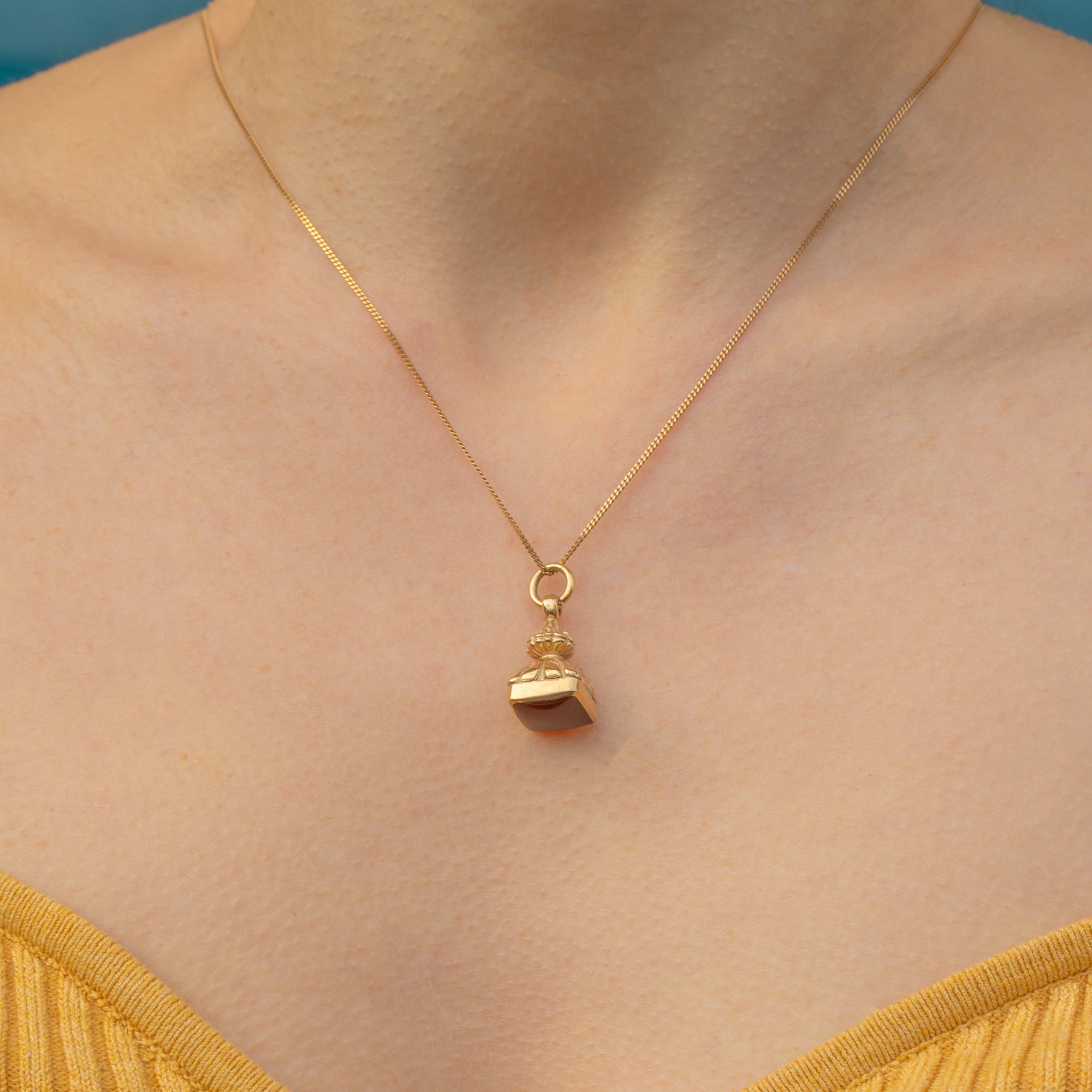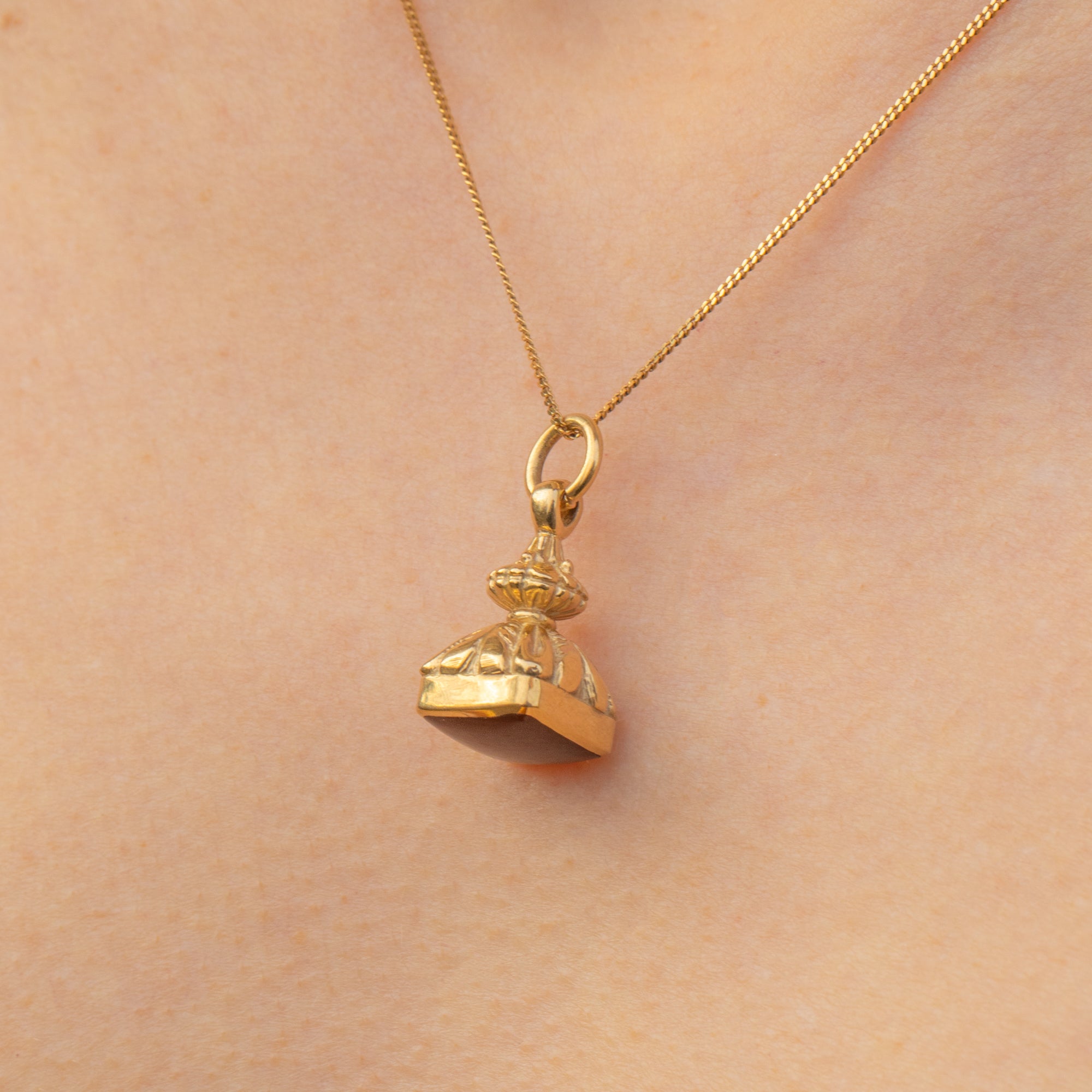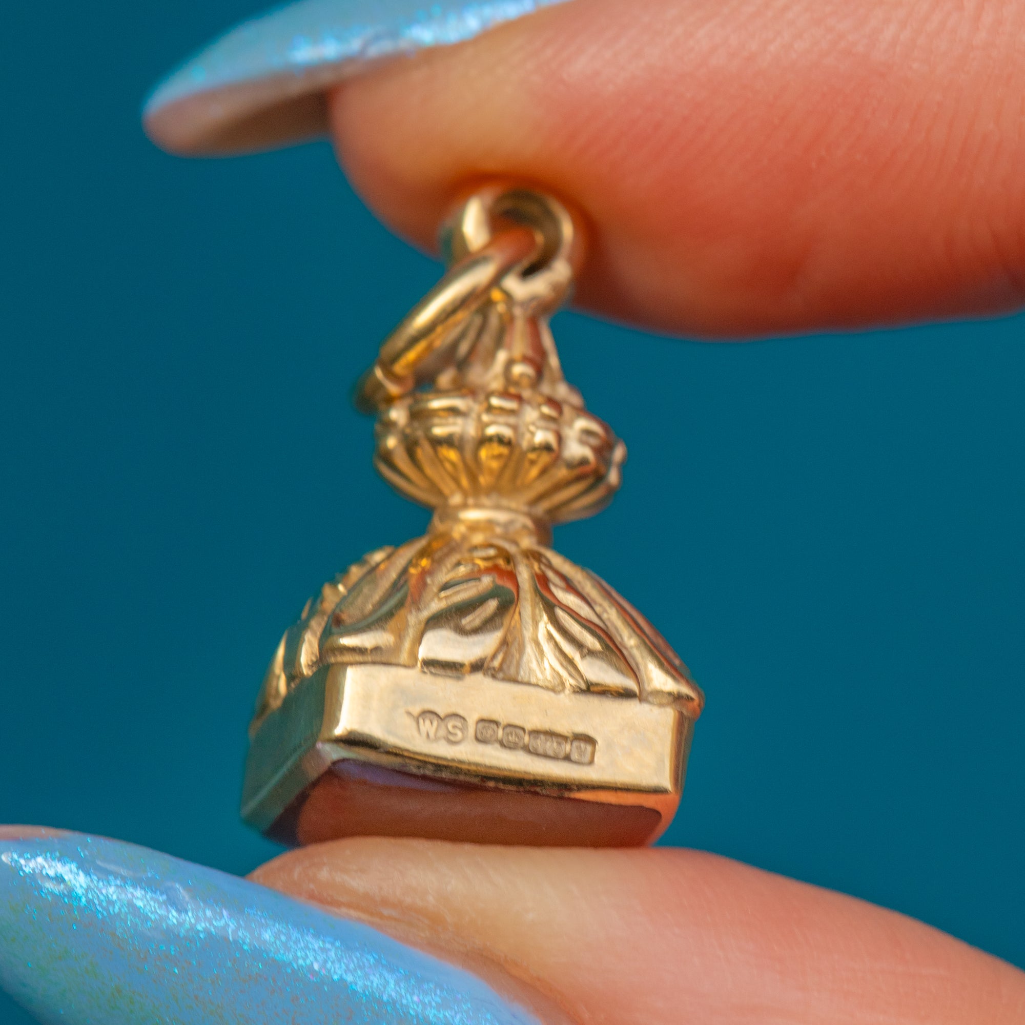 EXCELLENT. This 9ct Gold Carnelian fob pendant is in excellent condition. The Gold is bright and the engraved details are defined, with no dings or scuffs. The Carnelian is smoothly domed, free from chips or nibbles, and securely held within its setting. This enchanting wax seal pendant is perfect for adding some whimsical vintage charm to any outfit!