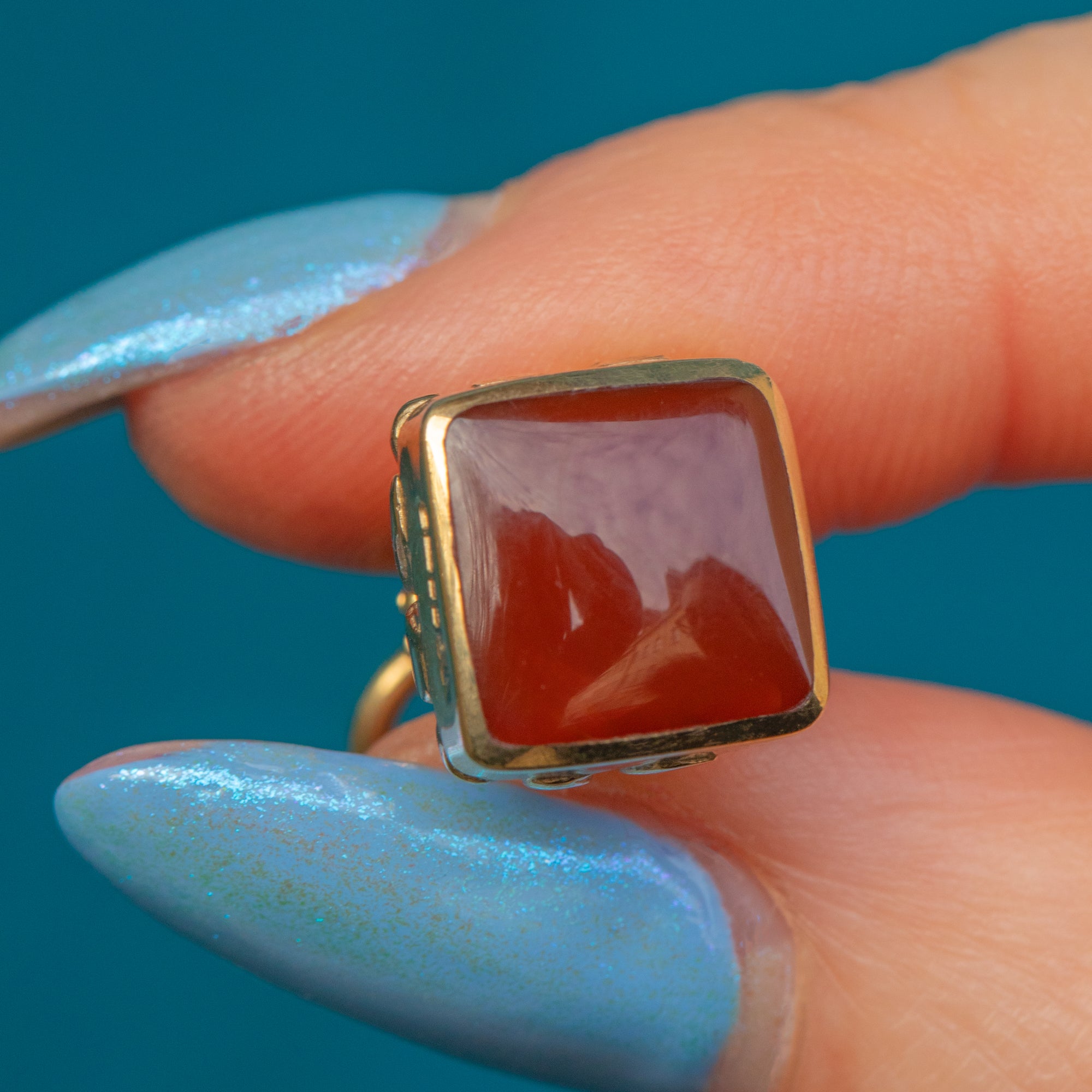 At the base lies a satisfyingly smooth square Carnelian cabochon, its deep burgundy hue complemented by the saturated Gold to create a luxurious vintage fob.