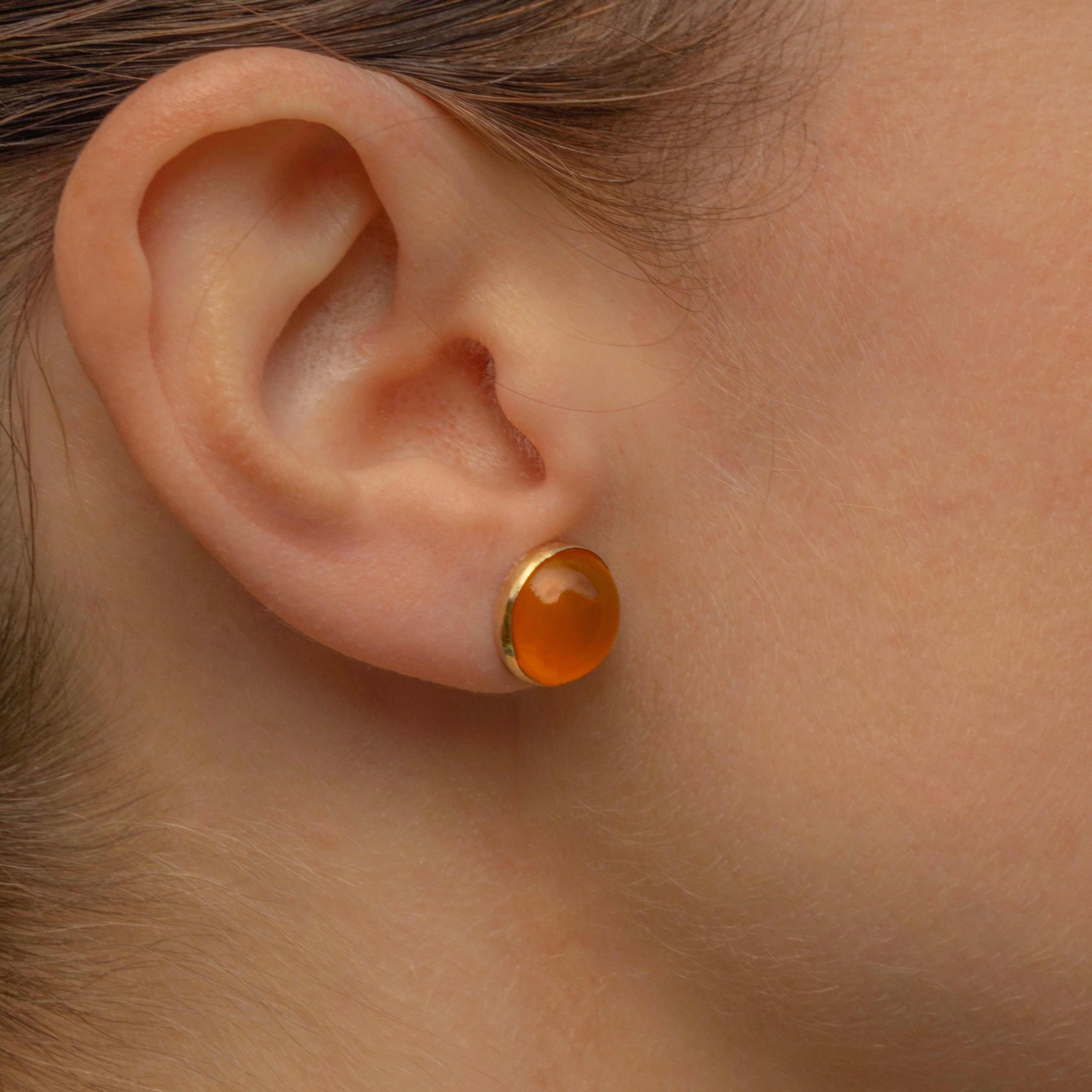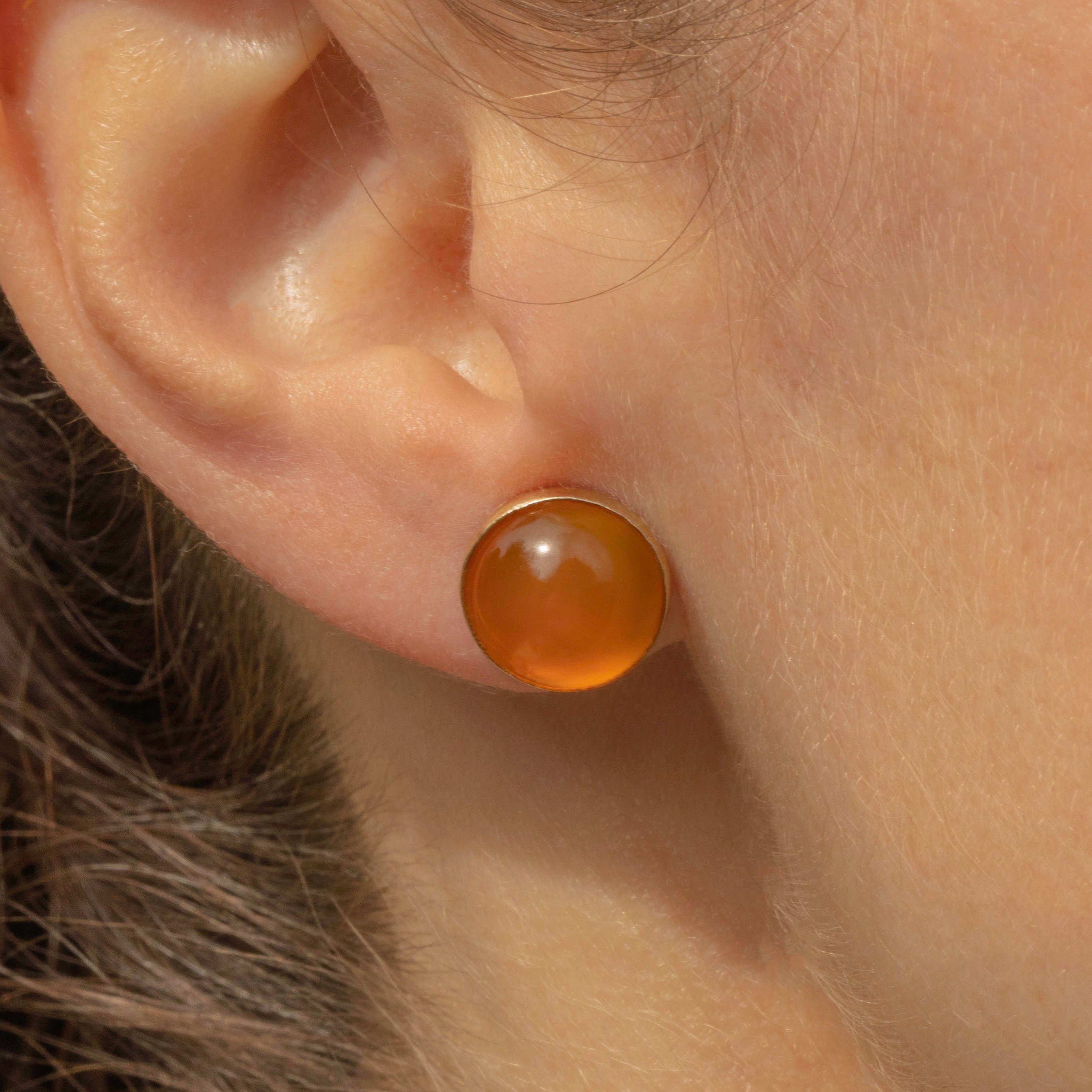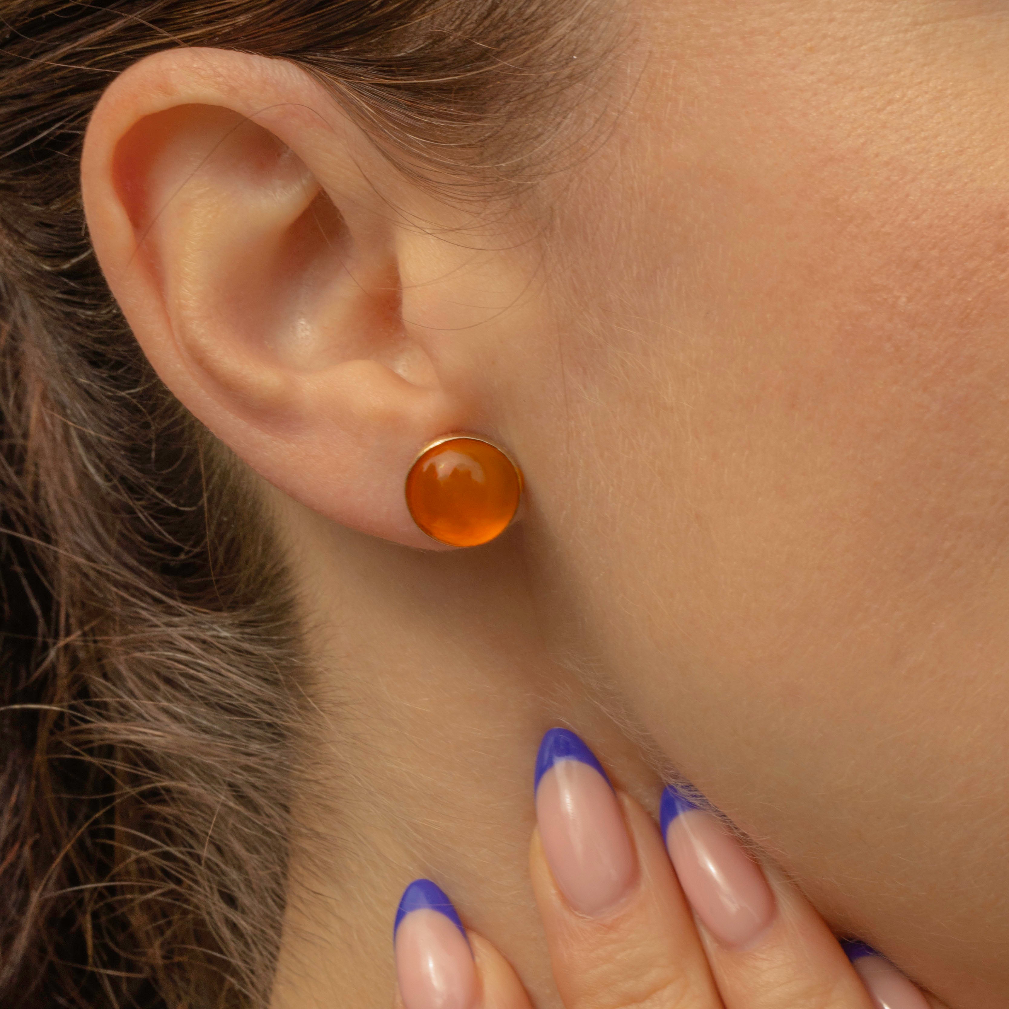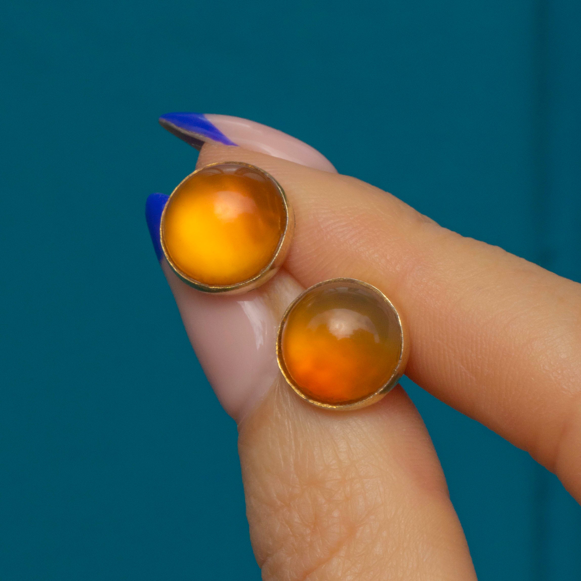 These 9ct Gold Chalcedony cabochon stud earrings are bursting with vibrance! Each natural Chalcedony gemstone offers a gradient of orange hues, from honey to a fiery orange, with a warm glow emanating from their smooth cabochon surfaces.