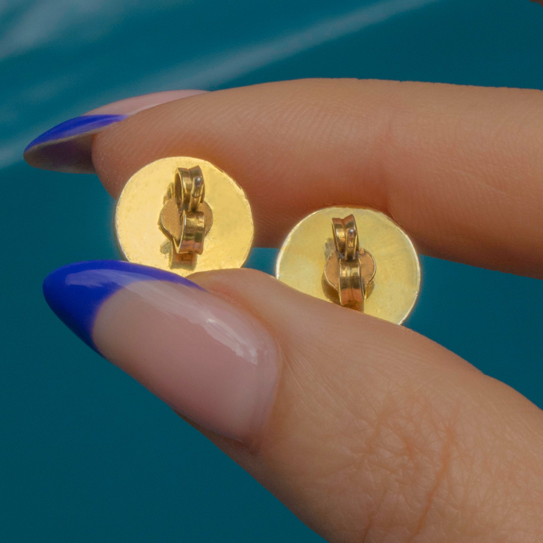 VERY GOOD. These 9ct Gold Chalcedony cabochon stud earrings are in very good condition. The Chalcedony are secure within their bezel setting, smooth to the touch and offer lovely heartwarming hues. There are some tiny nicks to the bezel setting and the back has some light surface wear but this is only noticeable under a jeweller's loupe. The Gold stud earrings are waiting to adorn the ears of their new rightful owner!