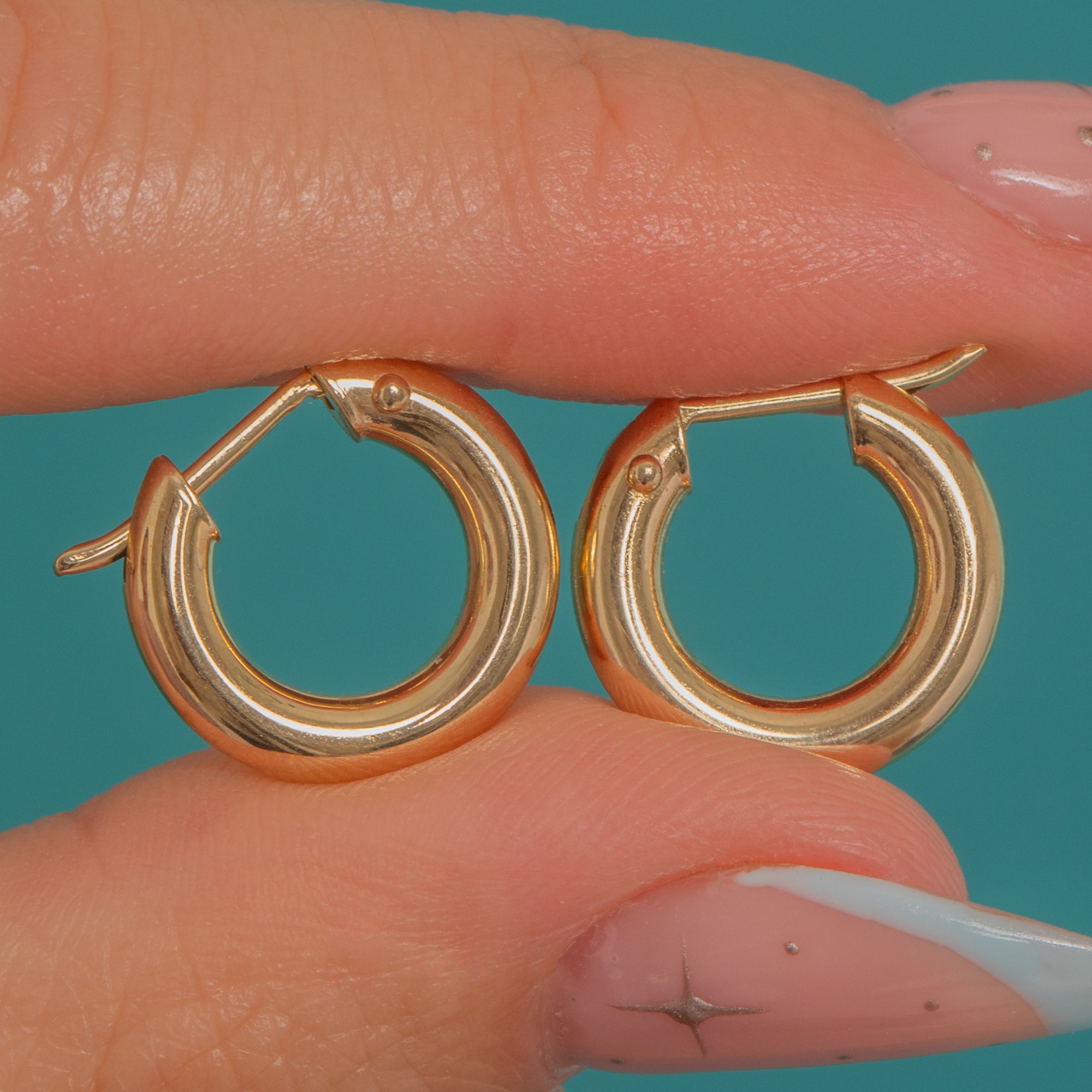 Chic, compact, and endlessly wearable, these chubby “donut” huggie hoops are crafted in gleaming 9ct Gold with a smooth, rounded profile that catches the light beautifully. Their minimalist, high-polish finish gives a luxurious yet understated look that pairs effortlessly with everything from off-duty denim to evening tailoring.