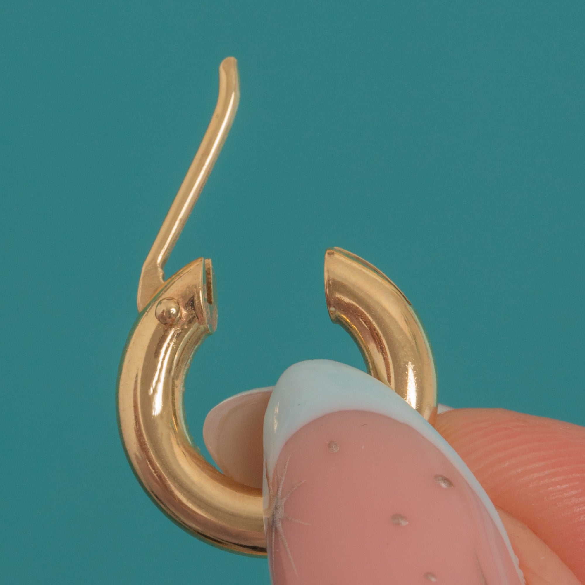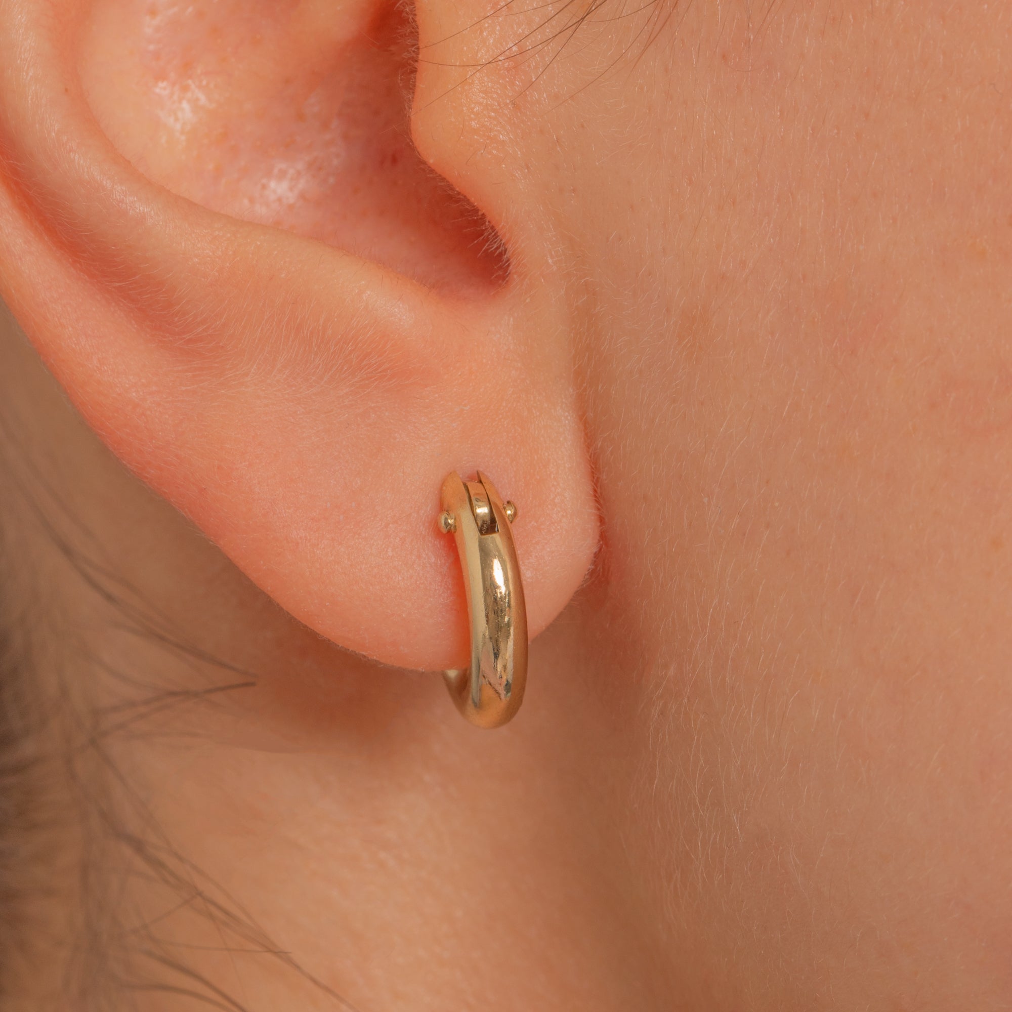 Engineered with an integrated hinge-and-clicker closure for a crisp, secure snap, they sit close to the ear for that coveted modern silhouette. They’re the ideal everyday Gold hoops—sleek alone, or perfect for stacking.