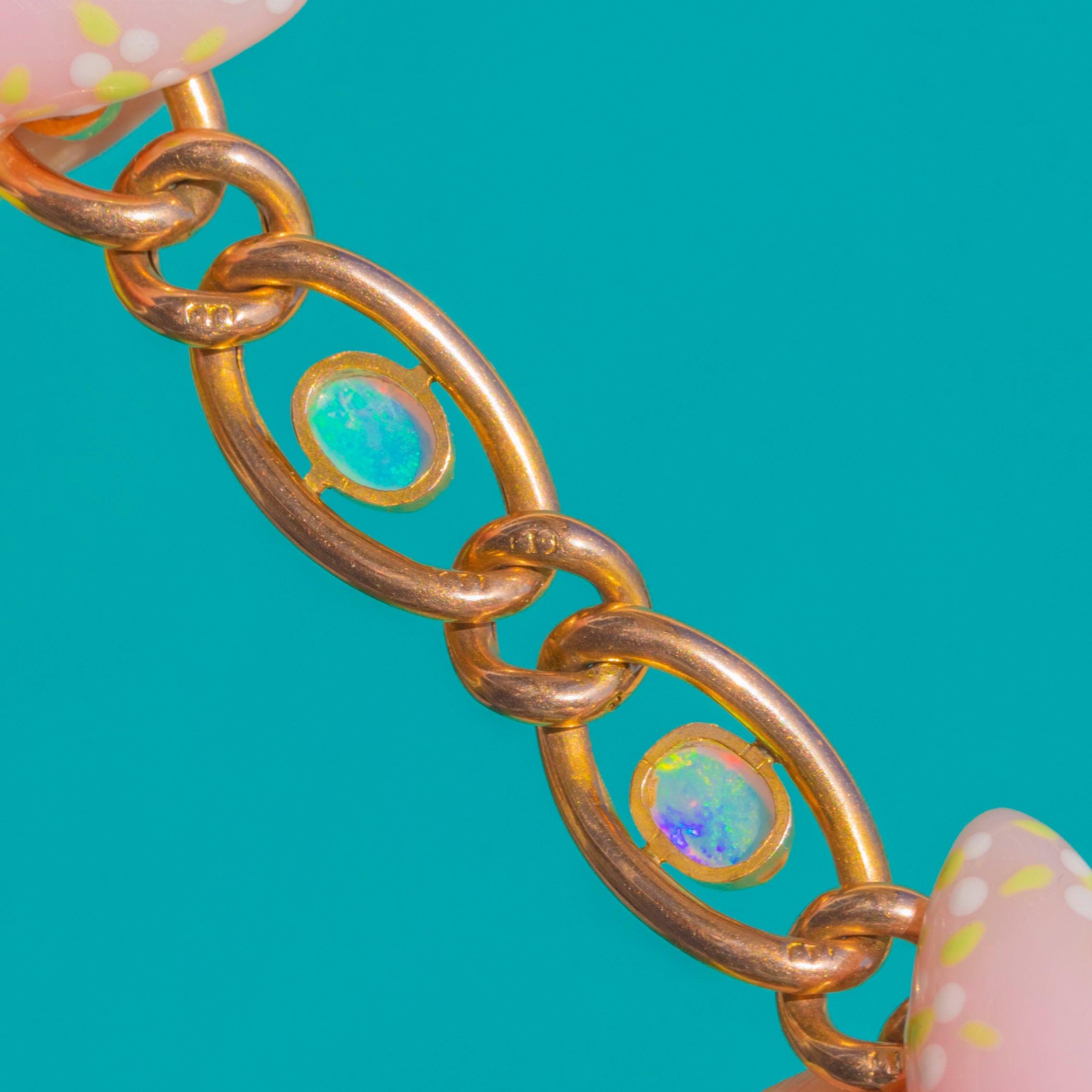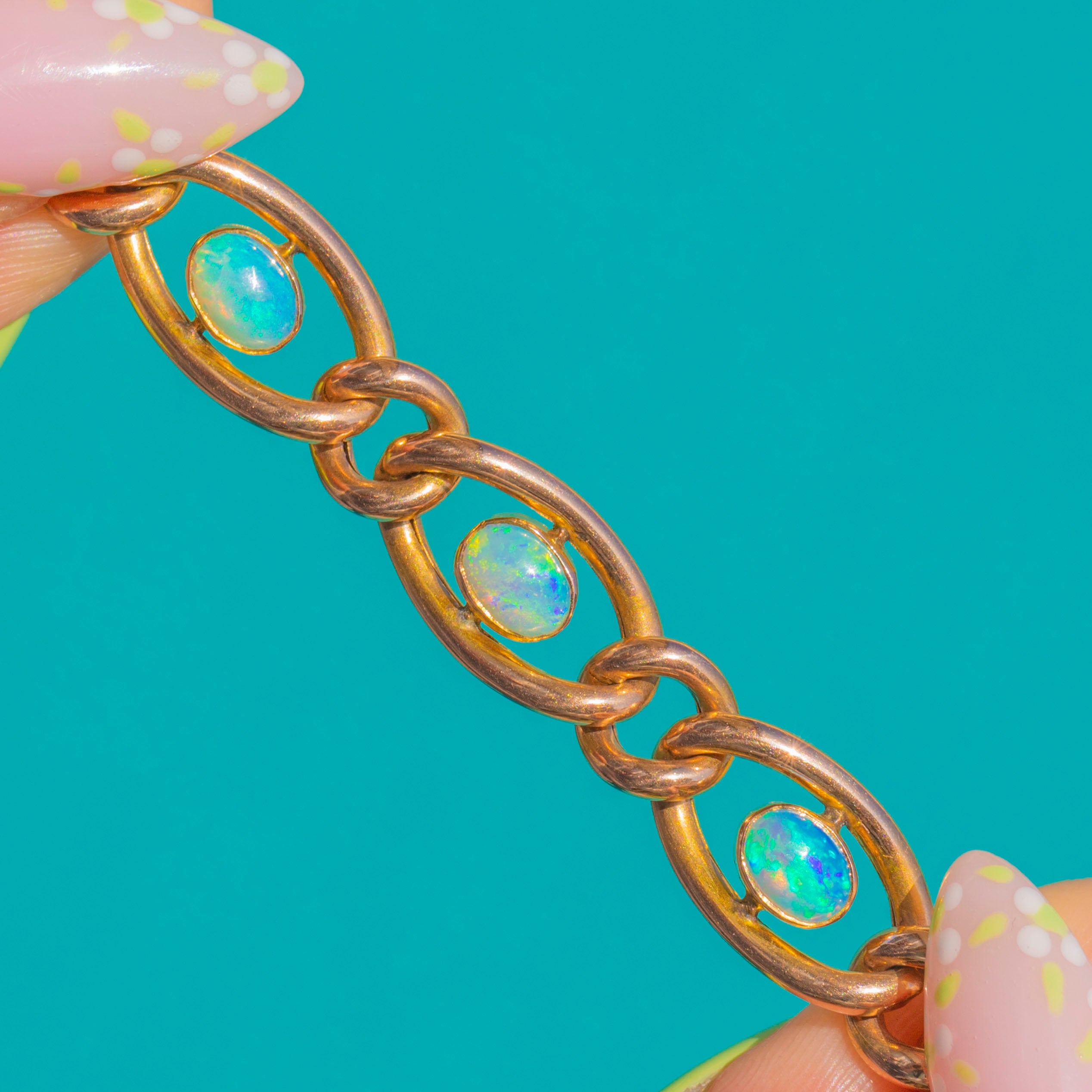 EXCELLENT: The Opals are bright and well-matched with no obvious chips or abrasions. The Gold links, bezels and padlock show only light surface scratches and a gentle, even patina, with settings secure throughout.