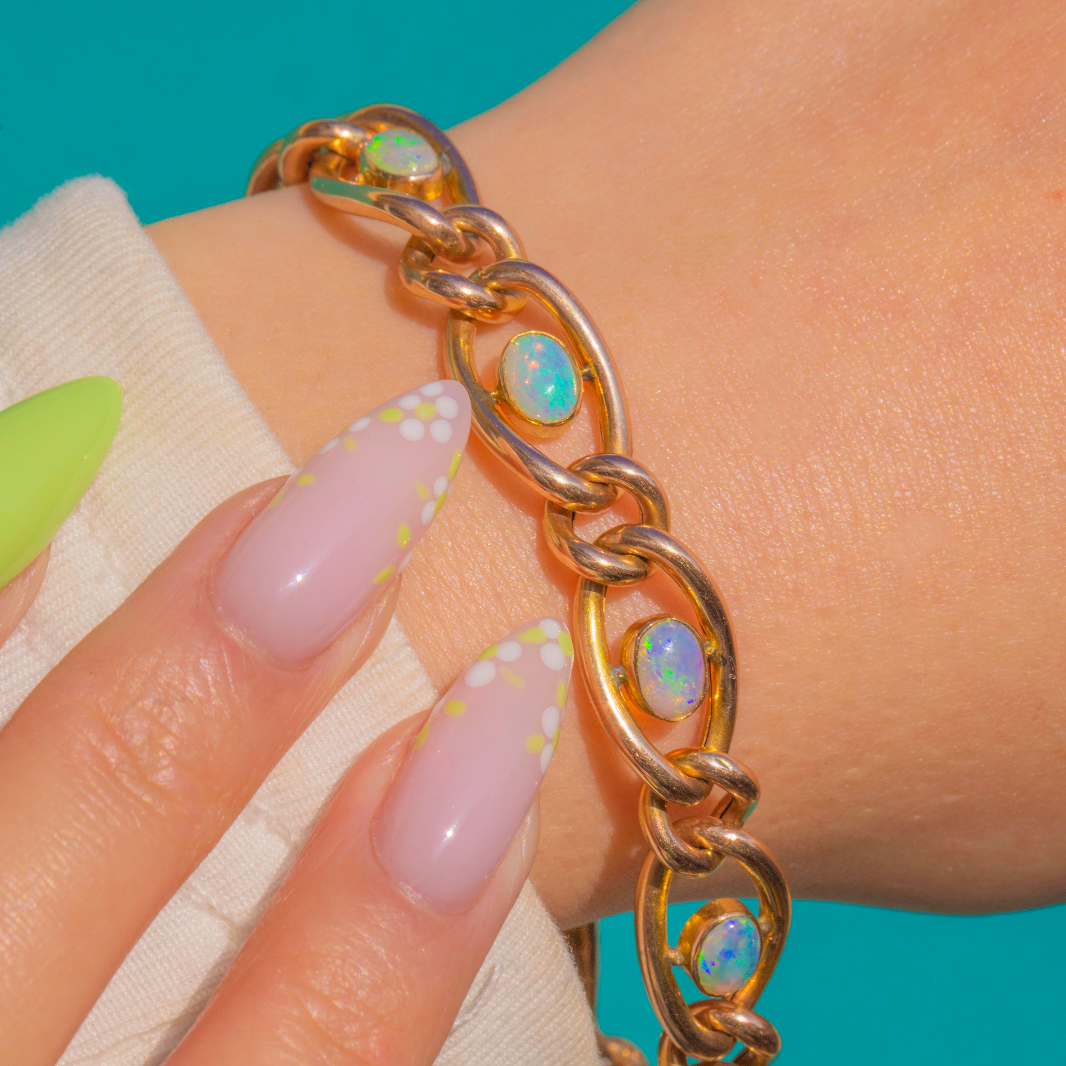 Stamped “9C” to each link, with “B&S” and “9ct” to the padlock, this bracelet captures the timeless appeal of antique Gold and the poetic allure of Opal in one chic, harmonious design.